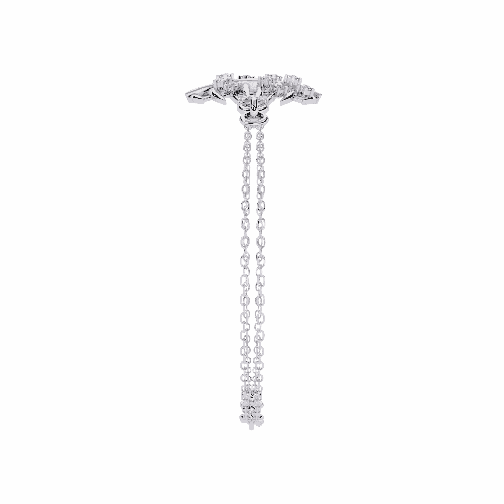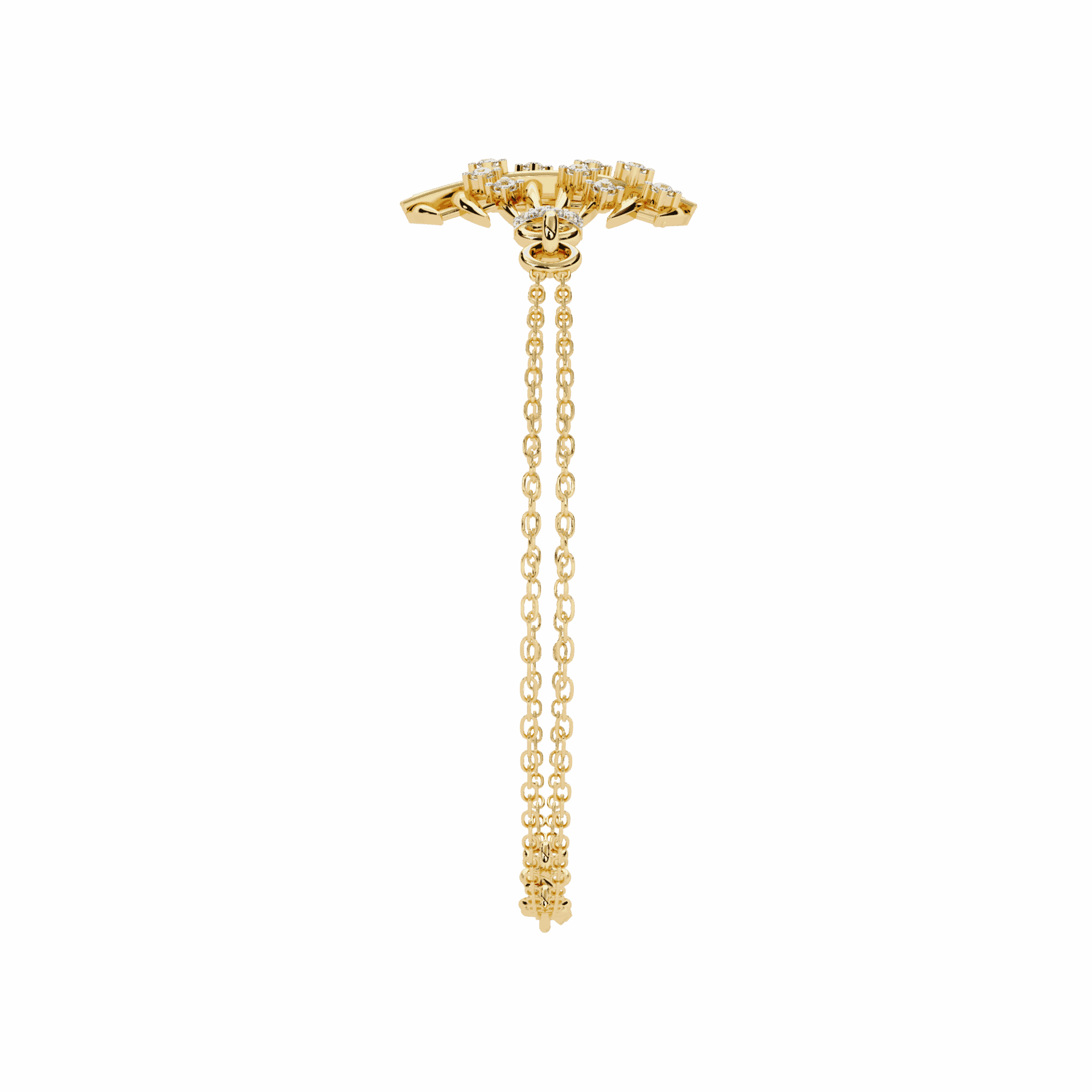 13 round lab-grown diamonds layered in clusters, forming a soft dome that glimmers from every angle. It’s three-dimensional sparkle on a minimal scale – raised, not flat, but still subtle.