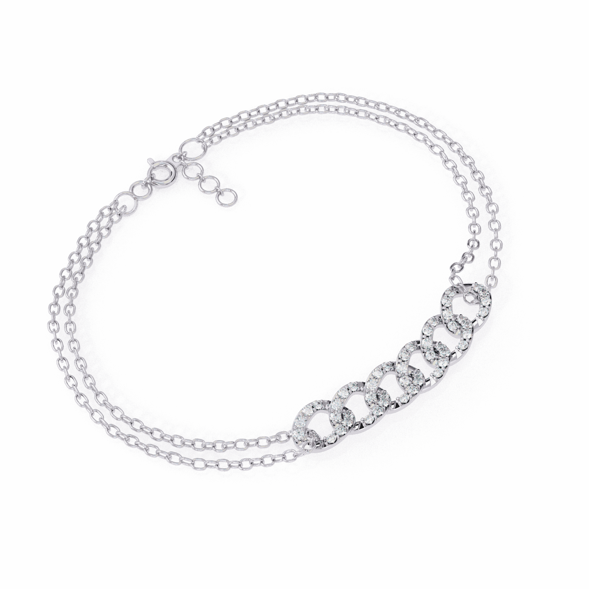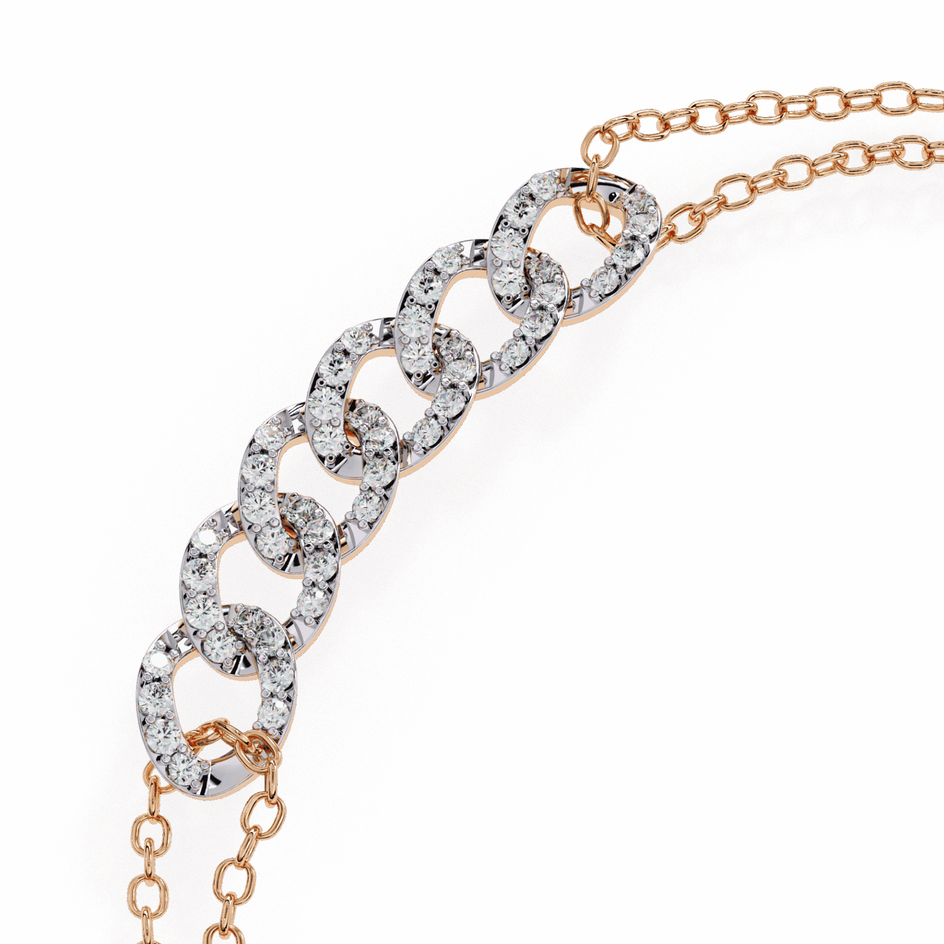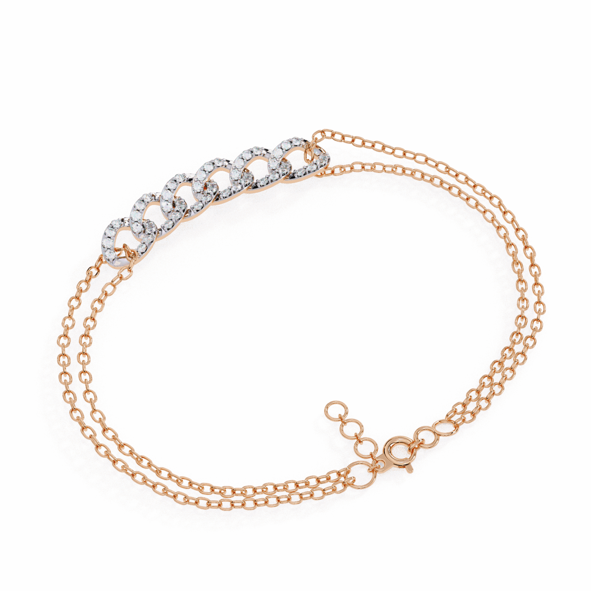 This bracelet has 48 round lab-grown diamonds arranged in circular clusters, connected by dual gold chains. The clusters catch light as you move – enough to notice, not enough to overwhelm.