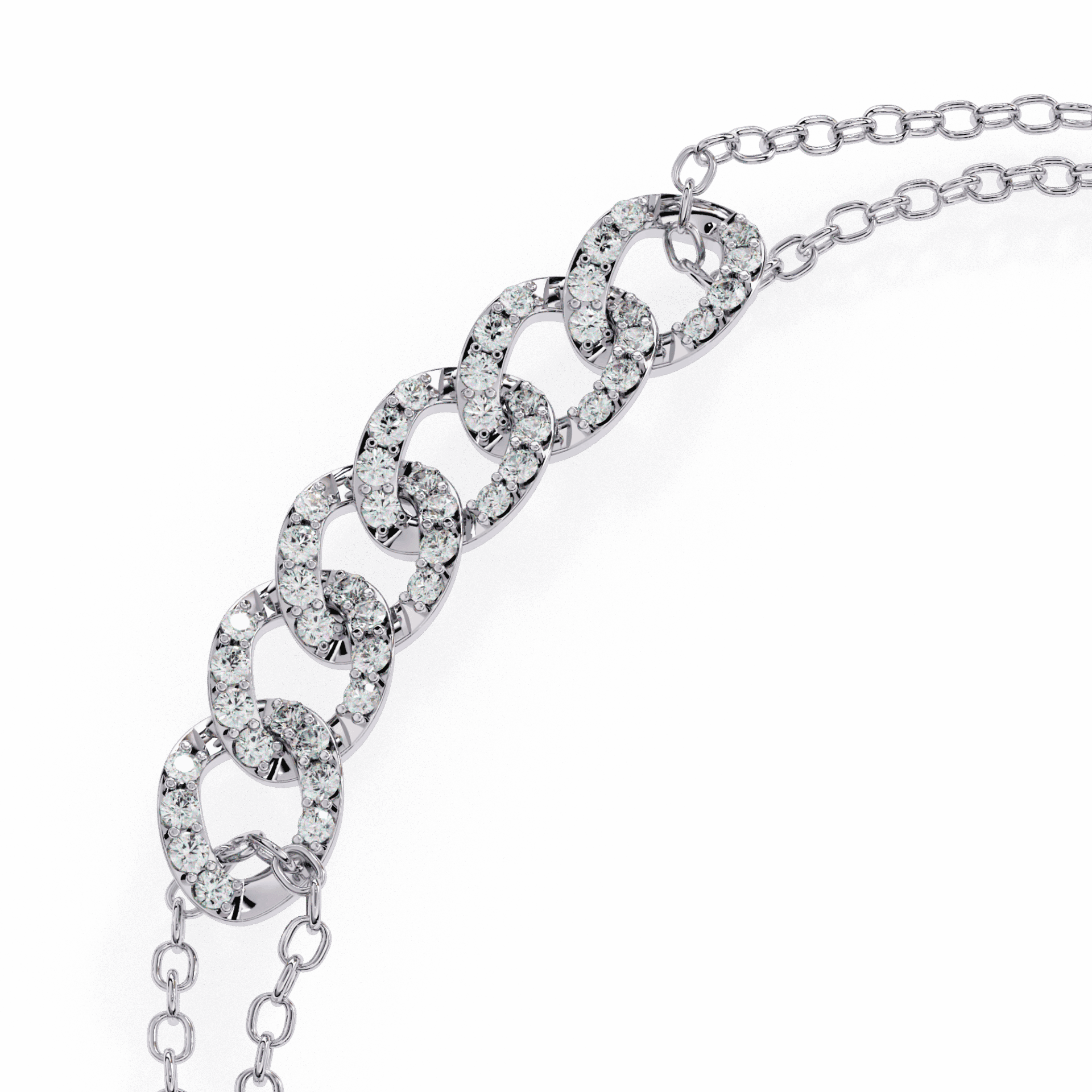 Round diamonds arranged in circular clusters on dual chains. Subtle sparkle that moves from coffee runs to cocktail hours without trying.