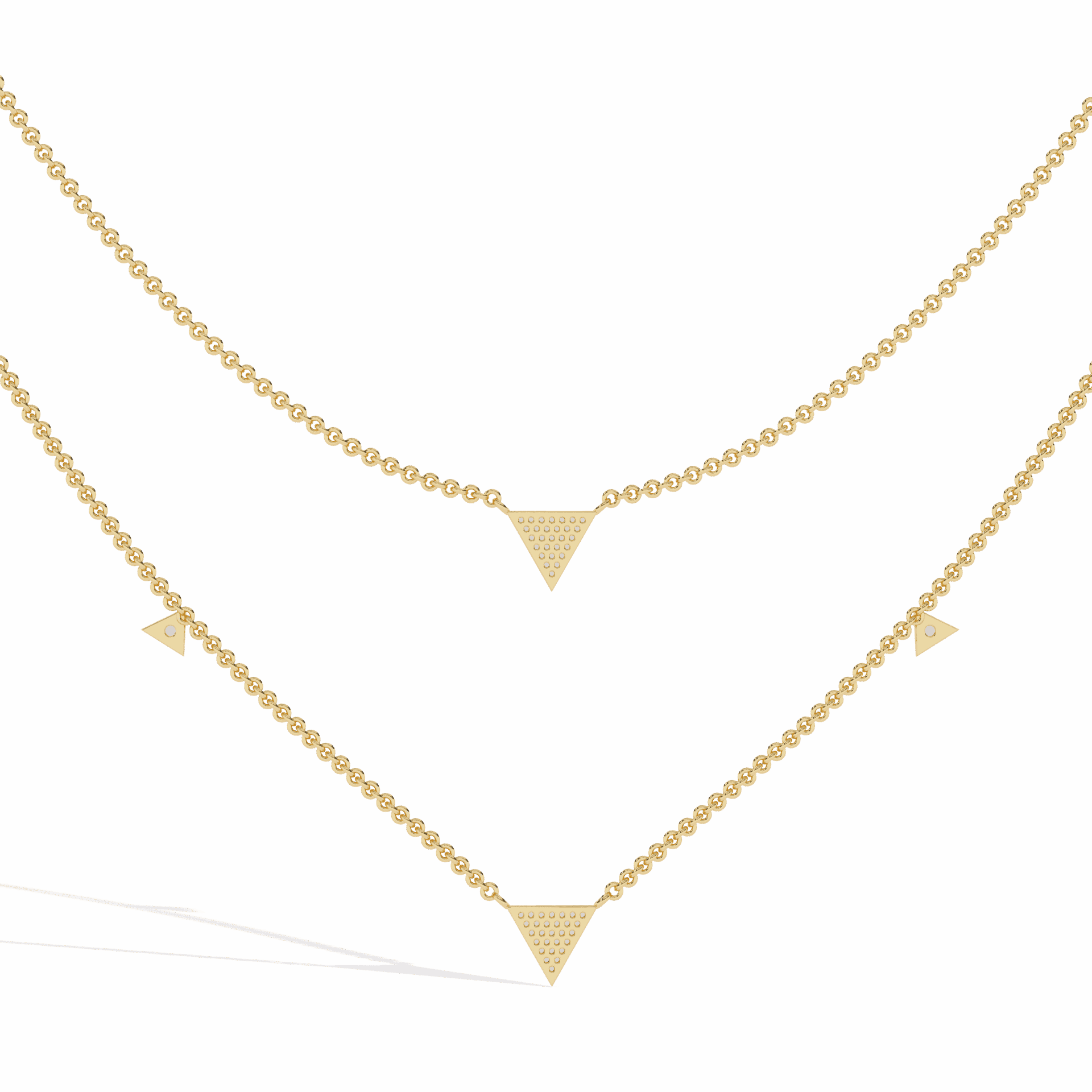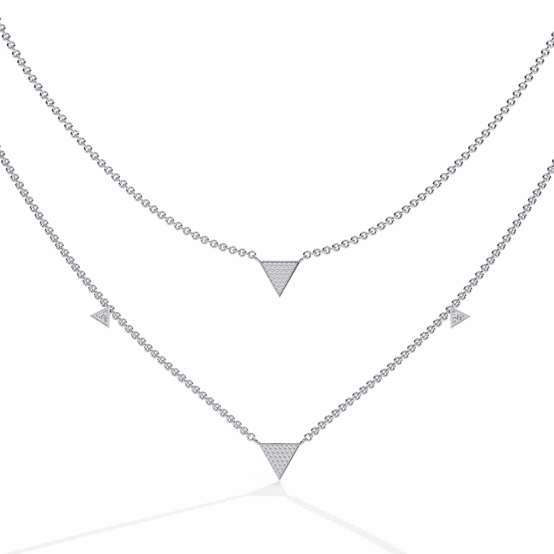 62 round diamonds forming two interconnected triangles. Geometric elegance with edge.