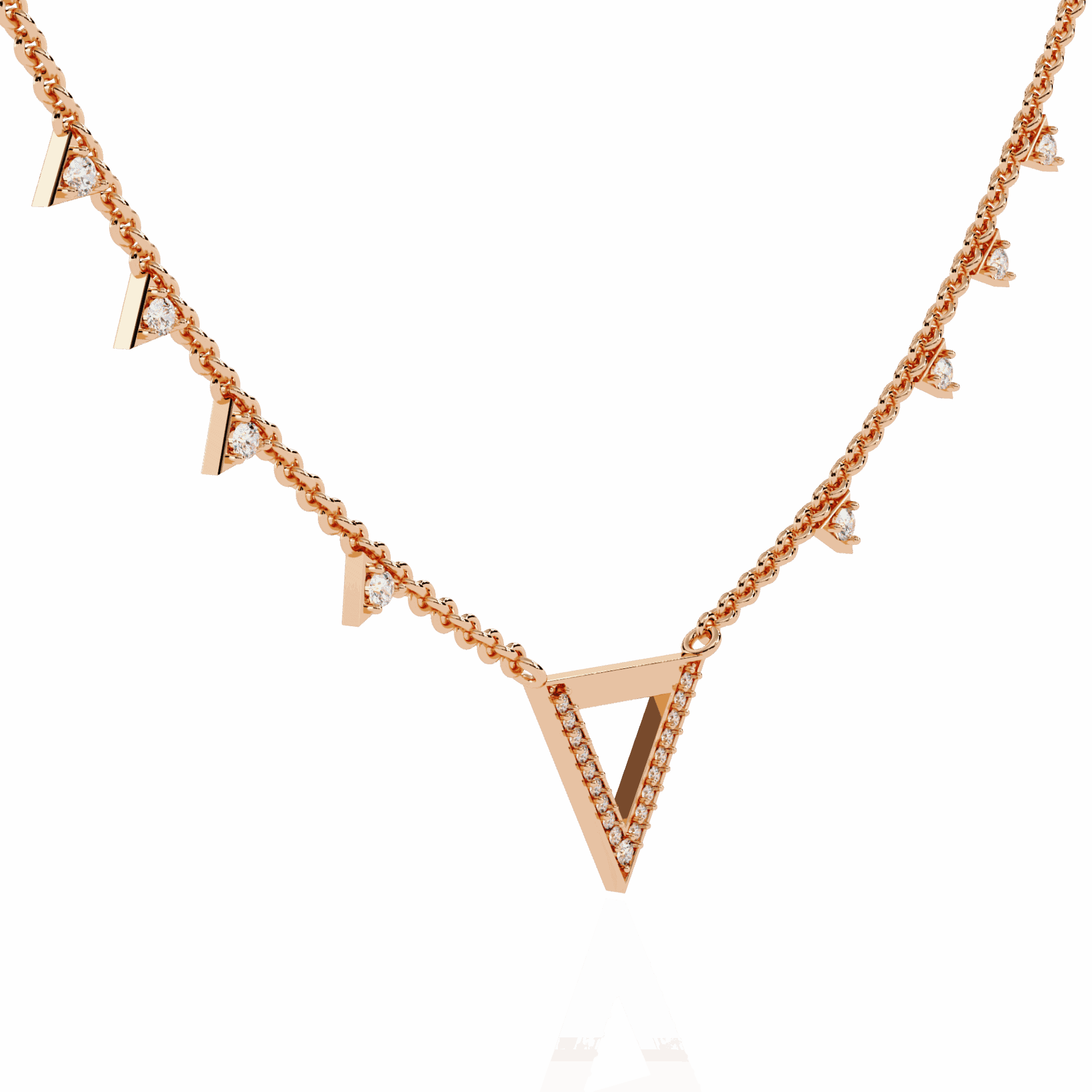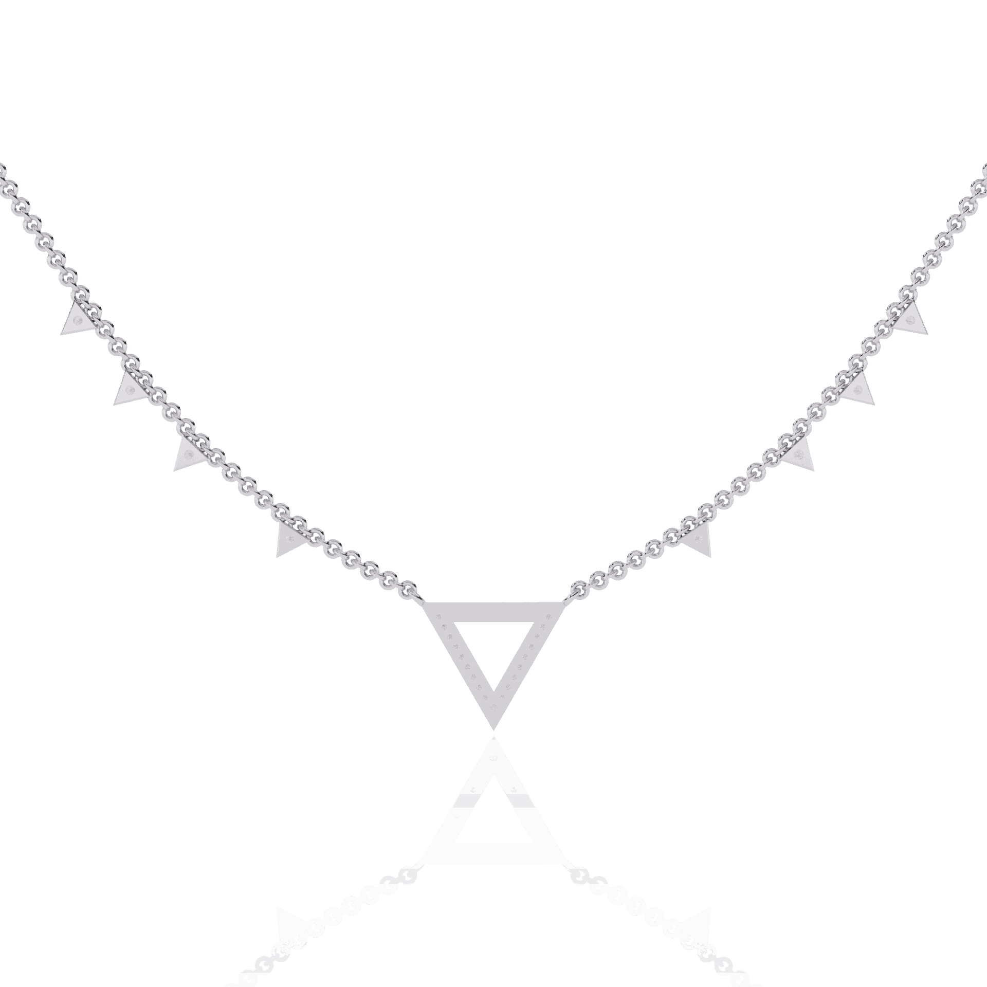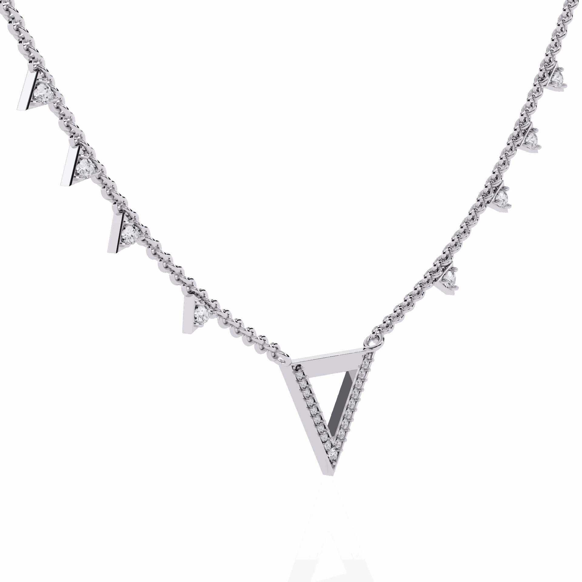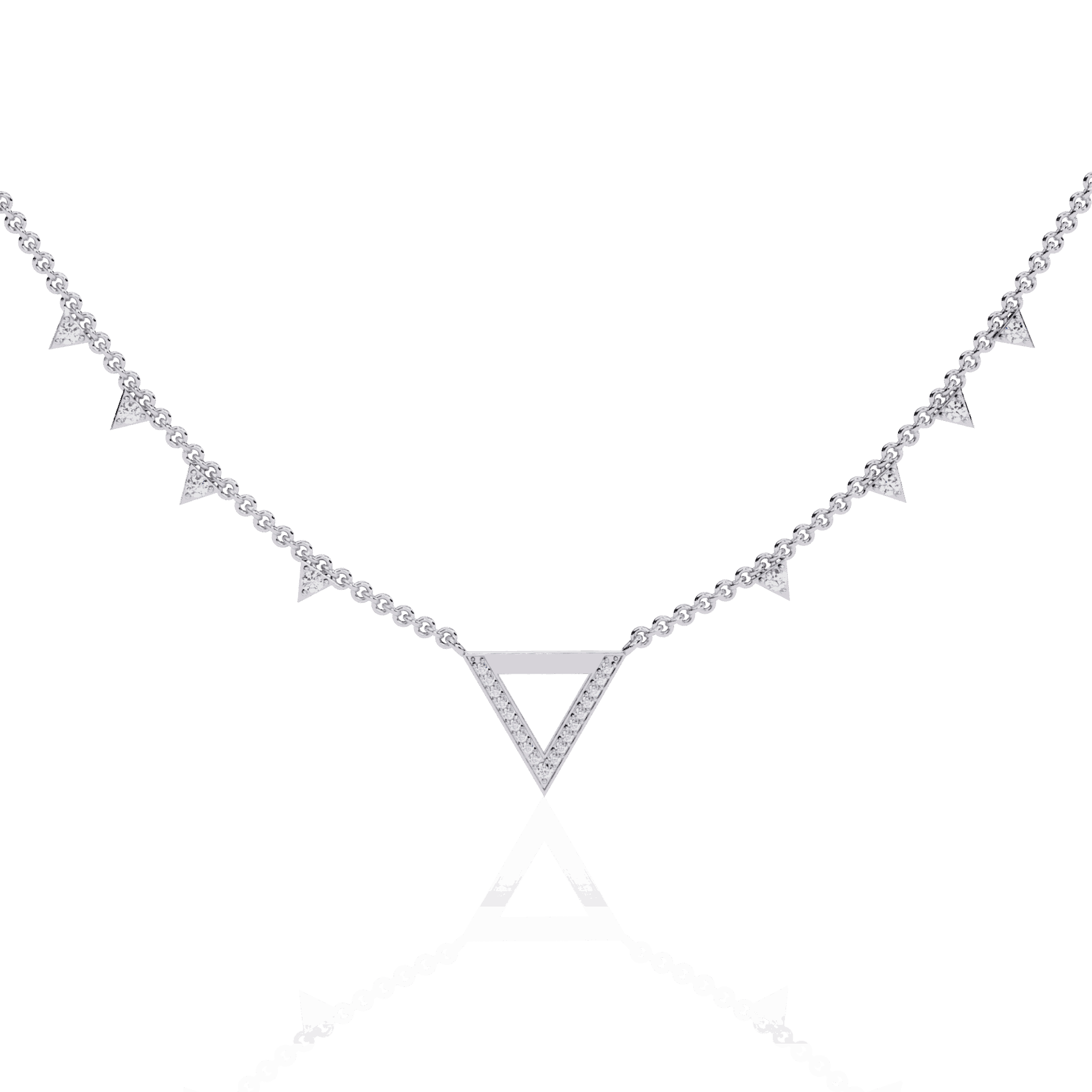 27 round lab-grown diamonds forming triangular geometric accents along the chain. The angular shapes create visual interest while the diamonds add sparkle – sharp lines with soft shimmer.