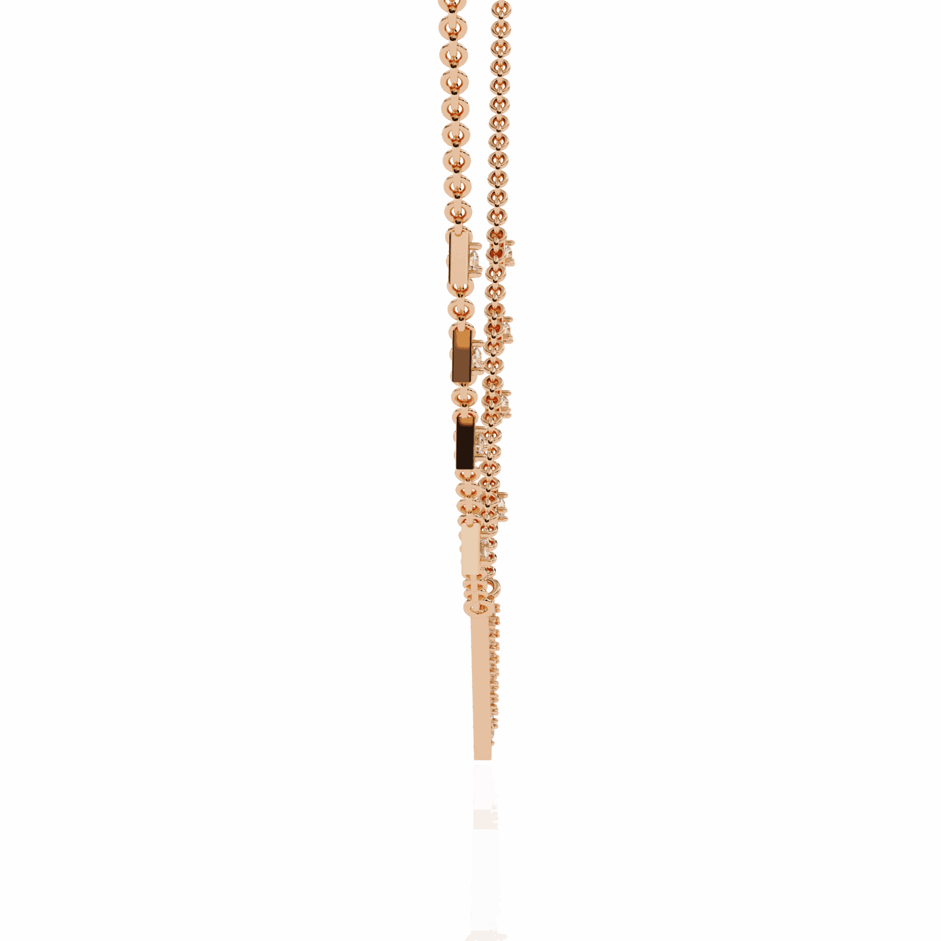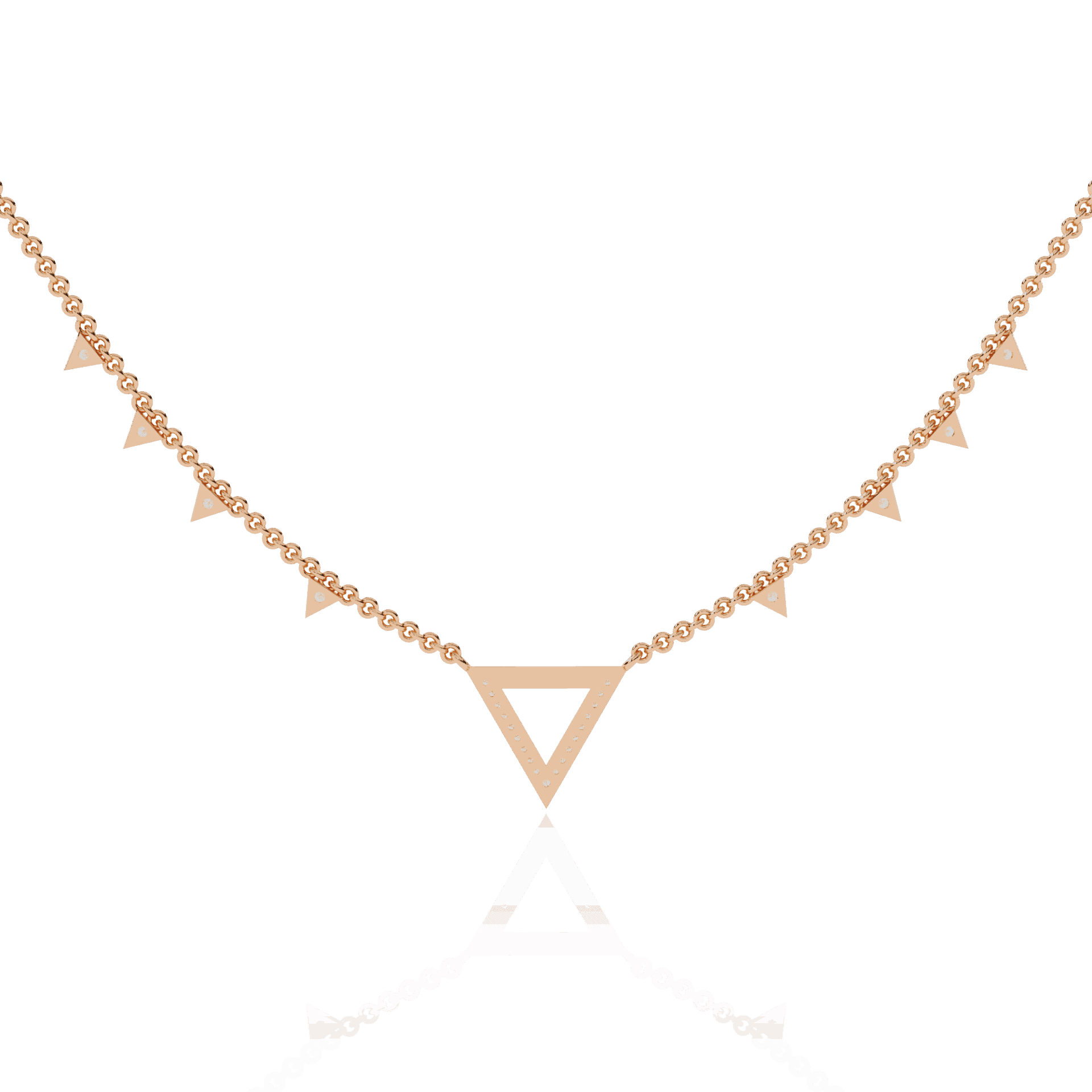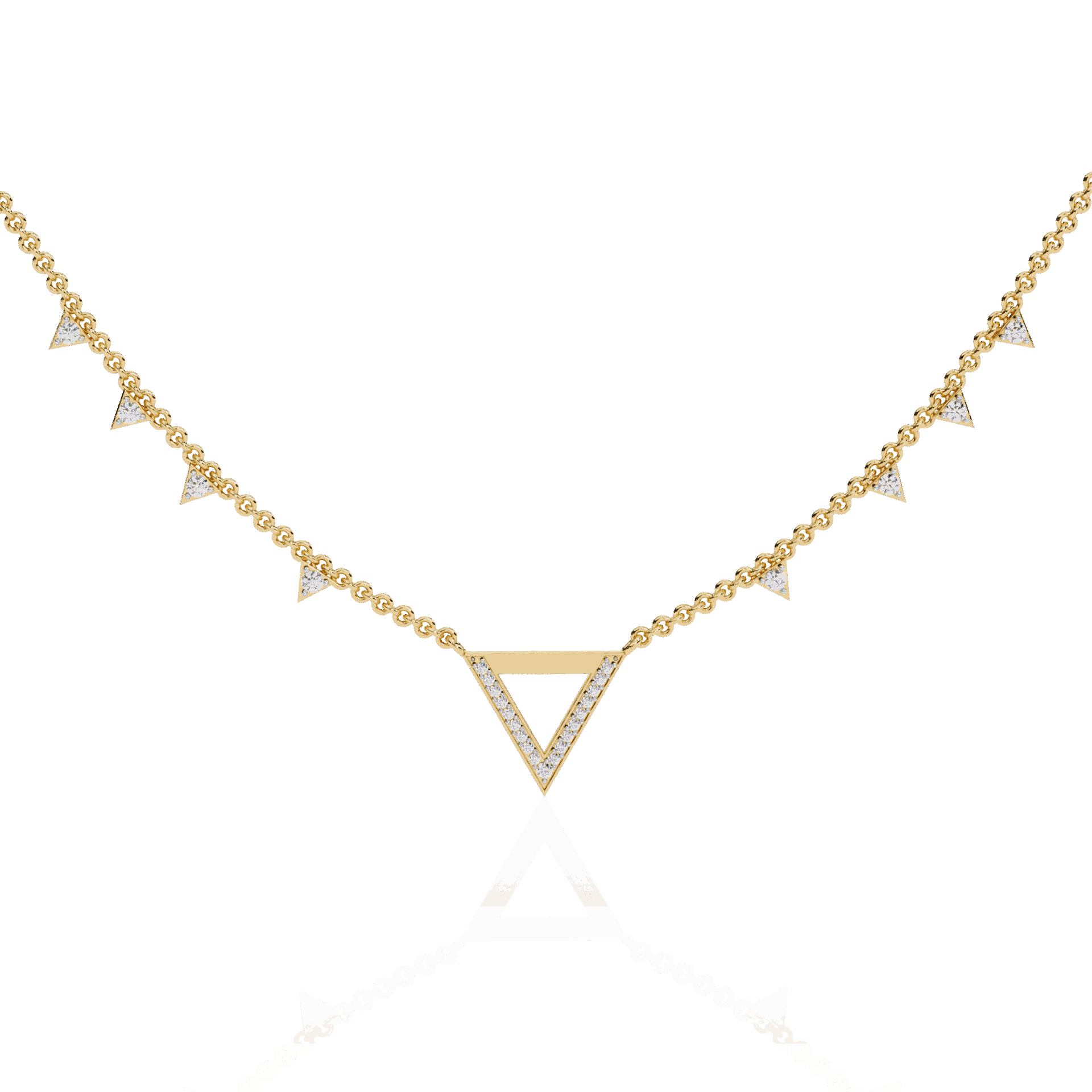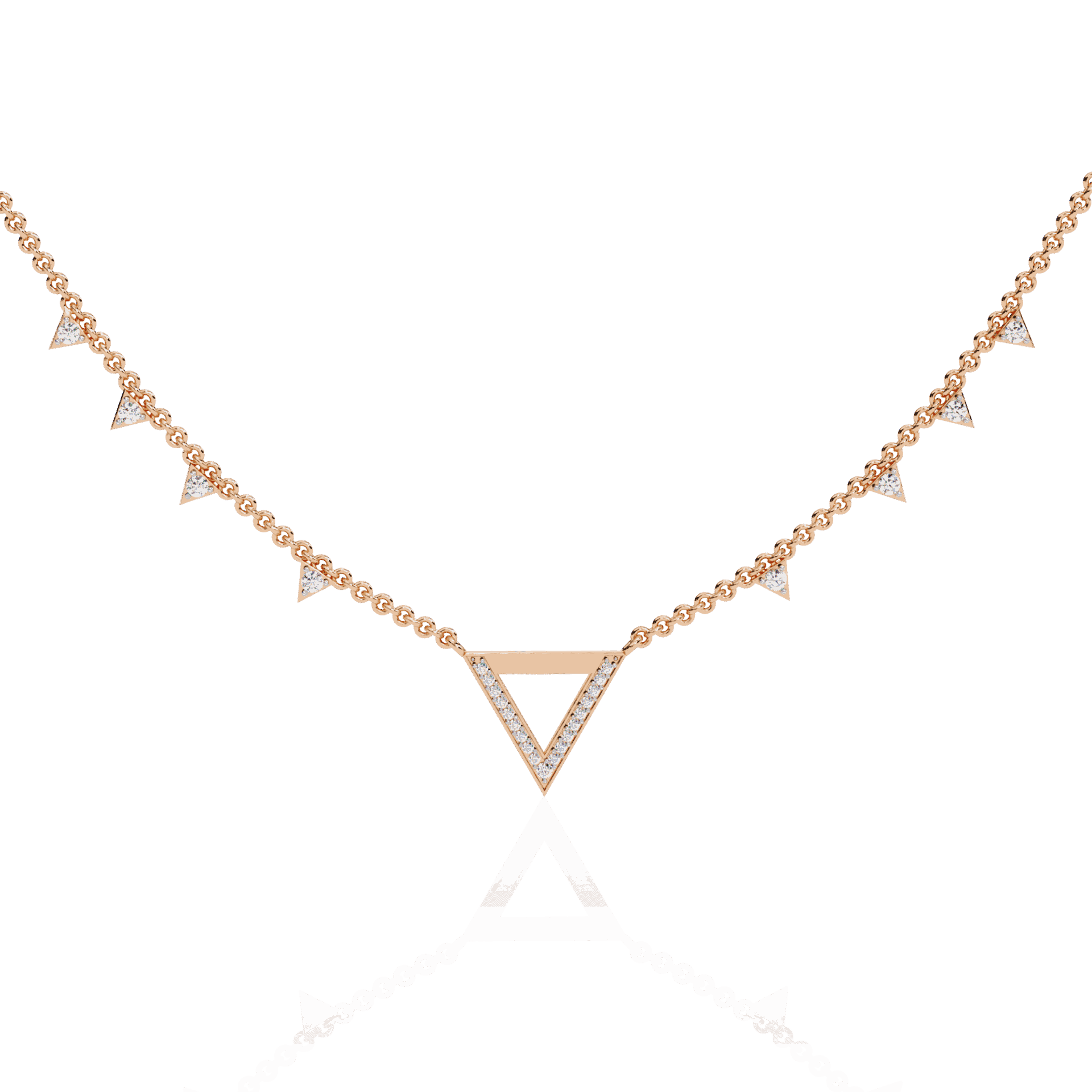 27 round lab-grown diamonds forming triangular geometric accents along the chain. The angular shapes create visual interest while the diamonds add sparkle – sharp lines with soft shimmer.