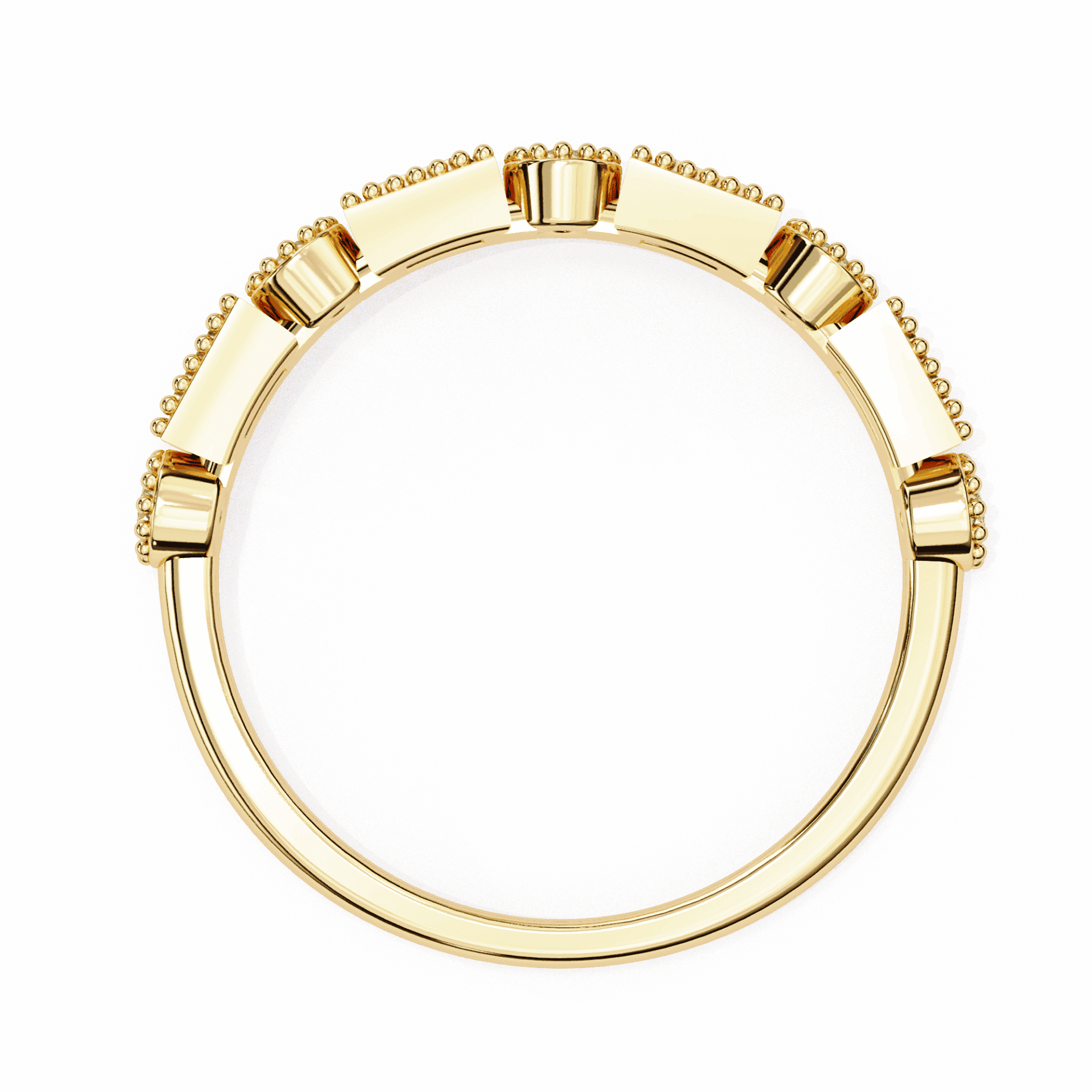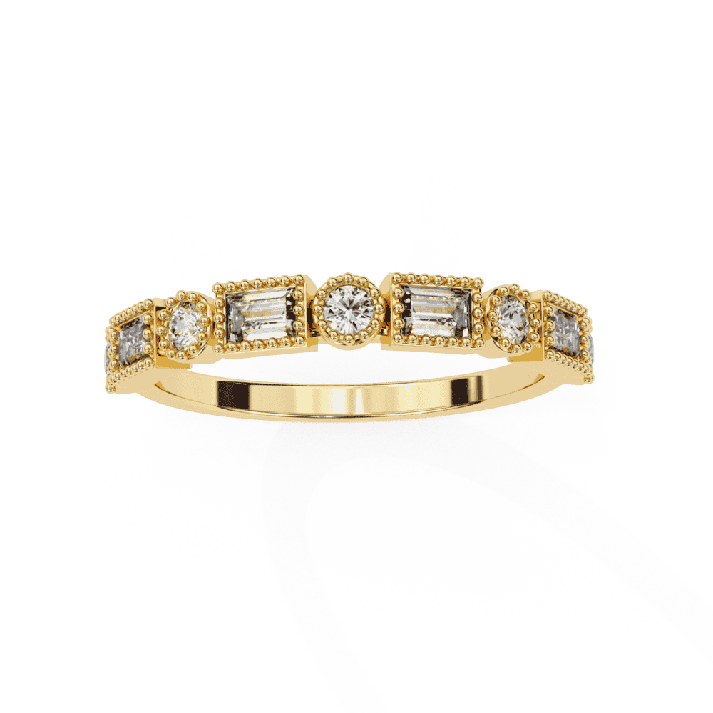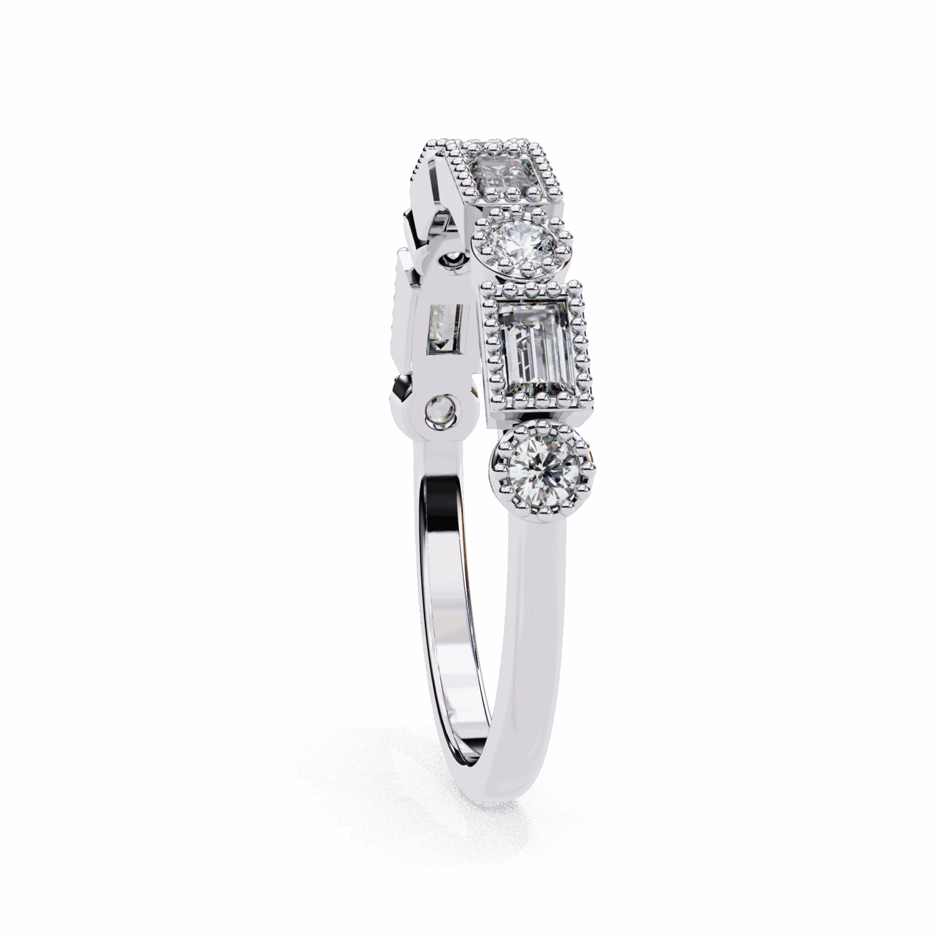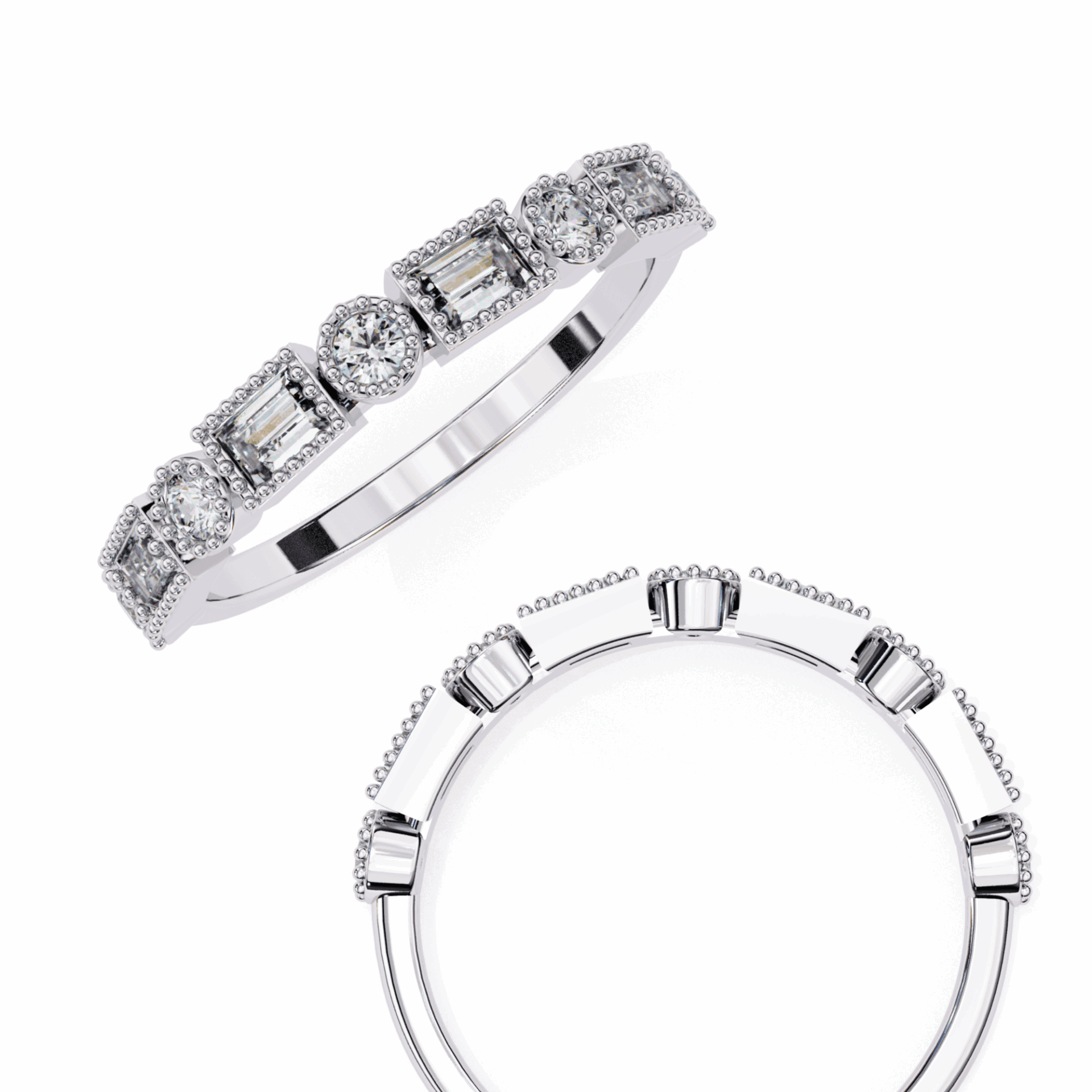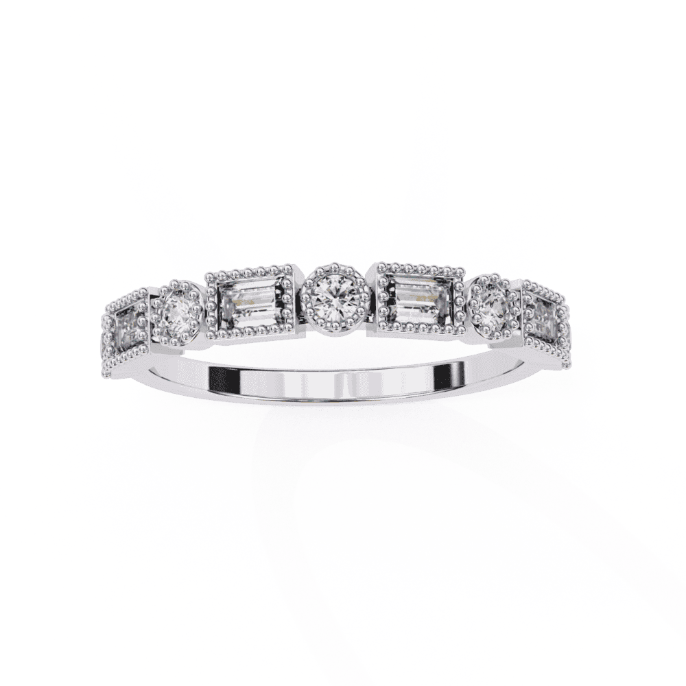 9 lab-grown diamonds – baguette and round cuts – totaling 0.34 carats (also known as 35 cents in trade) in an eternity band. Two cuts create visual rhythm as the band circles your finger.