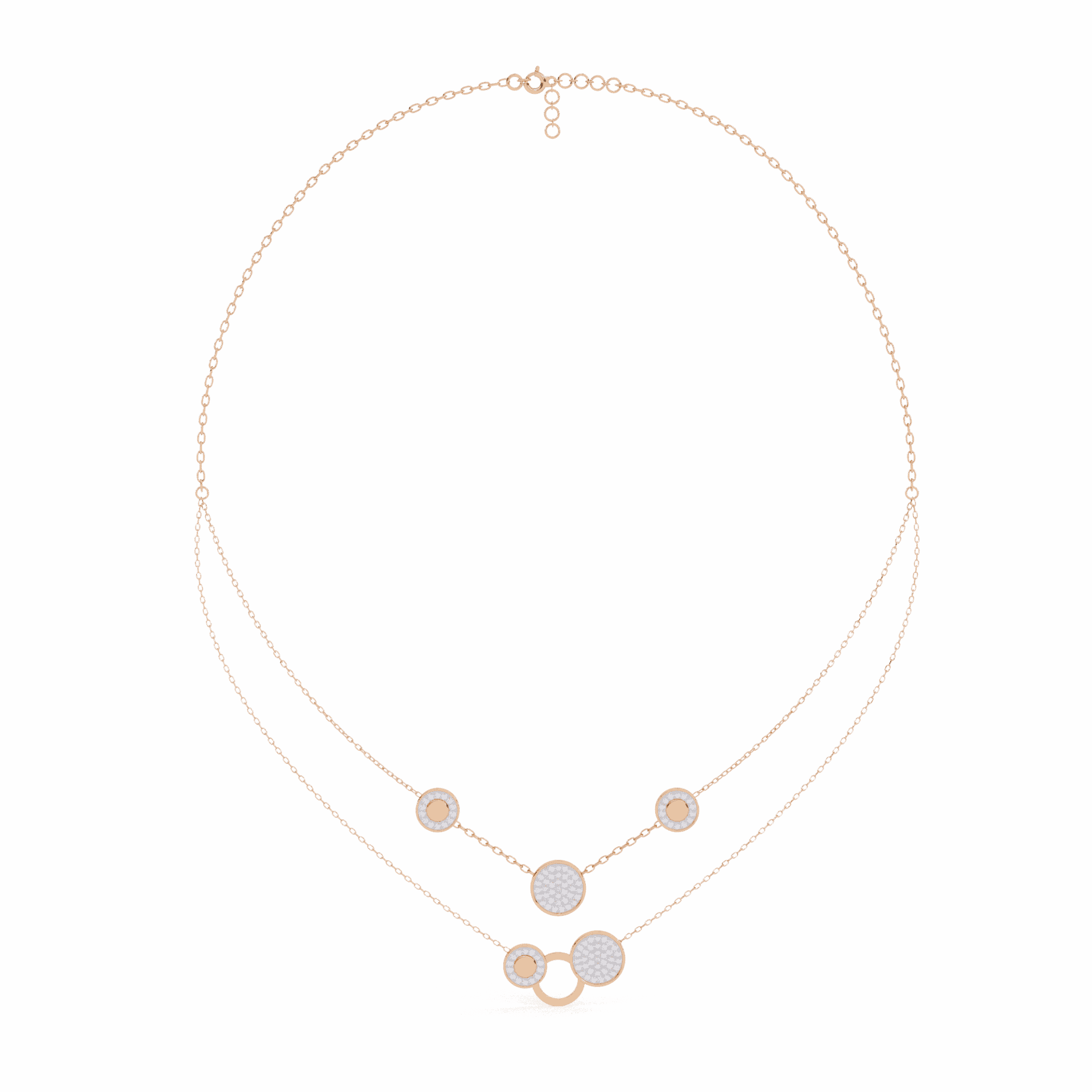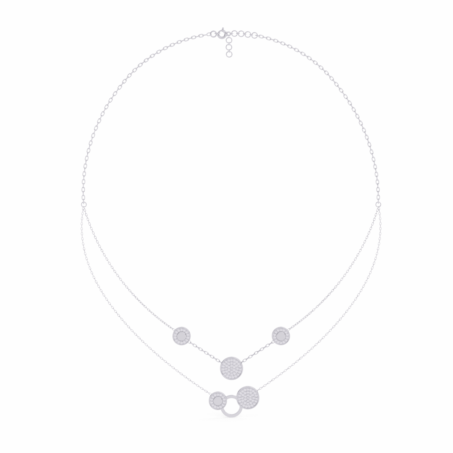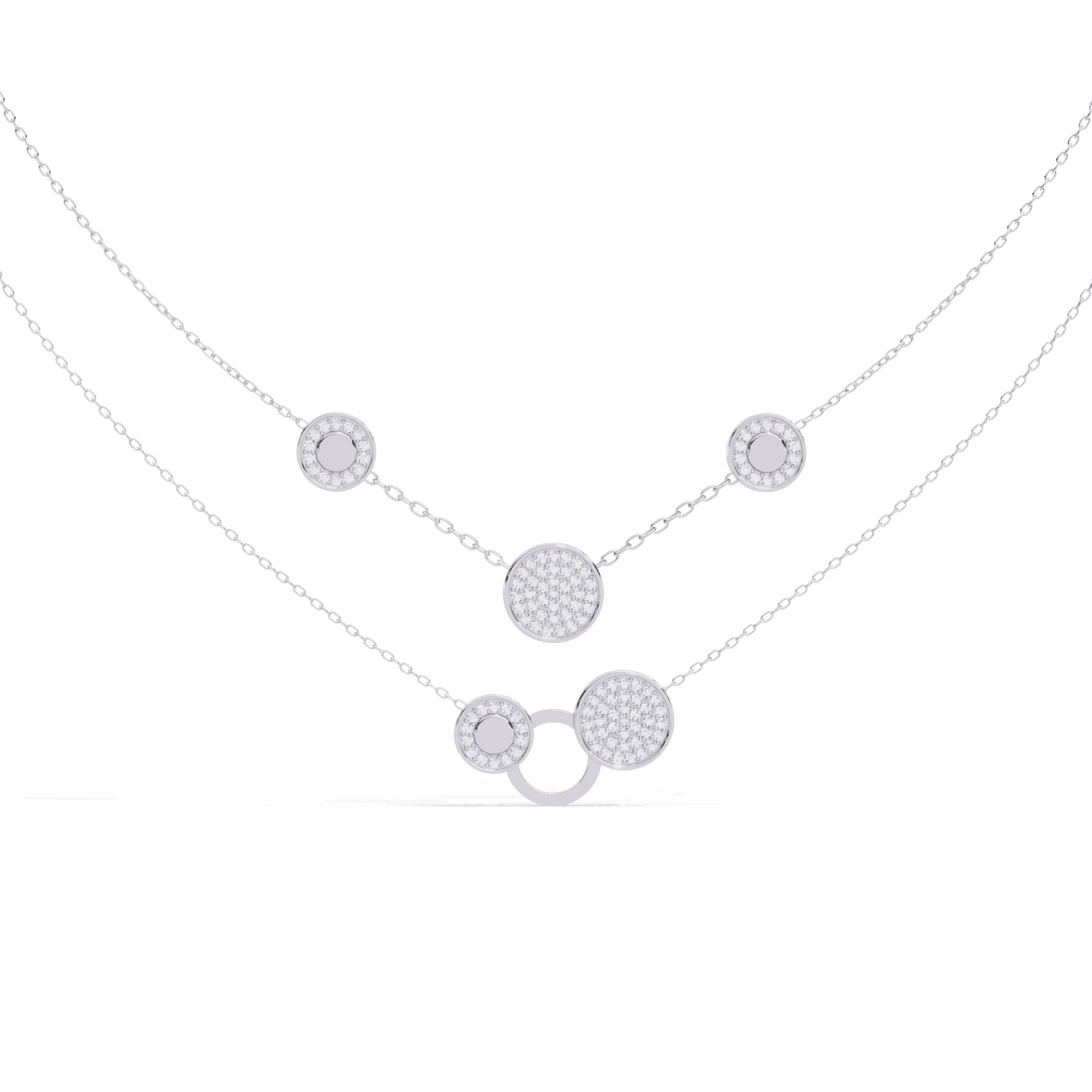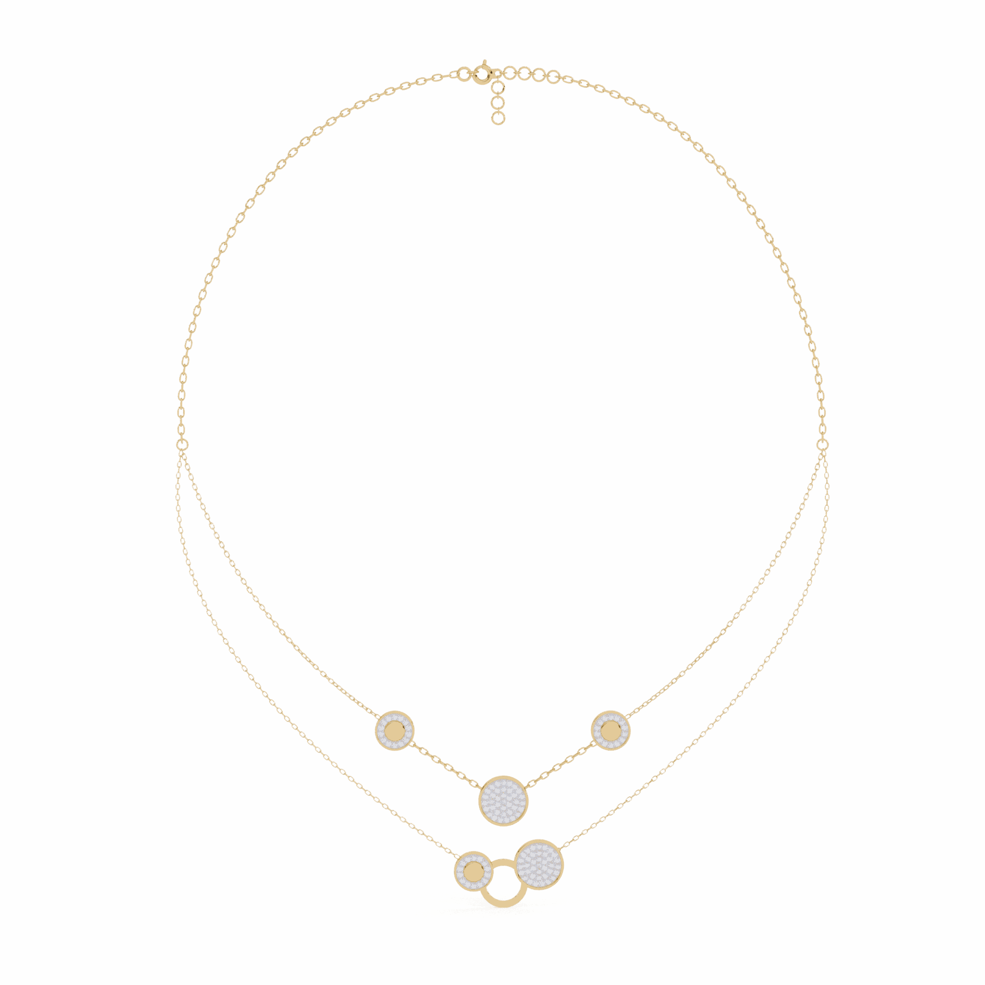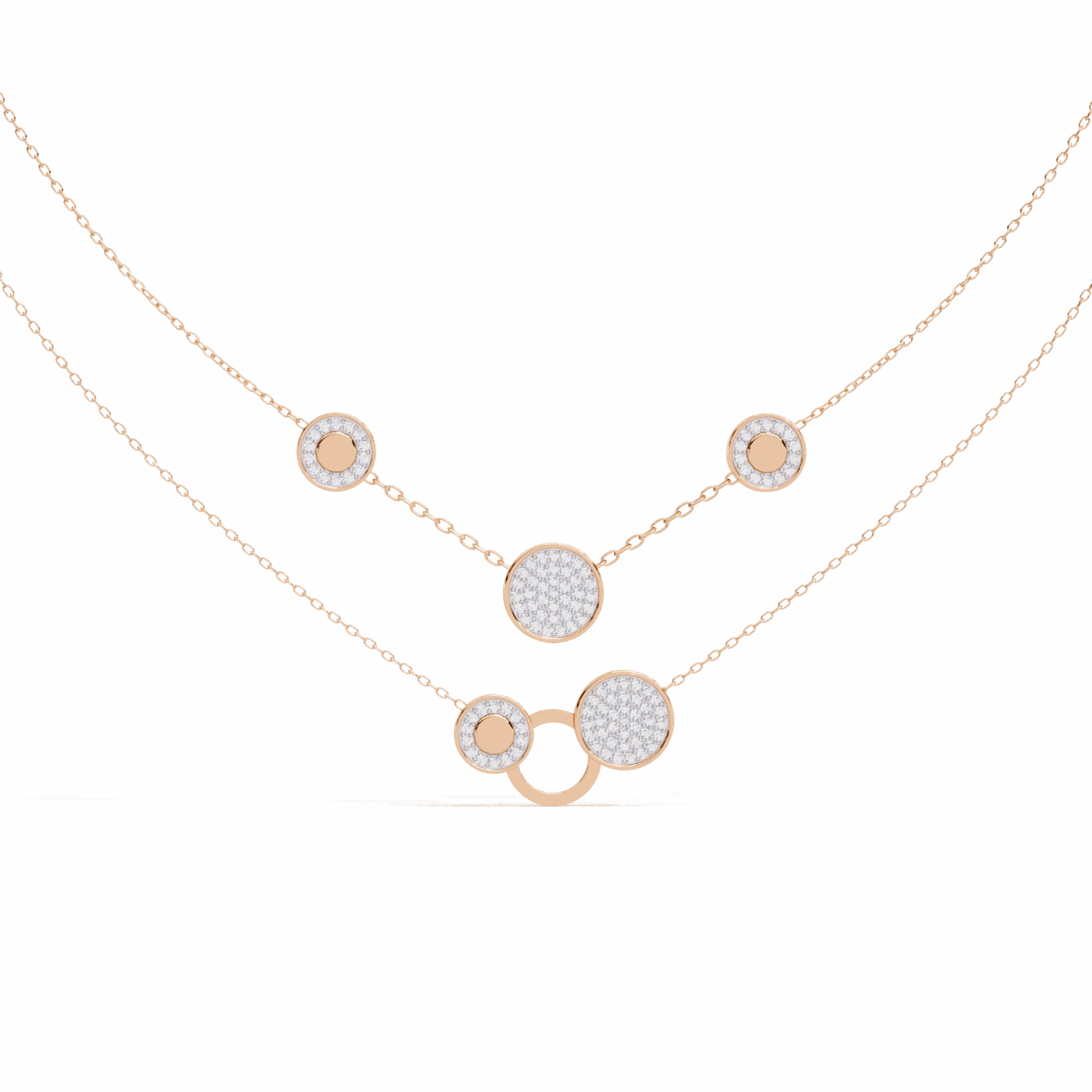 A dual-chain design dotted with pavé diamond circles orbiting a central open ring. The chains layer naturally, creating depth and movement that catches light from every angle.