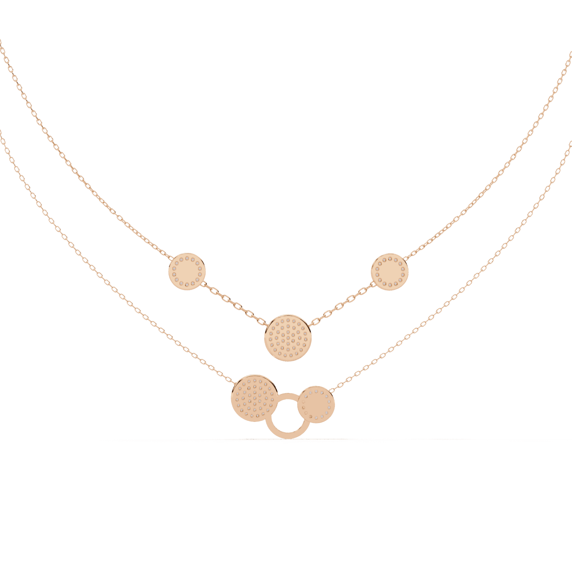 Two polished chains dotted with pavé diamond circles and a central open ring. Designed for effortless layering.