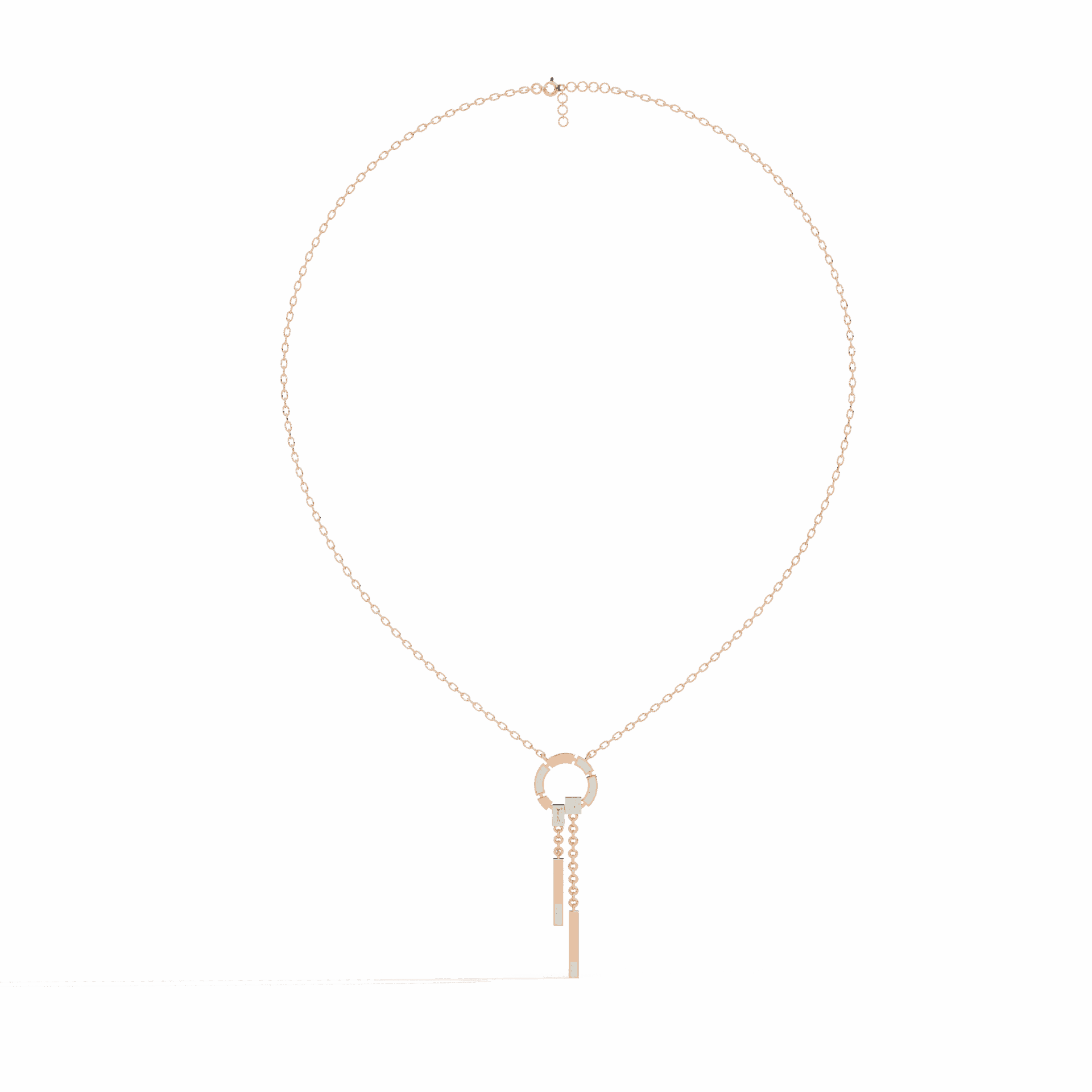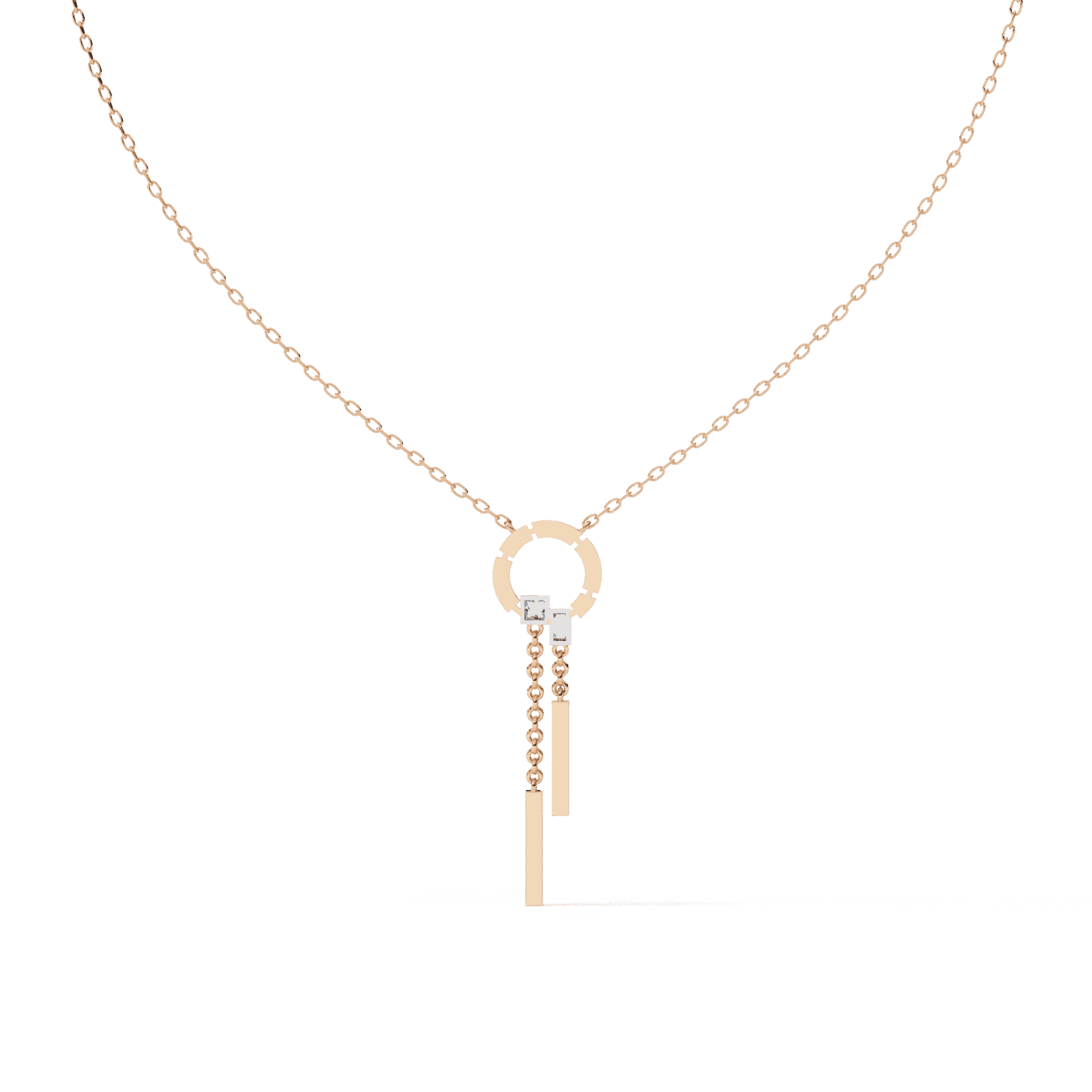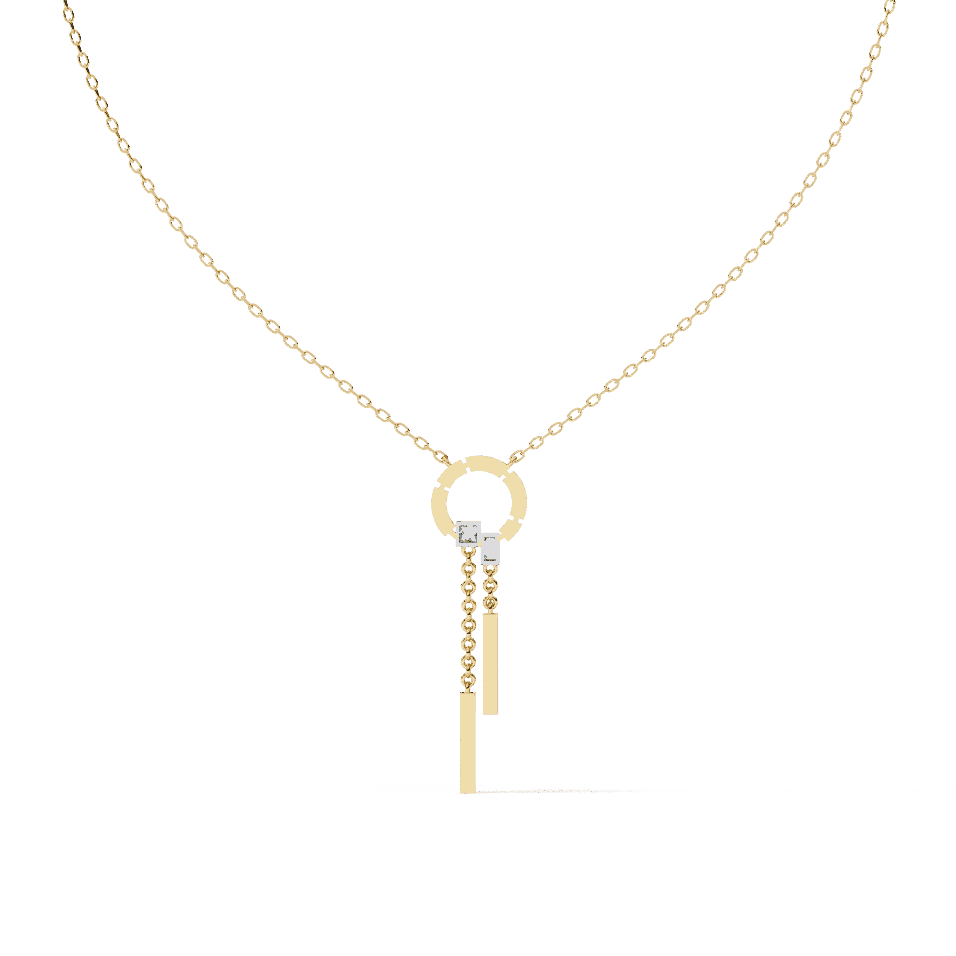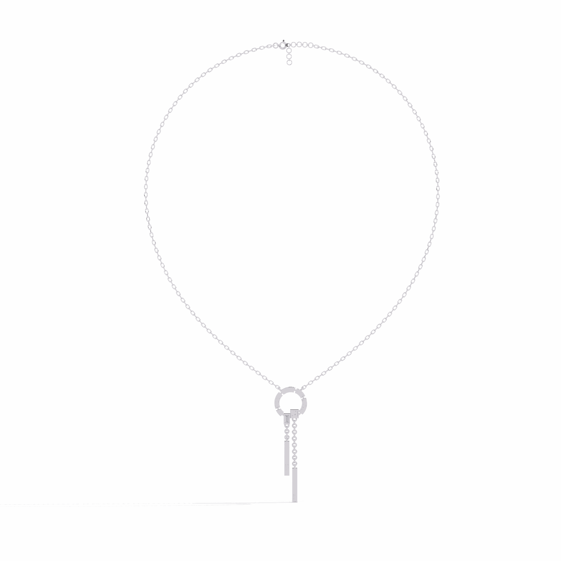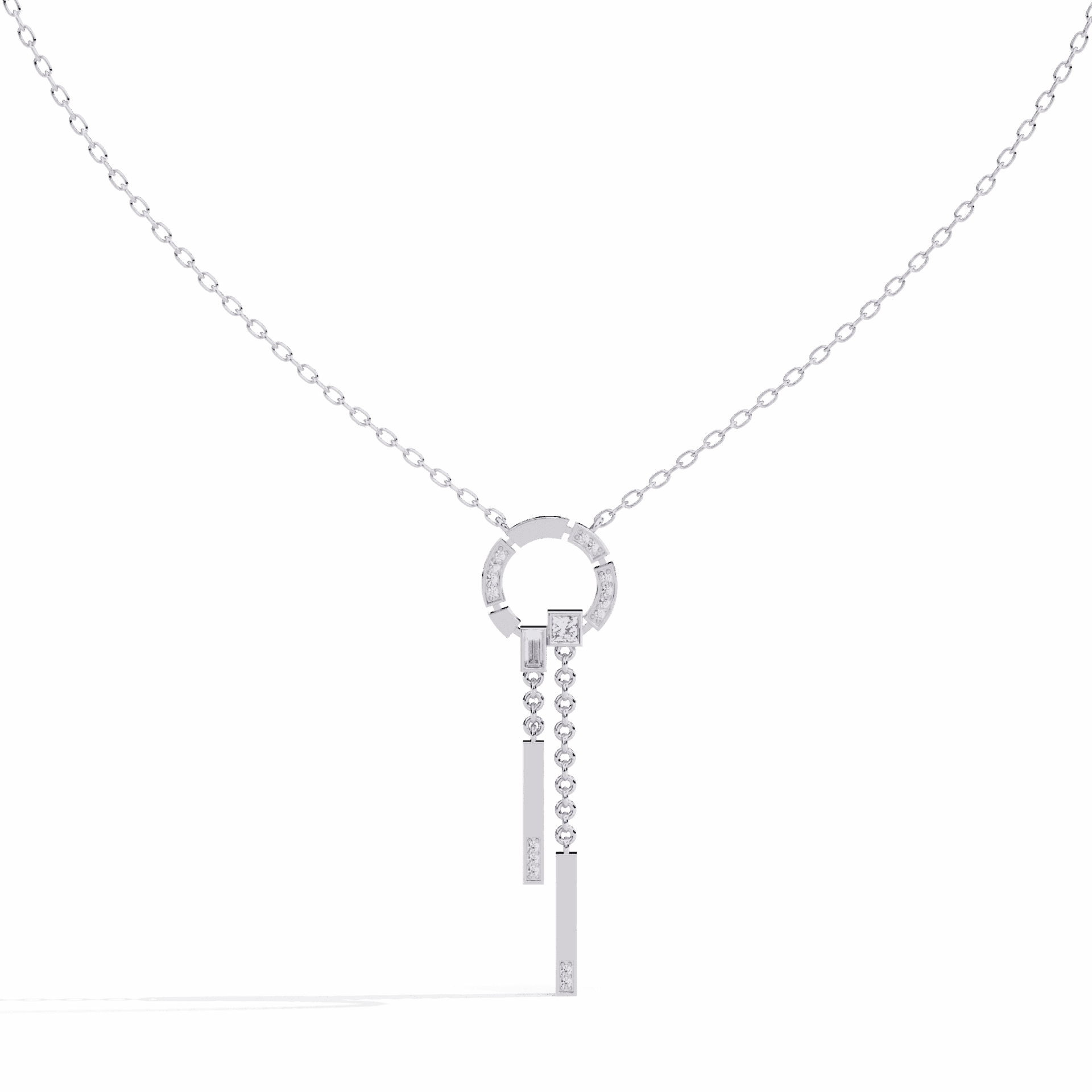 17 lab-grown diamonds – round, baguette, and princess cuts – aligned in a sleek vertical drop. The mix of cuts creates visual rhythm while the linear design elongates the neckline.