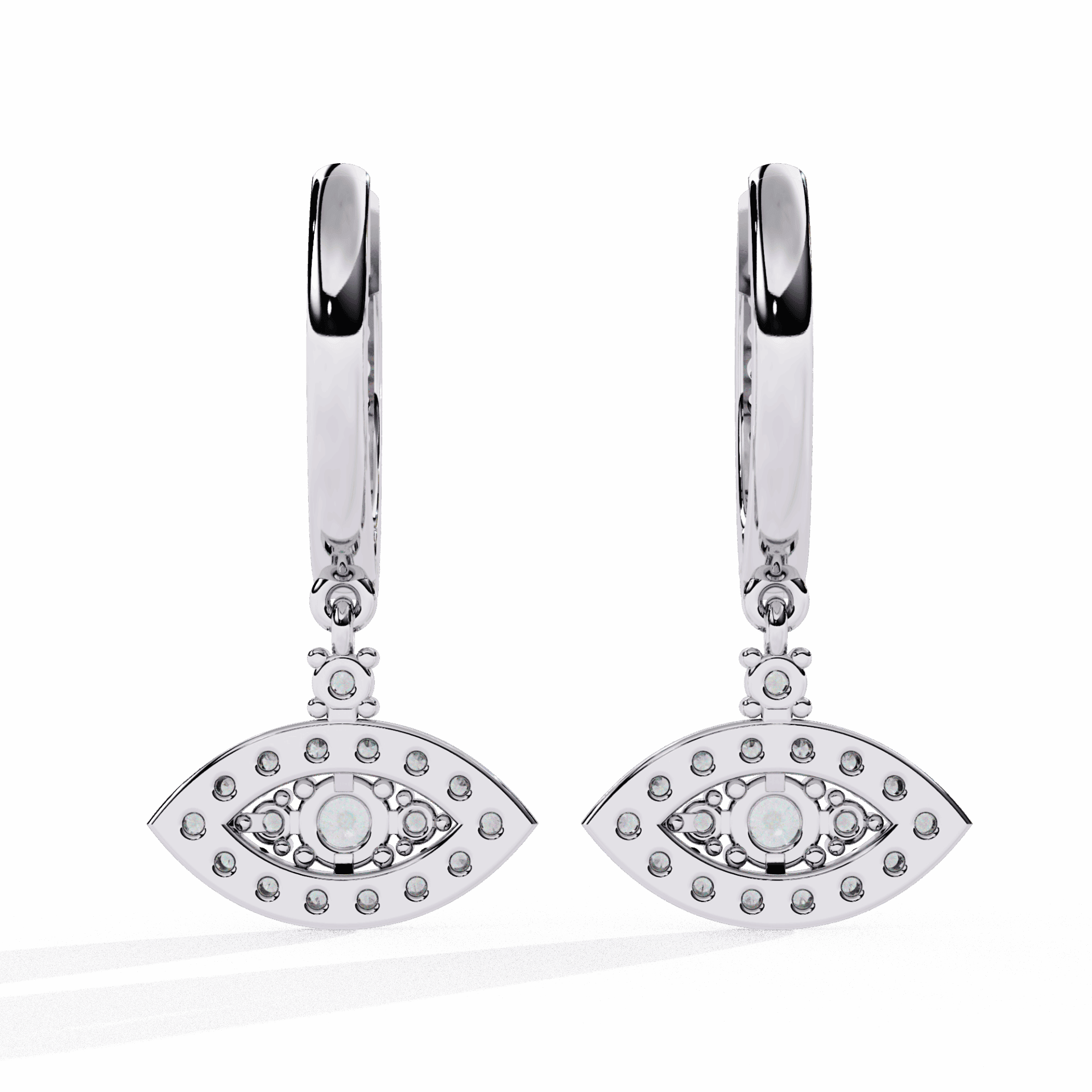 54 round diamonds in marquise-shaped halo drop settings. Elongating sparkle.