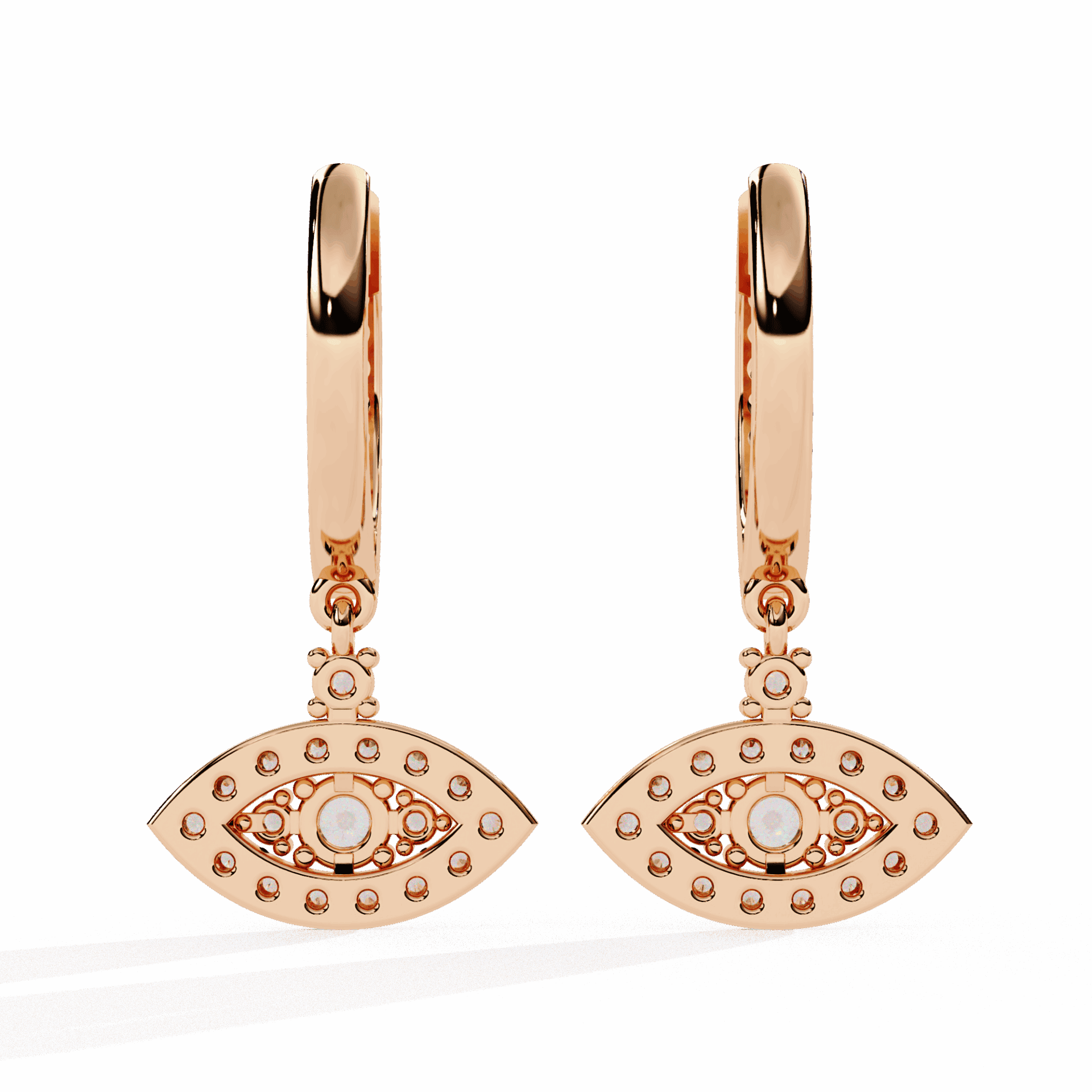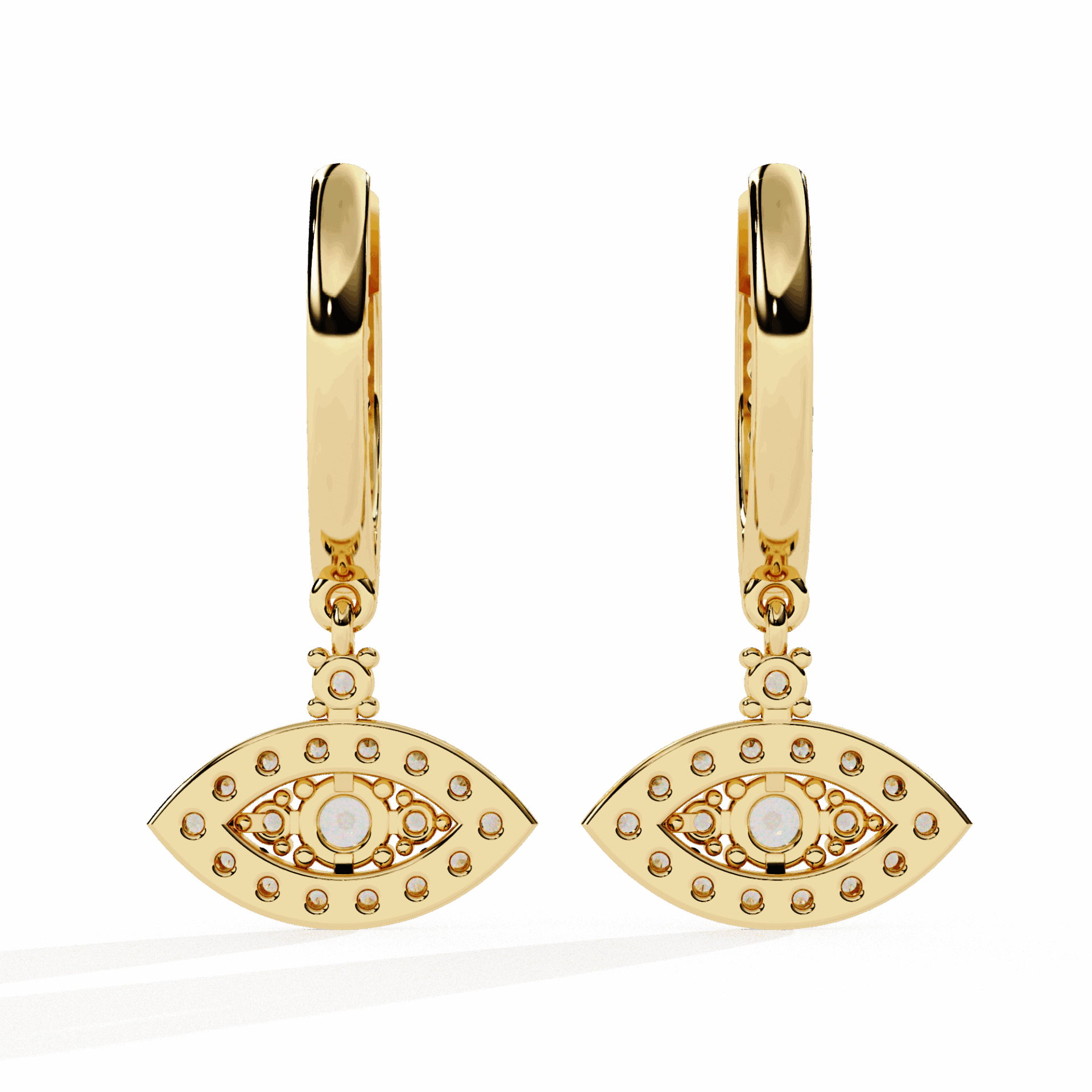54 round lab-grown diamonds totaling 0.49 carats in marquise-shaped halo drop settings. The elongated halo shape flatters while the drop adds movement.