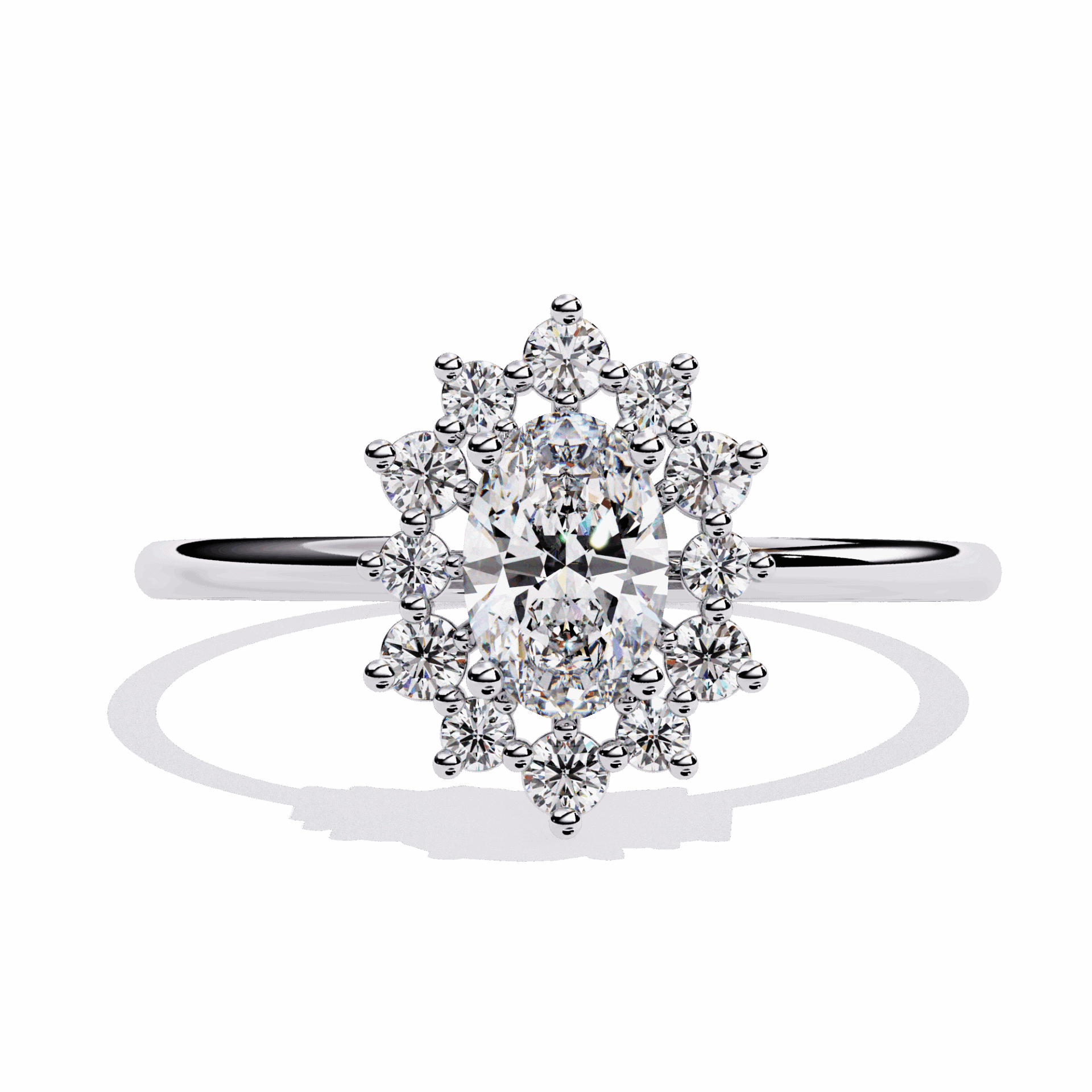 An oval-cut lab-grown diamond with 13 accent diamonds totaling 0.52 carats. Flattering shape with minimal setting at petite scale.
