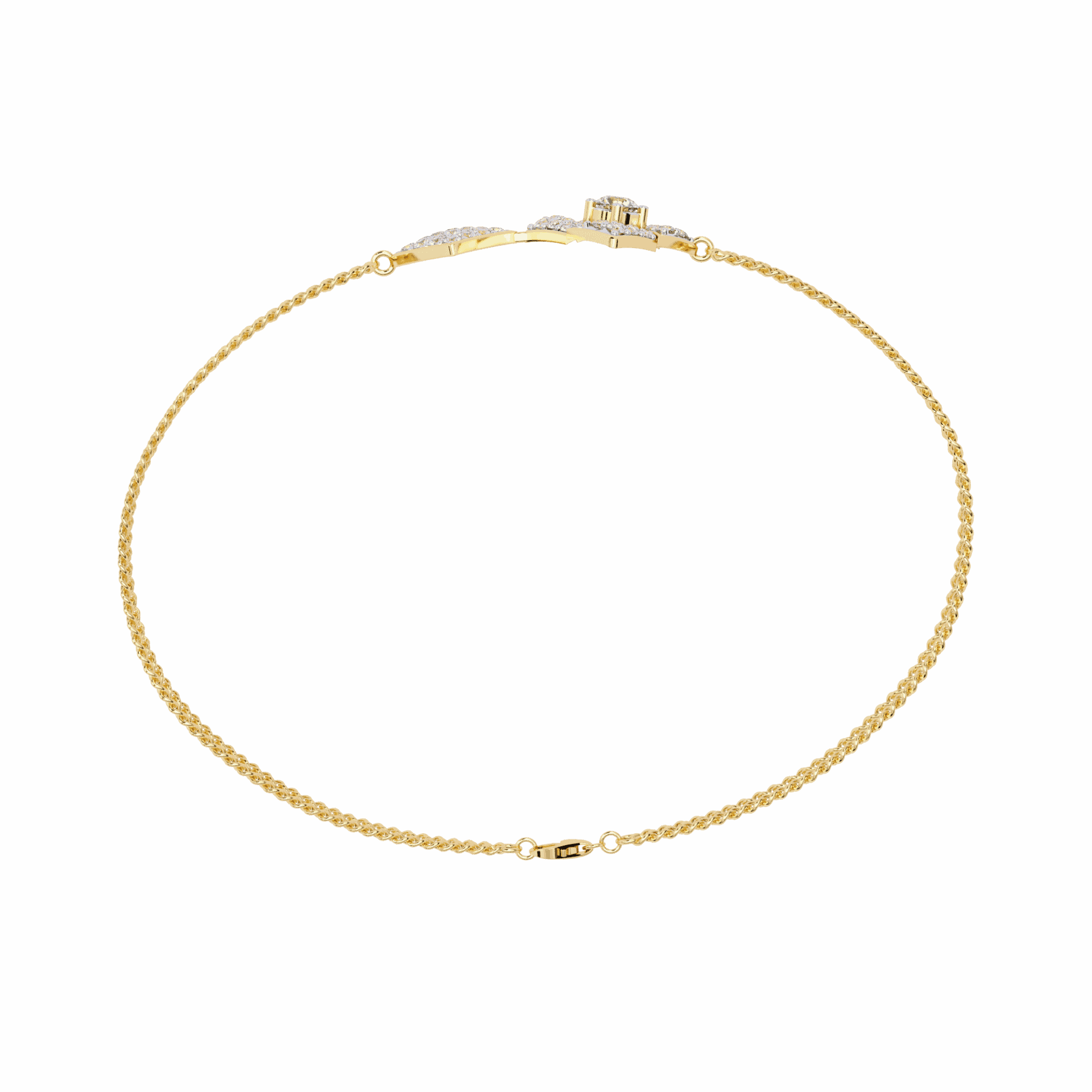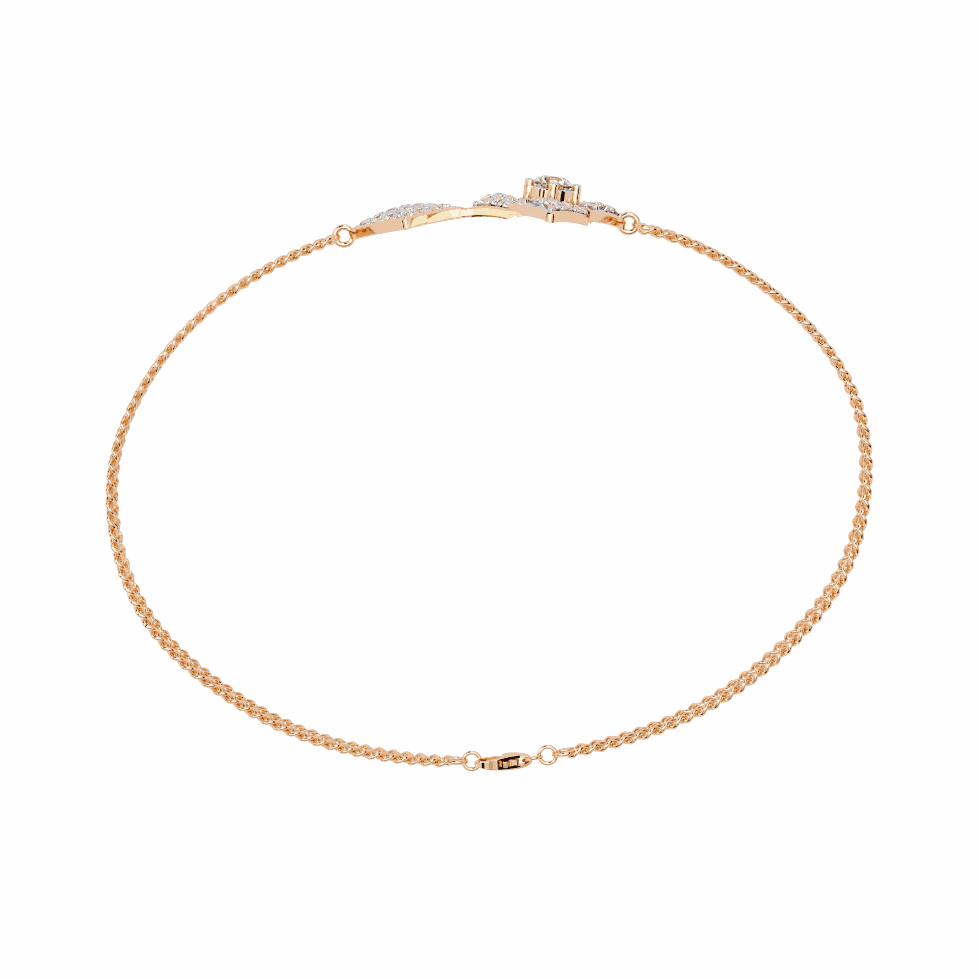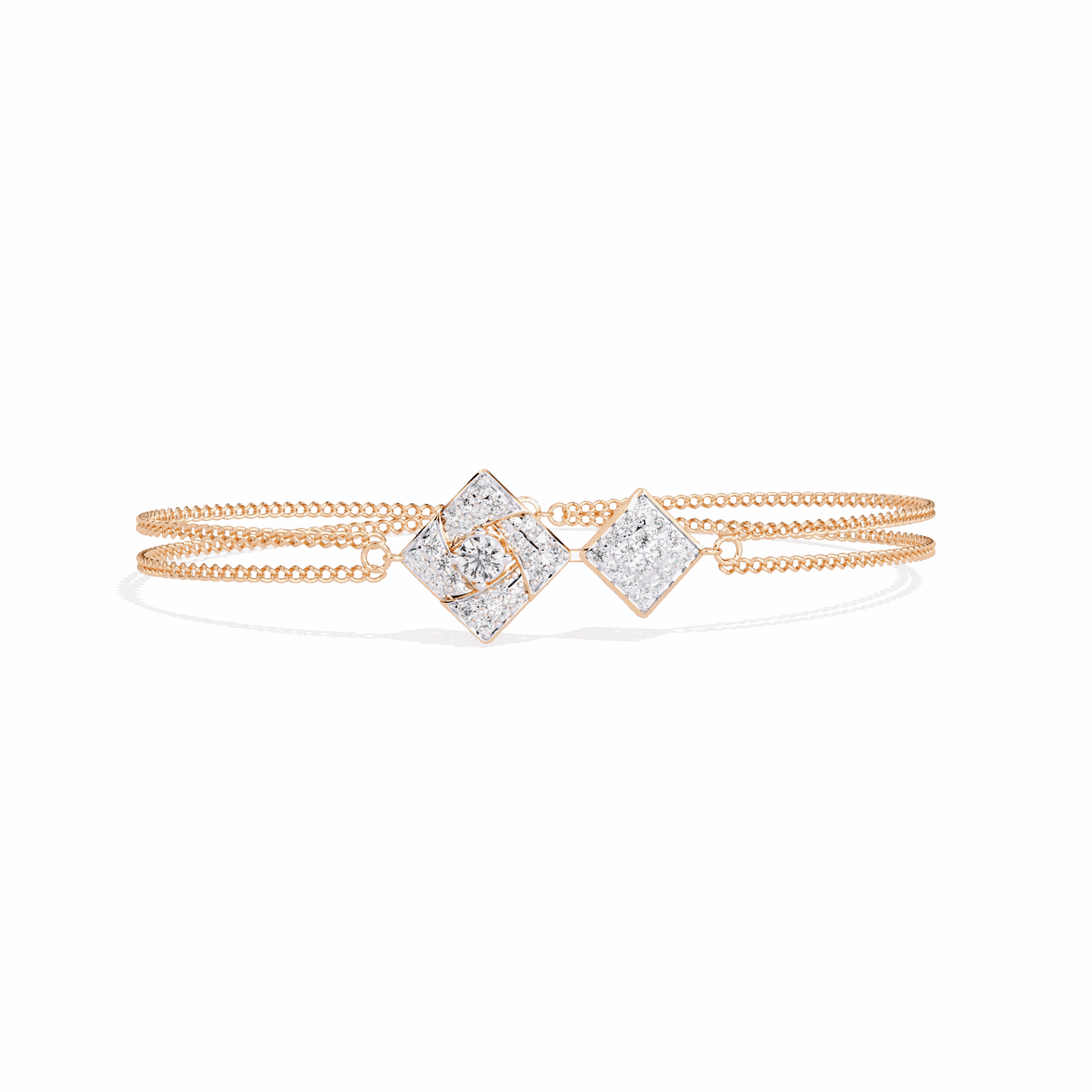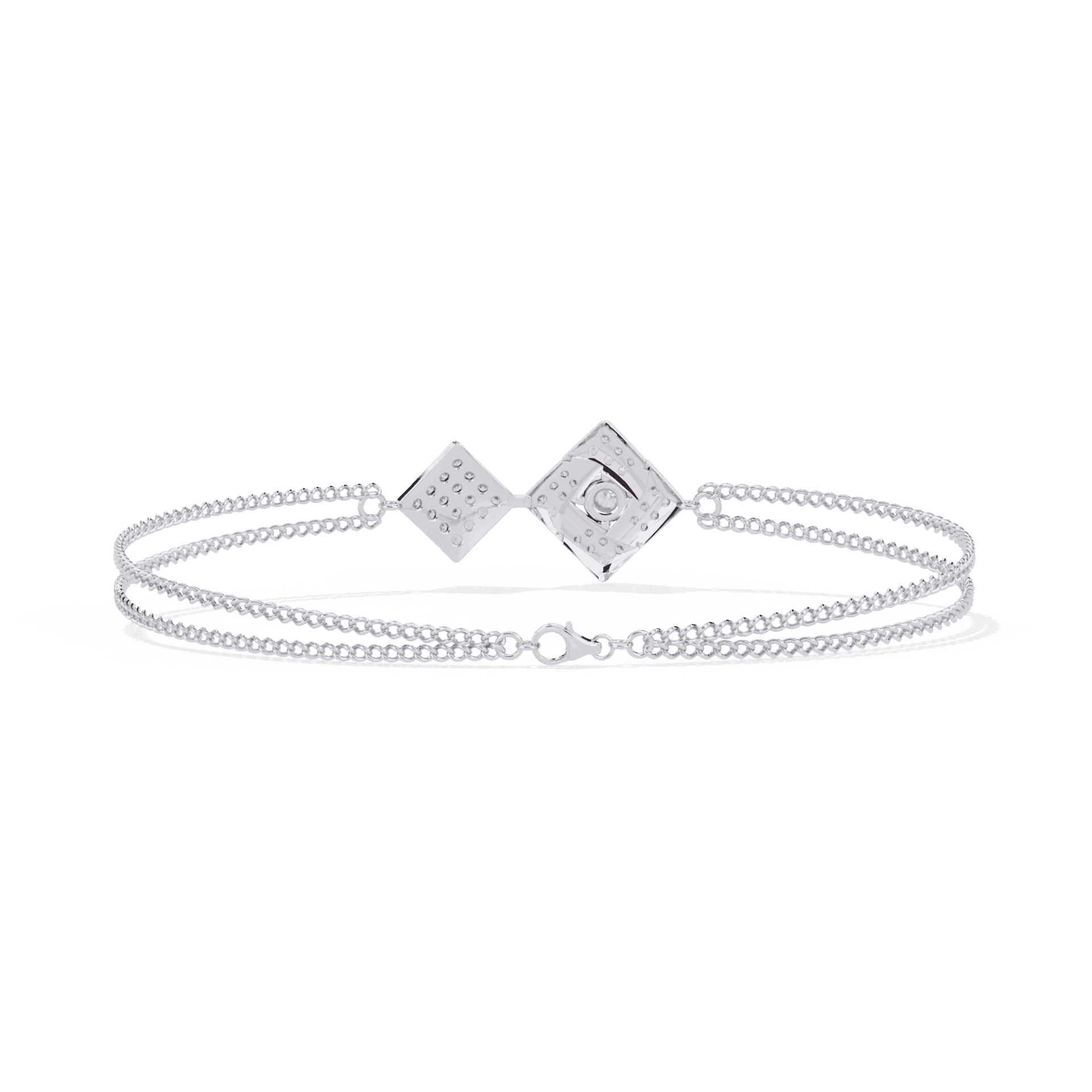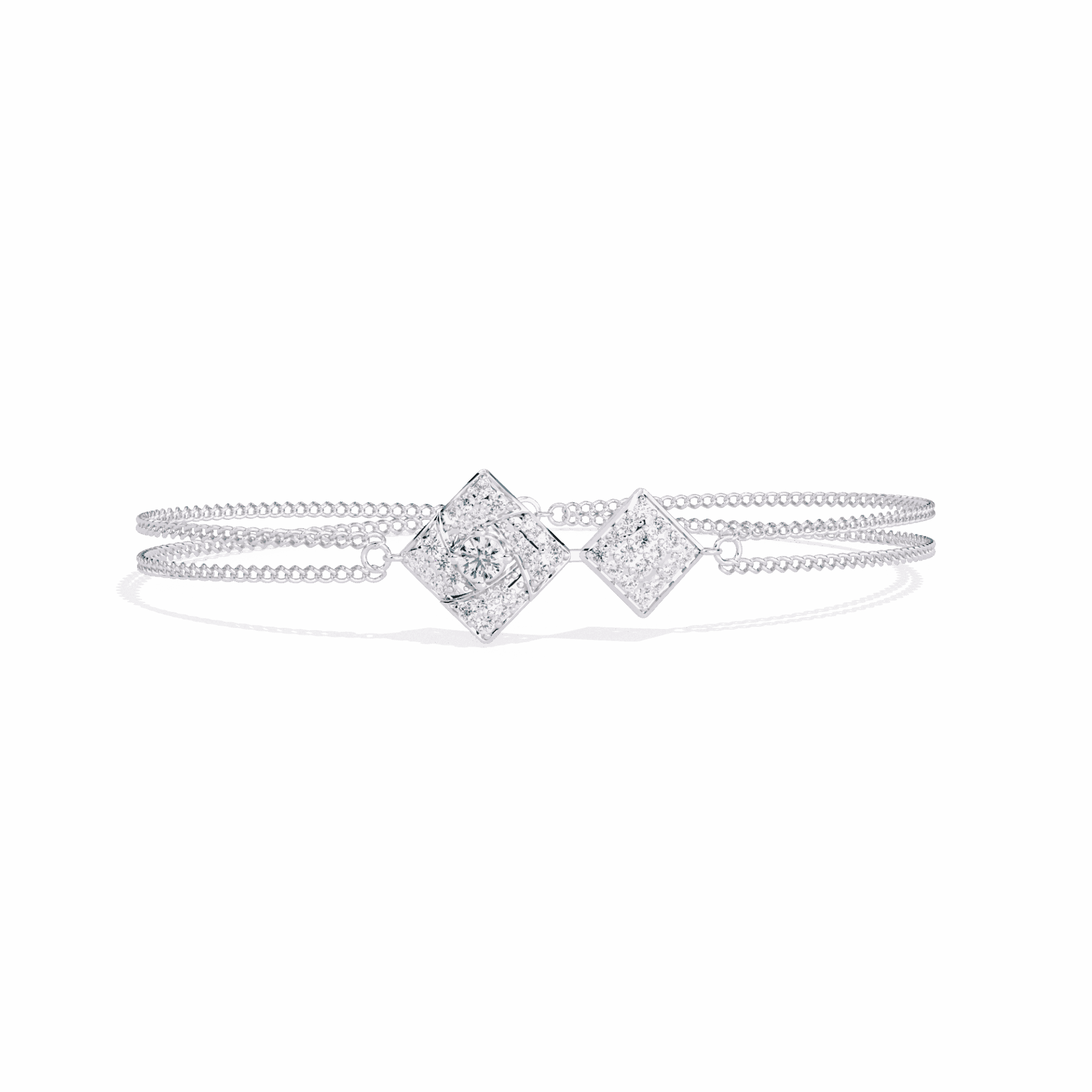 Two kite-shaped diamond motifs connected by a slim chain. Modern geometry that floats on the wrist.