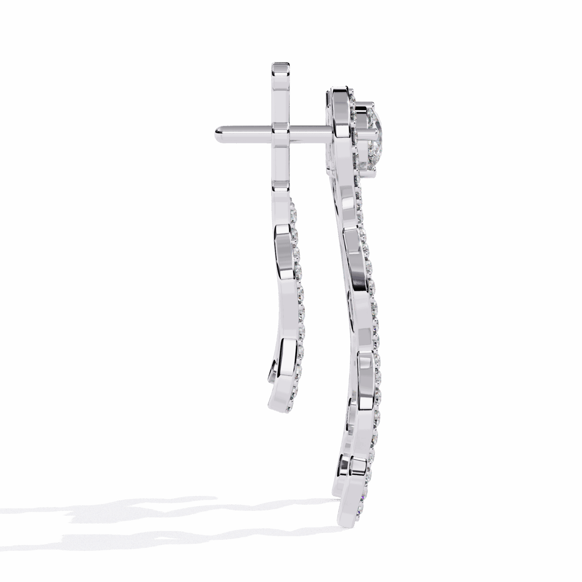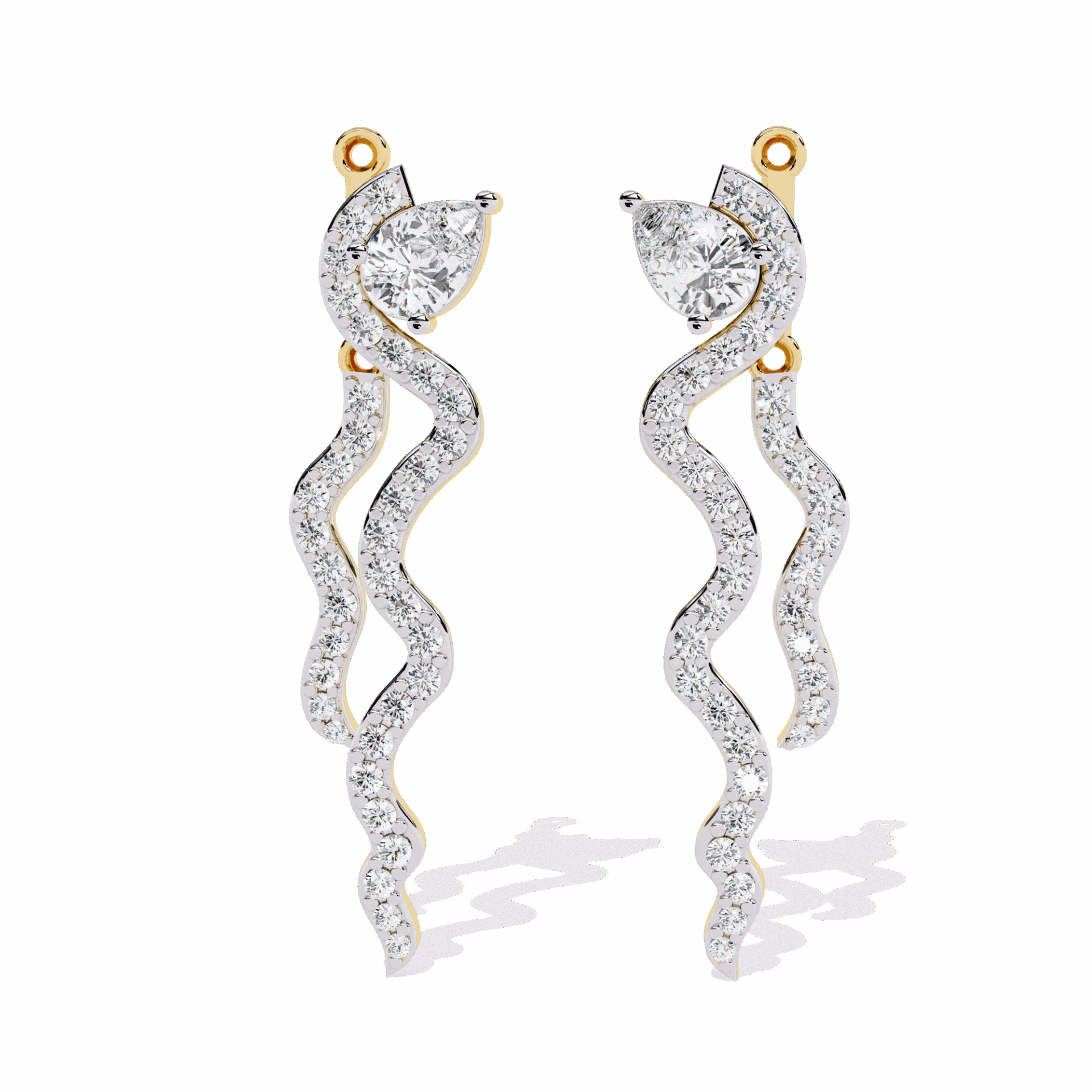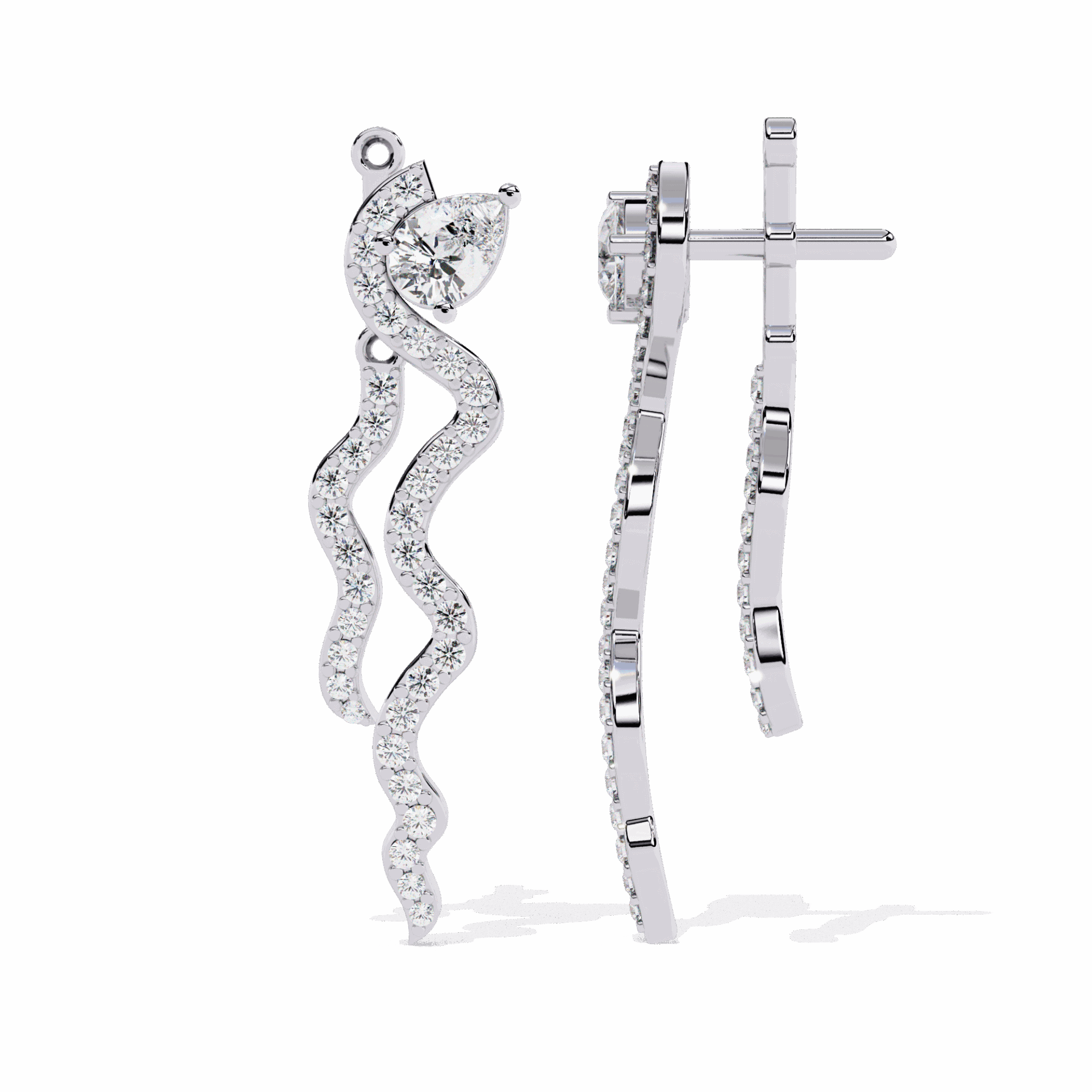 72 lab-grown diamonds – pear and round cuts – totaling 0.84 carats in an elaborate dangle design. The pear cuts add direction and drama, the rounds add fire.