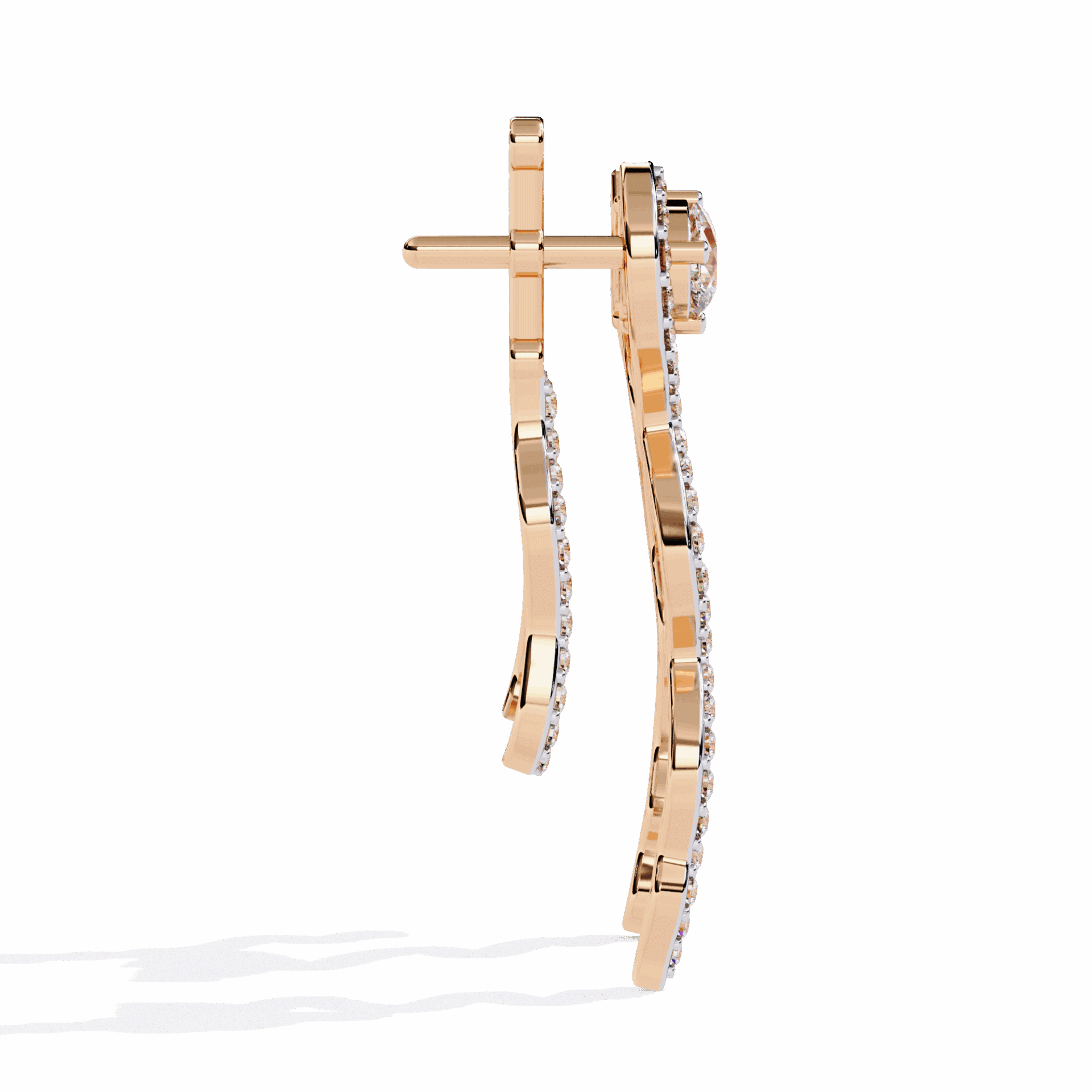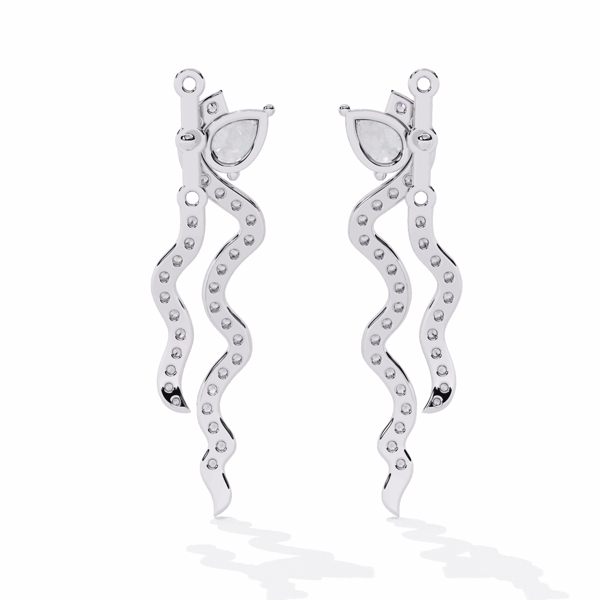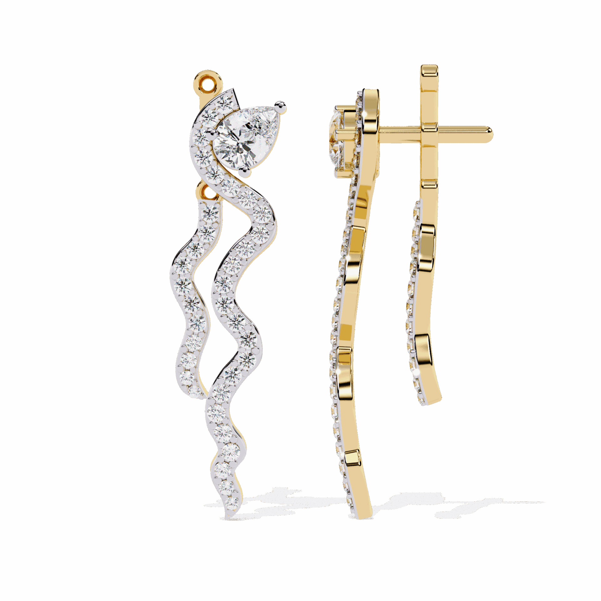 72 lab-grown diamonds – pear and round cuts – totaling 0.84 carats in an elaborate dangle design. The pear cuts add direction and drama, the rounds add fire.