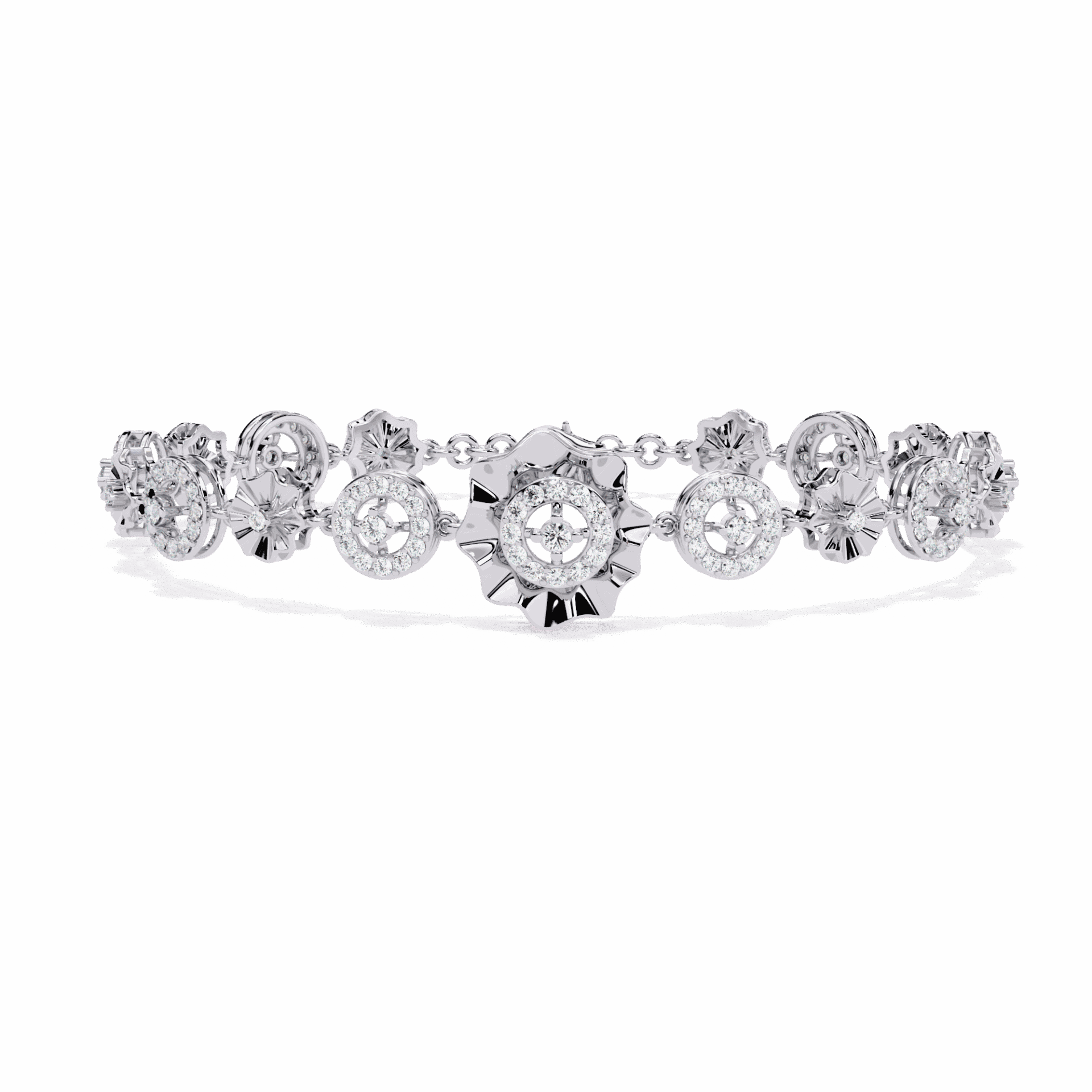 138 round lab-grown diamonds arranged in alternating halo clusters – each cluster a perfect circle of diamonds surrounding a center stone. The pattern repeats with mathematical precision around the wrist.