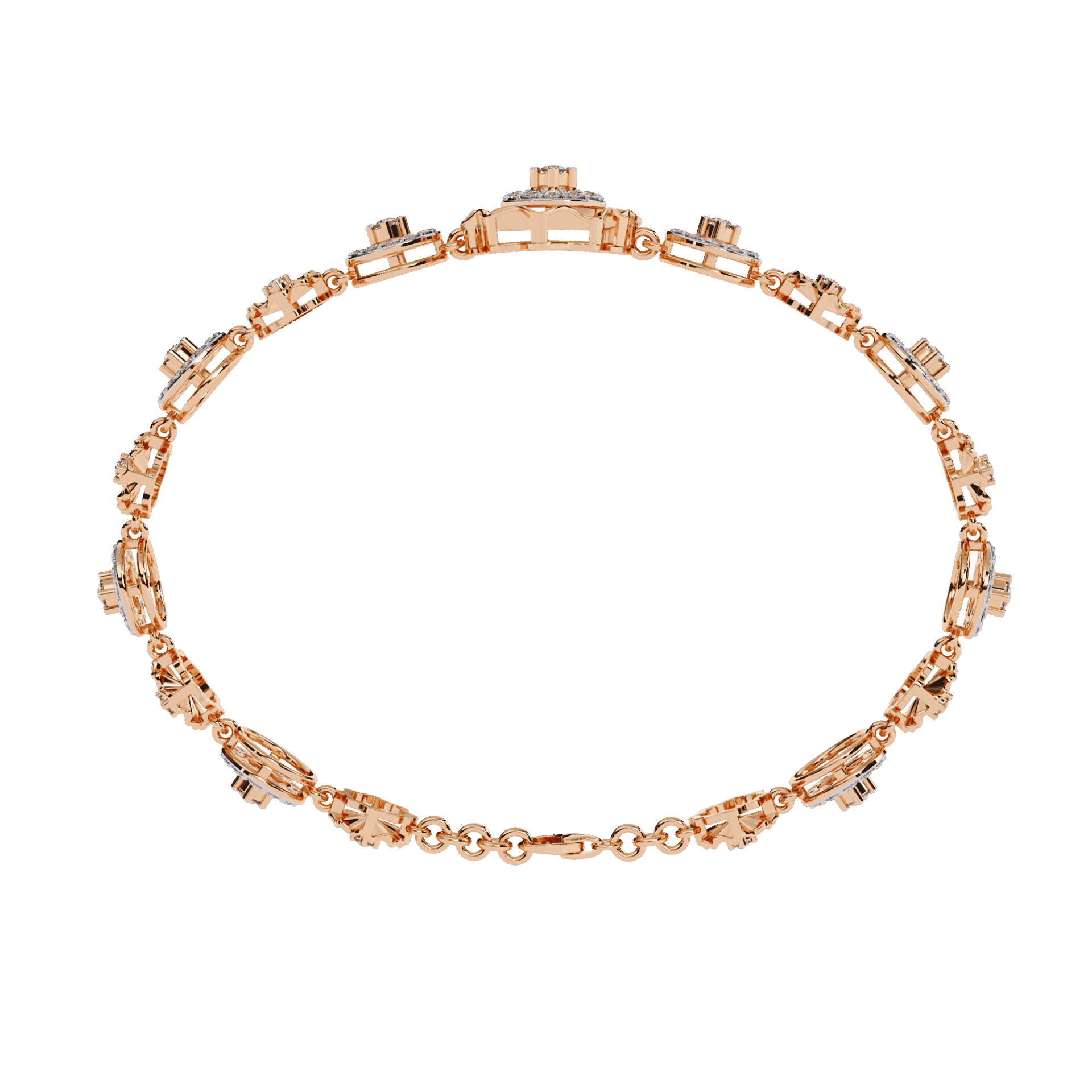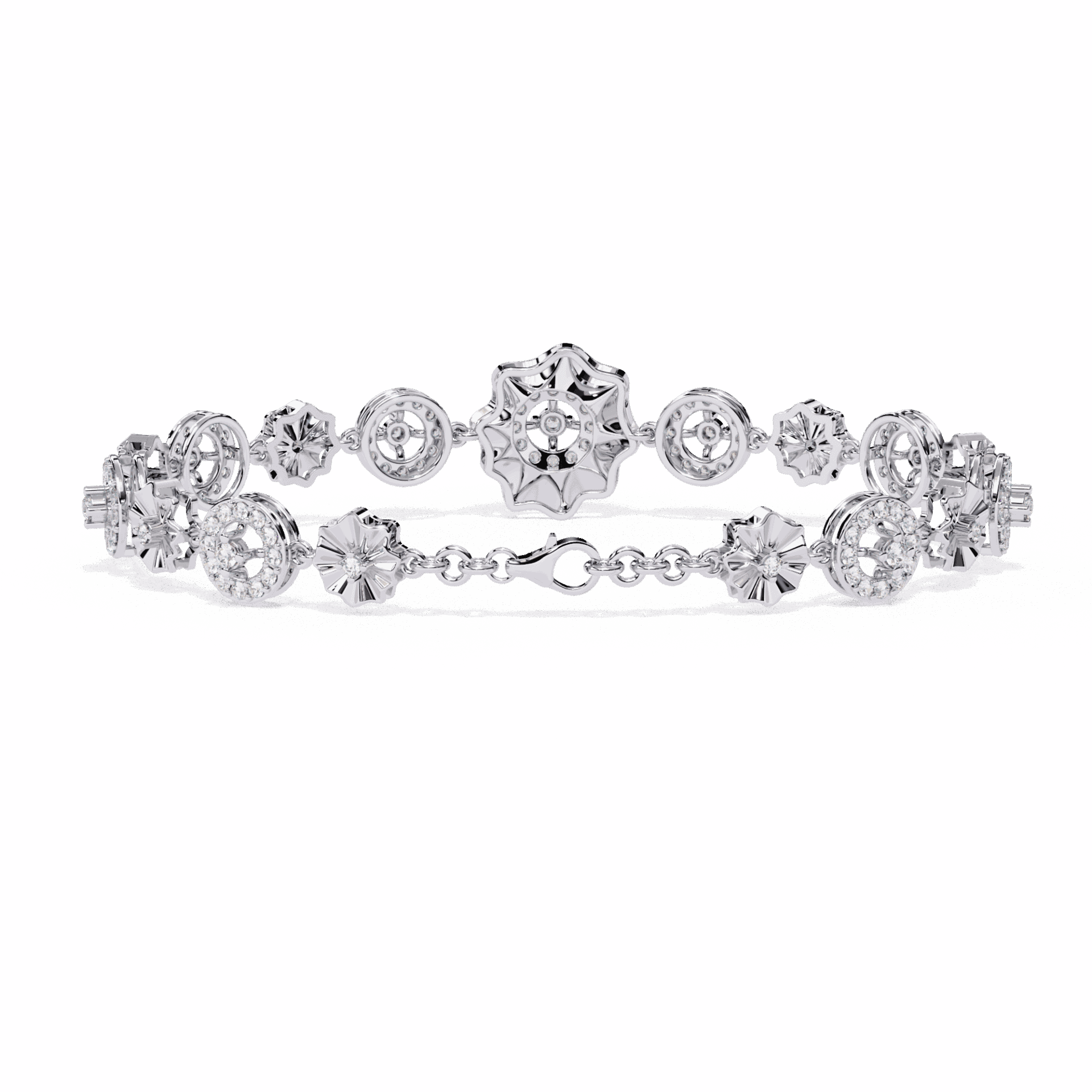 138 round lab-grown diamonds arranged in alternating halo clusters - each cluster a perfect circle of diamonds surrounding a center stone. The pattern repeats with mathematical precision around the wrist.