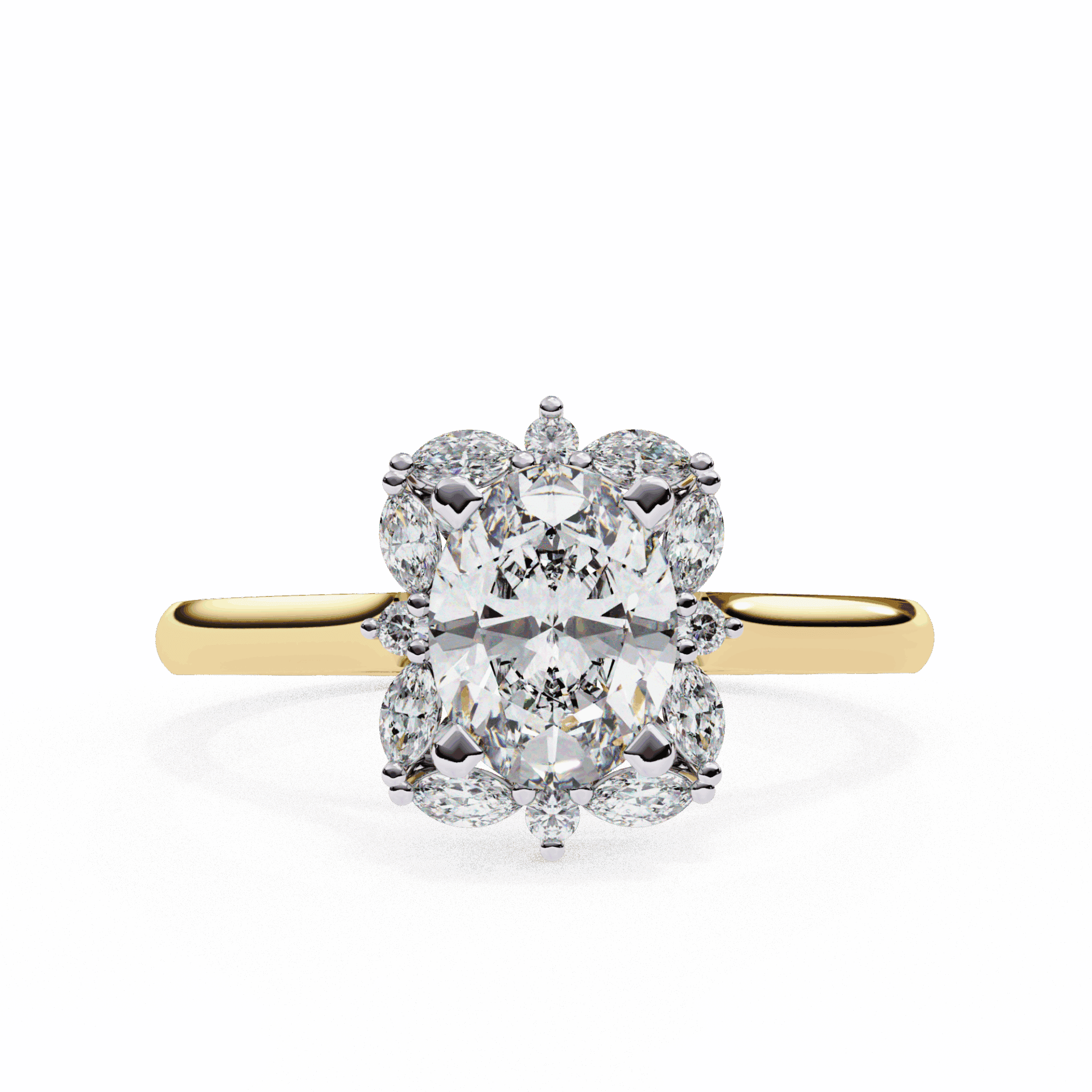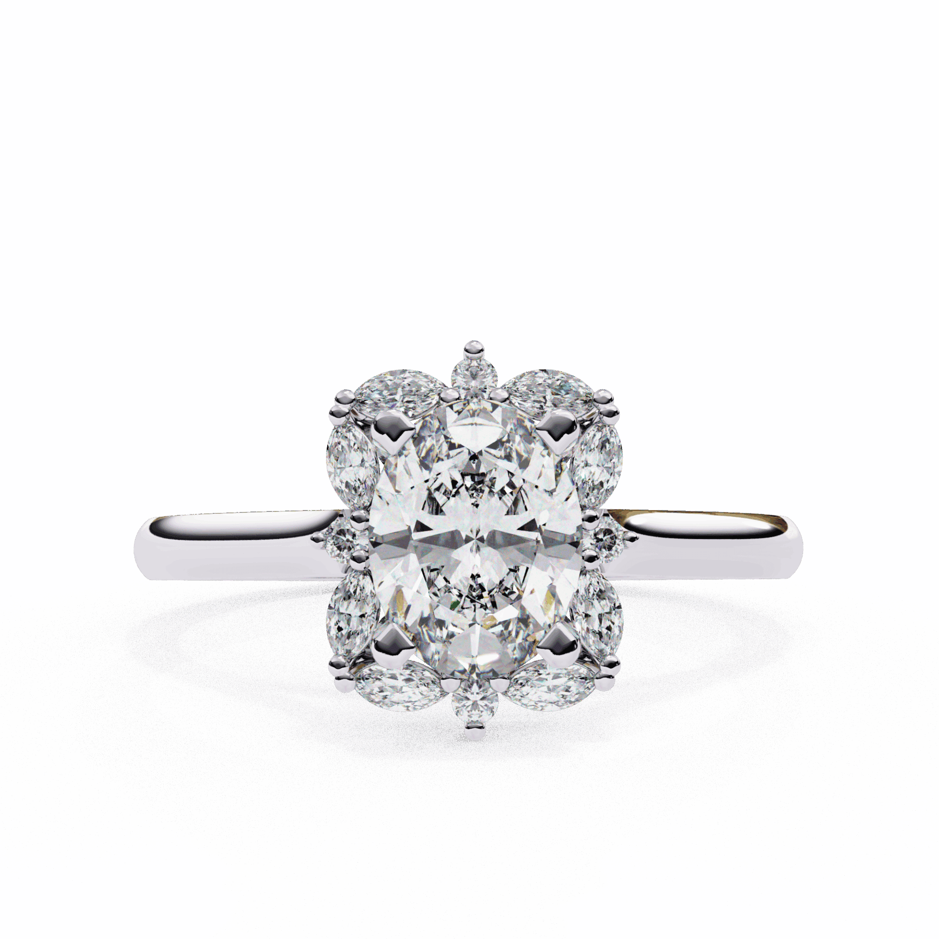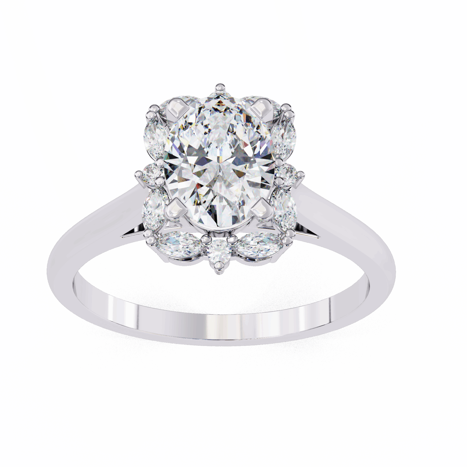 An oval-cut lab-grown diamond with 13 accent diamonds totaling 1.29 carats in a classic band. Flattering elongation in timeless form.