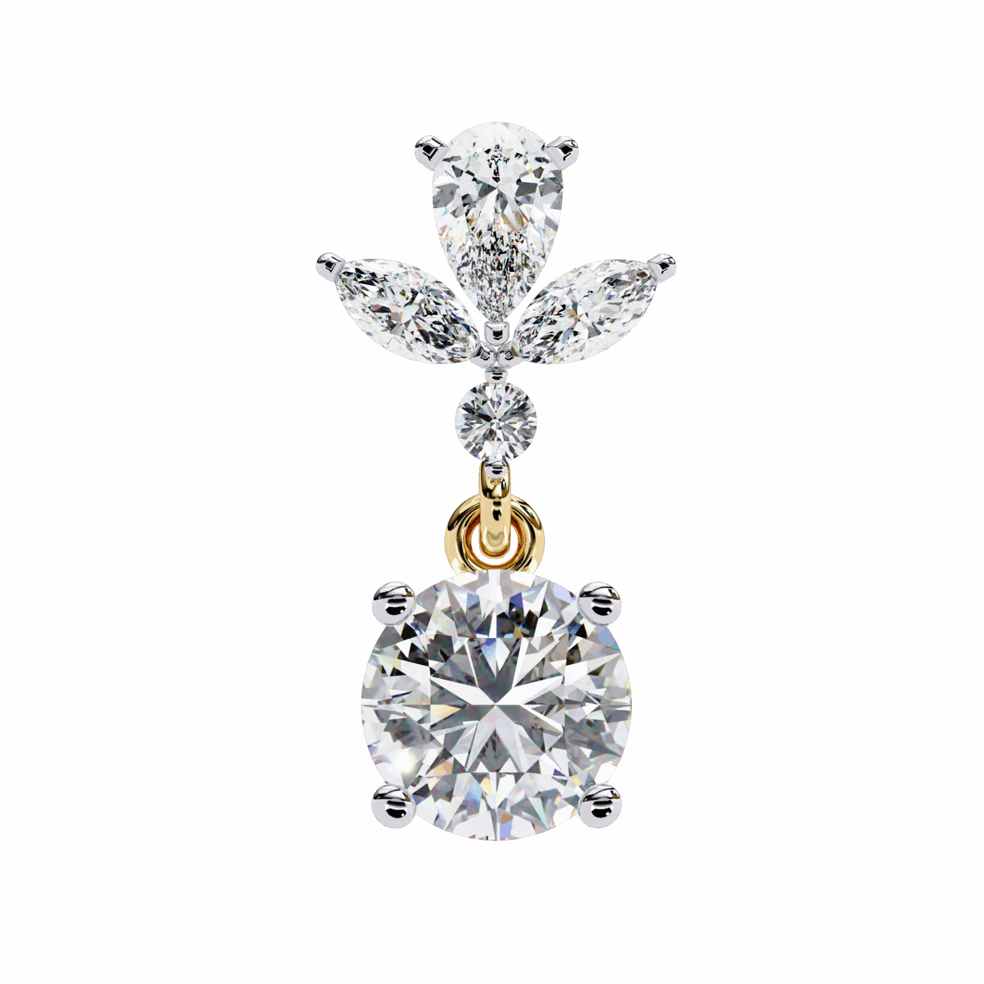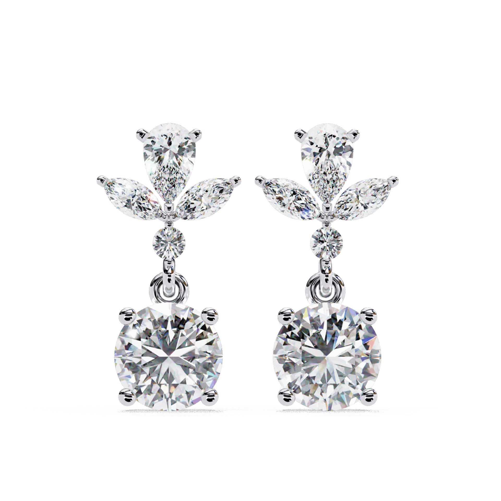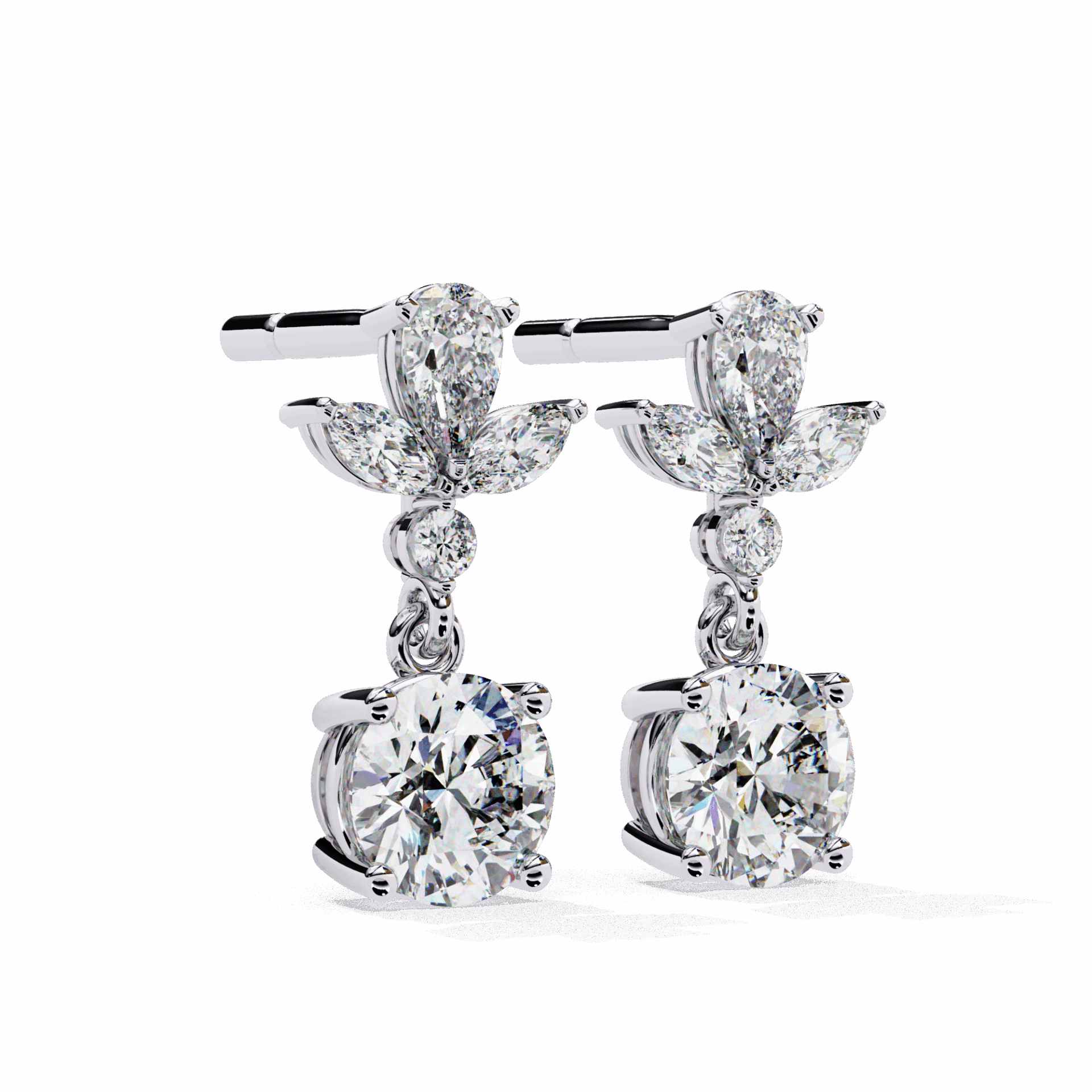 10 diamonds – marquise, round, and pear – in a cascading dangle design. Movement and mixed cuts.