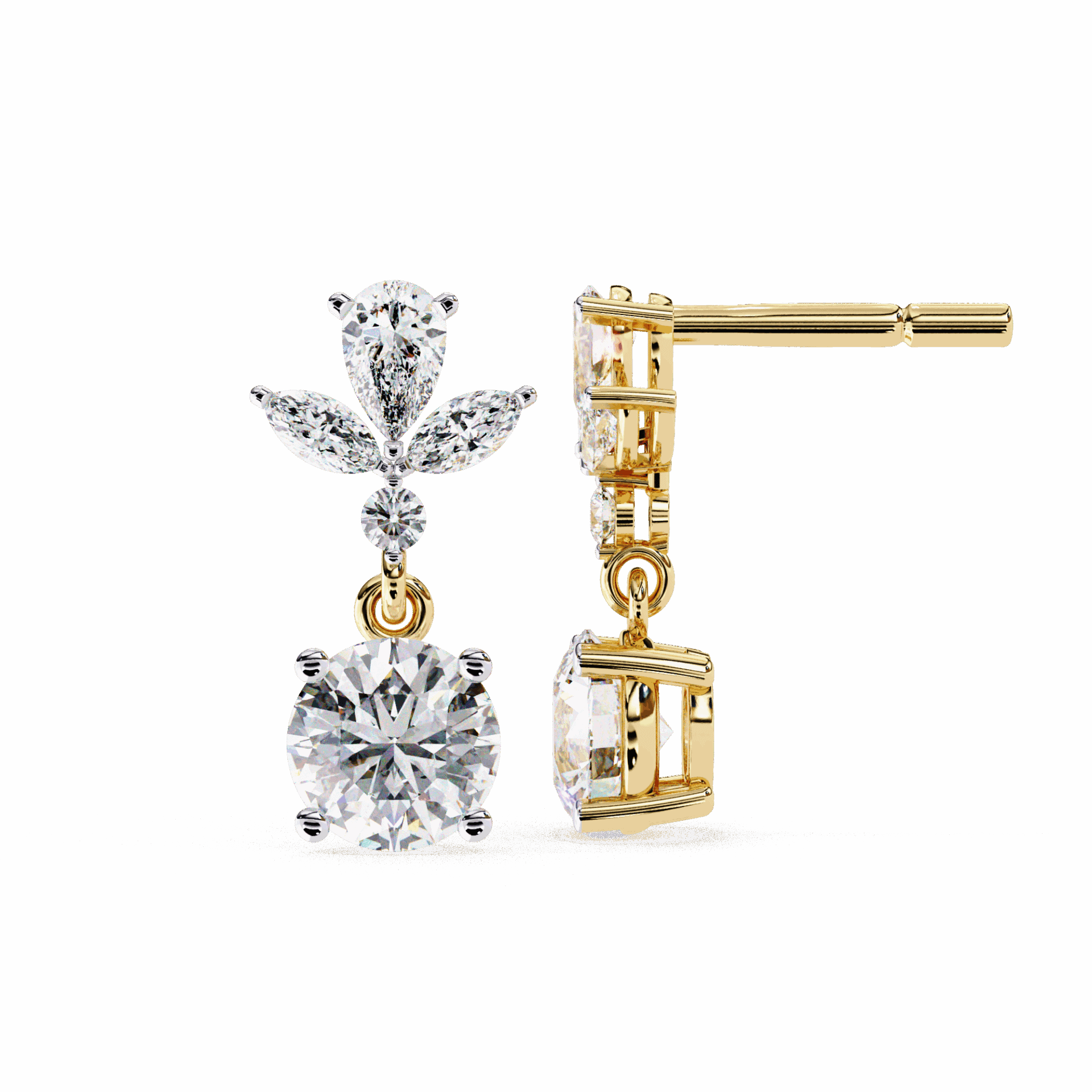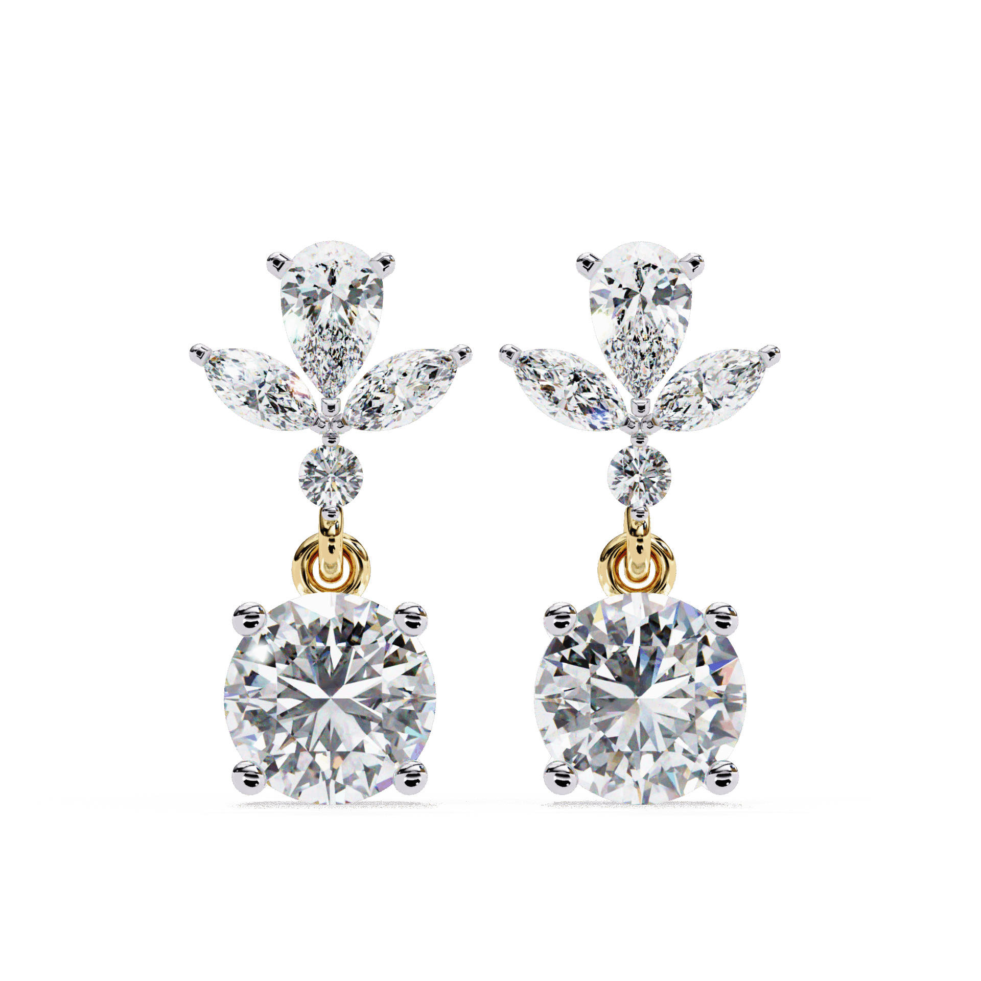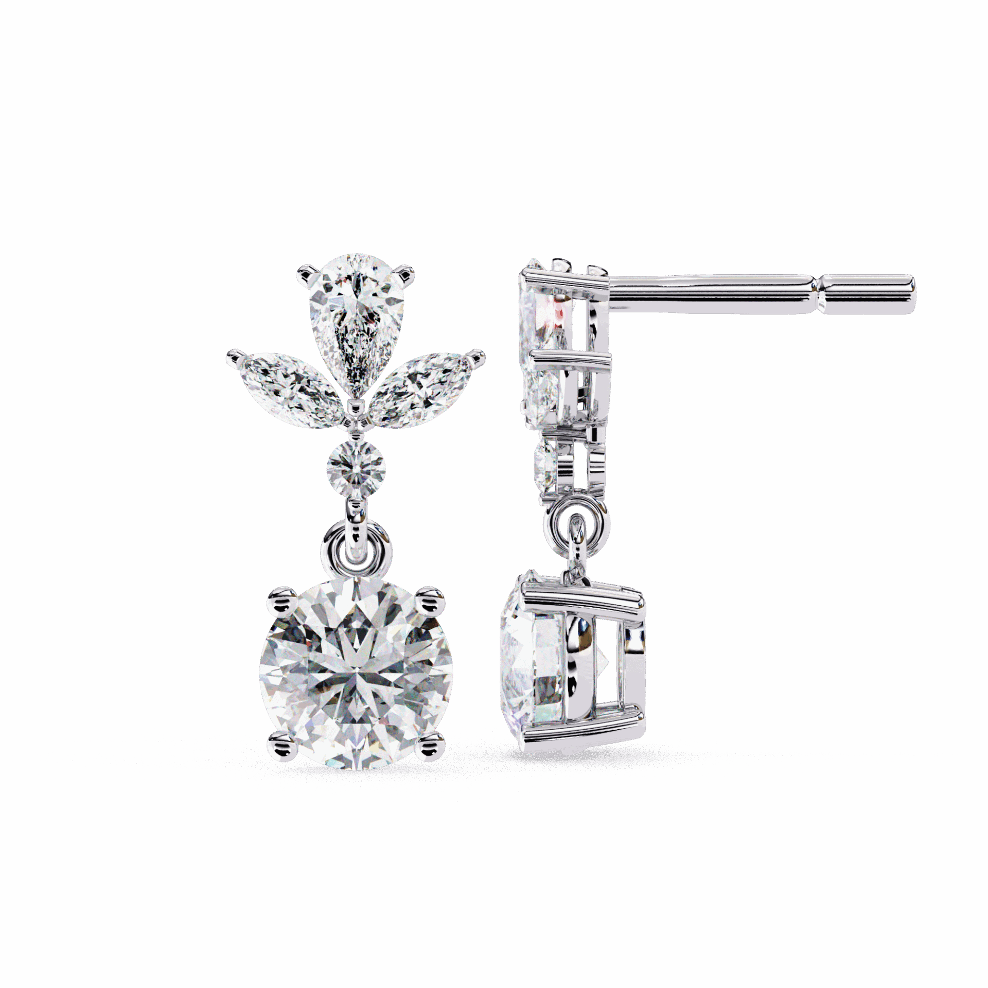 10 lab-grown diamonds – marquise, round, and pear cuts – totaling 1.17 carats in a cascading dangle design. Each cut catches light differently as the earrings move.