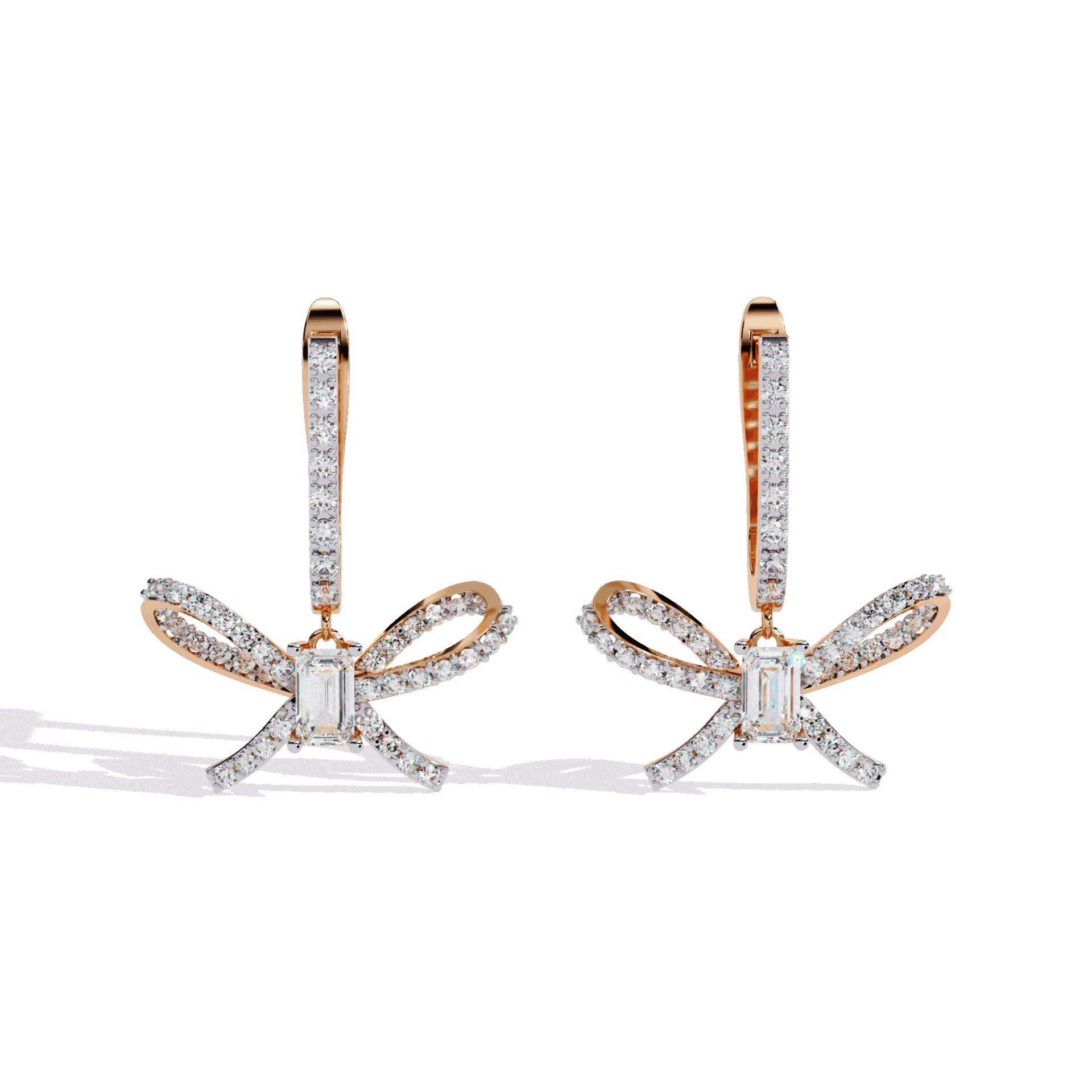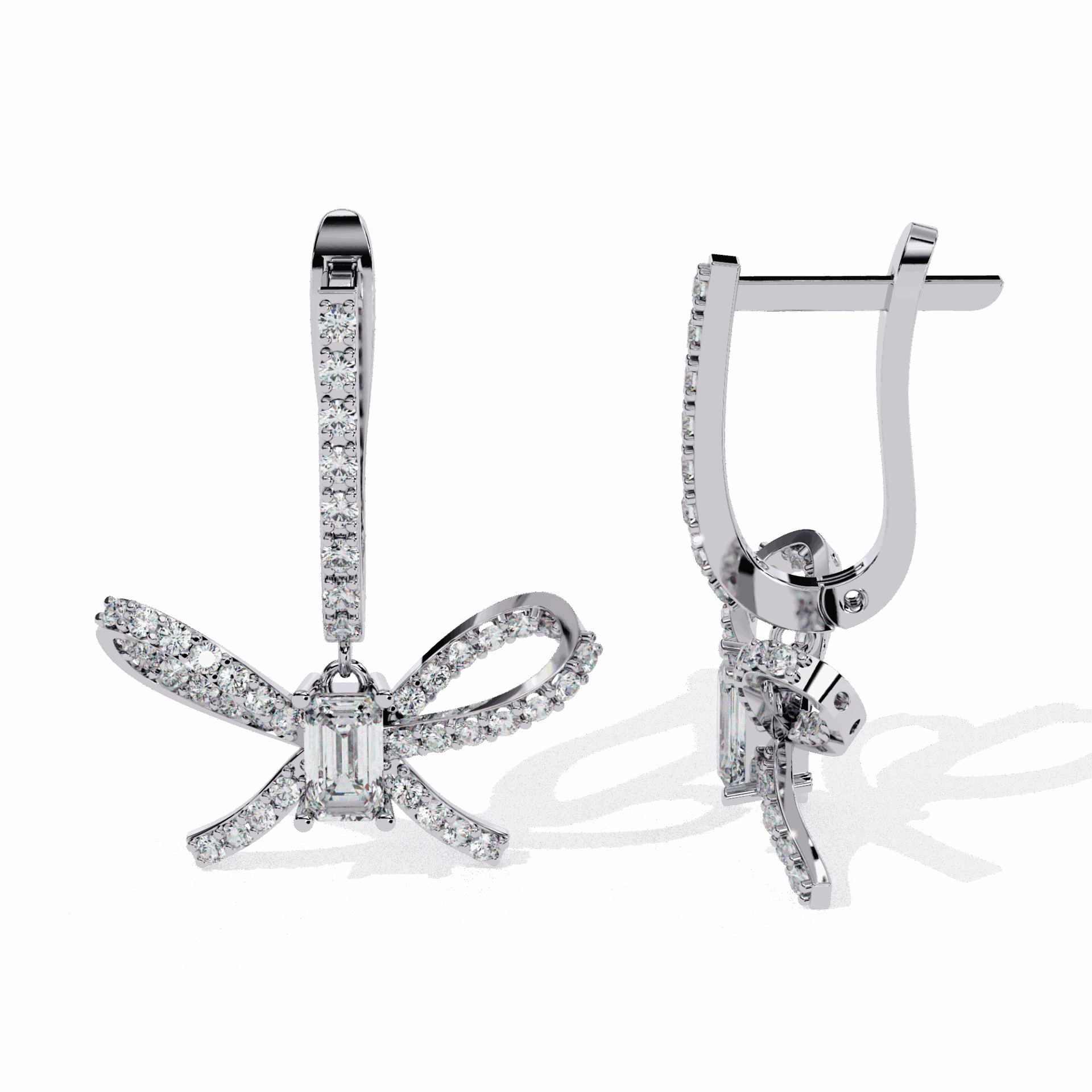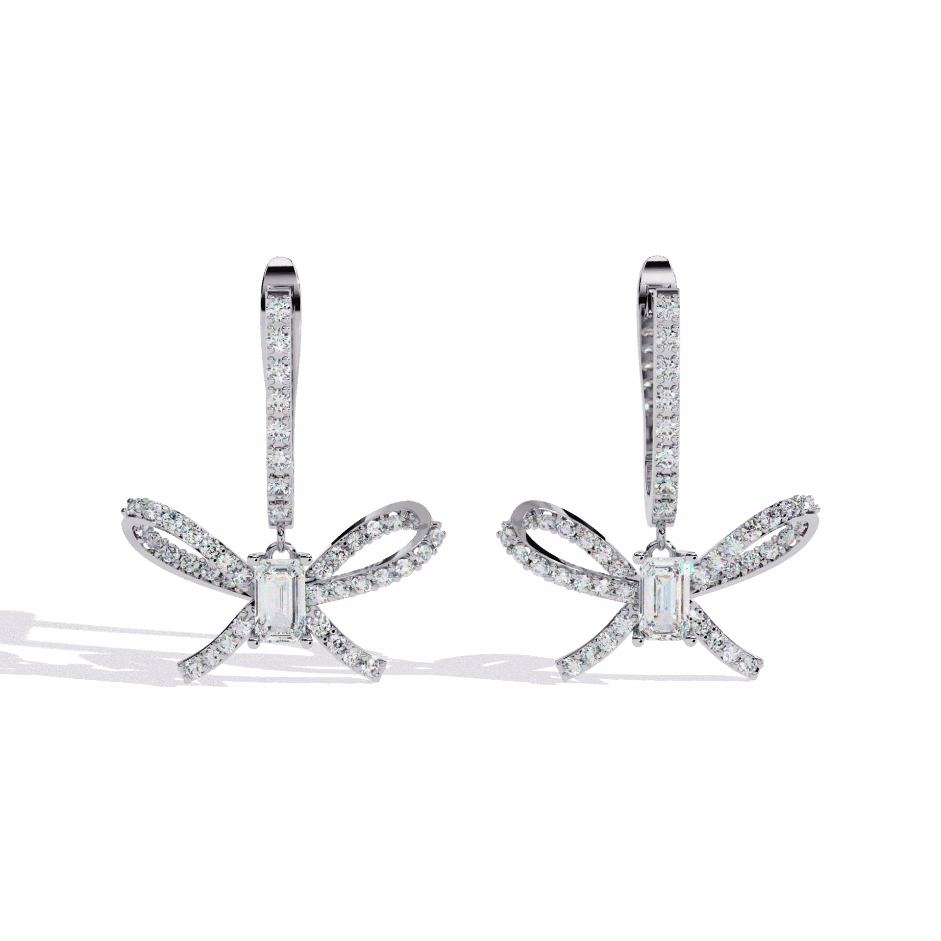 86 lab-grown diamonds – emerald and round cuts – totaling 1.18 carats in flowing ribbon-inspired dangle settings. The linear emeralds contrast with brilliant rounds in designs that move like silk ribbons.