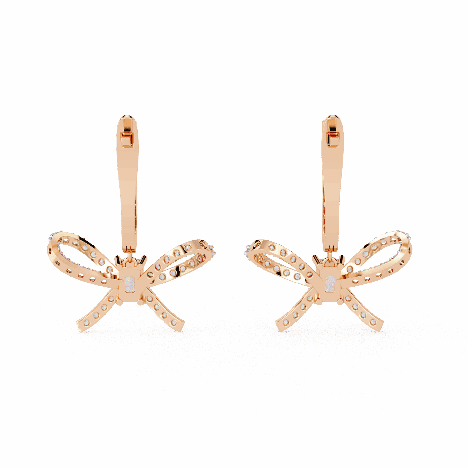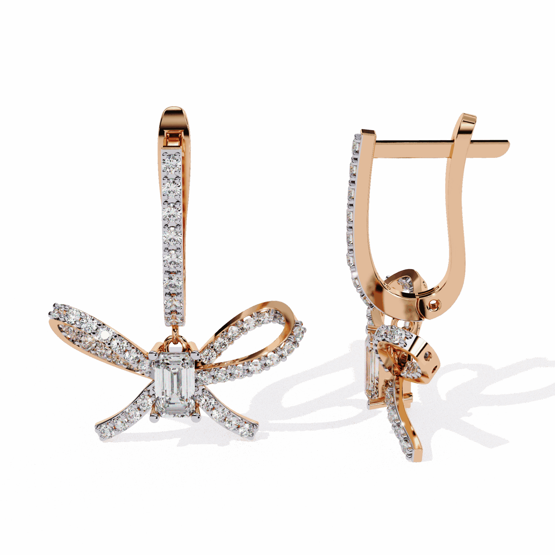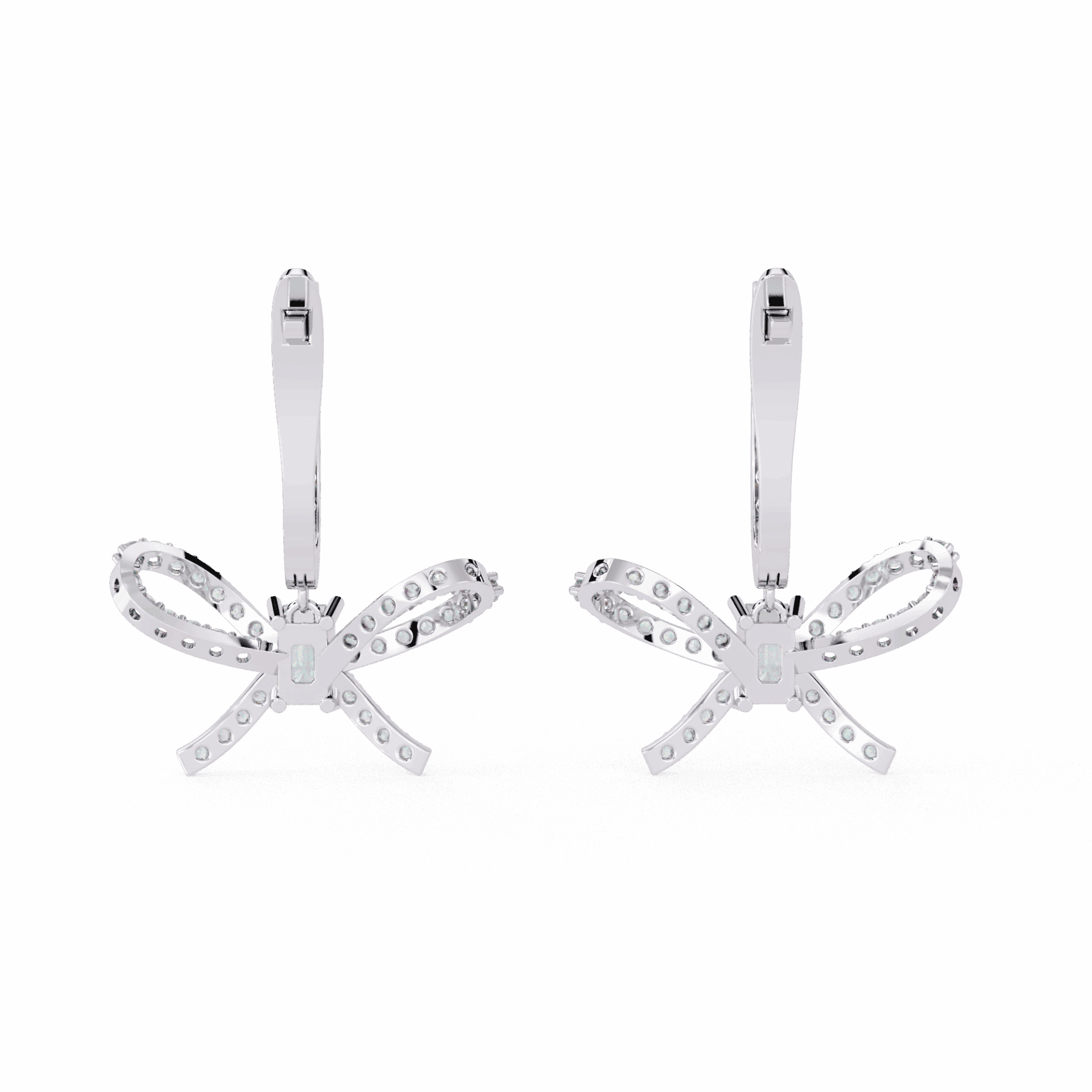 86 lab-grown diamonds – emerald and round cuts – totaling 1.18 carats in flowing ribbon-inspired dangle settings. The linear emeralds contrast with brilliant rounds in designs that move like silk ribbons.