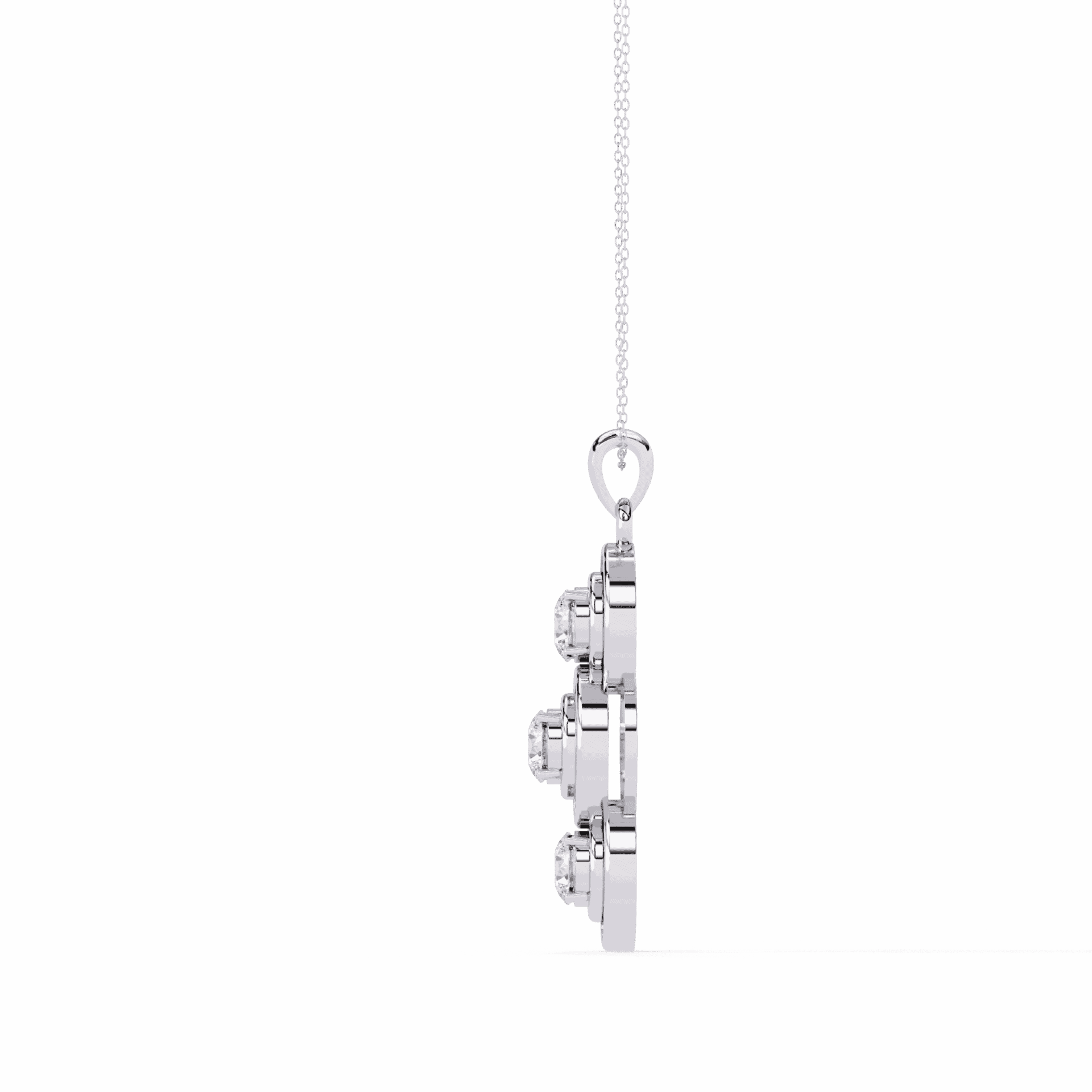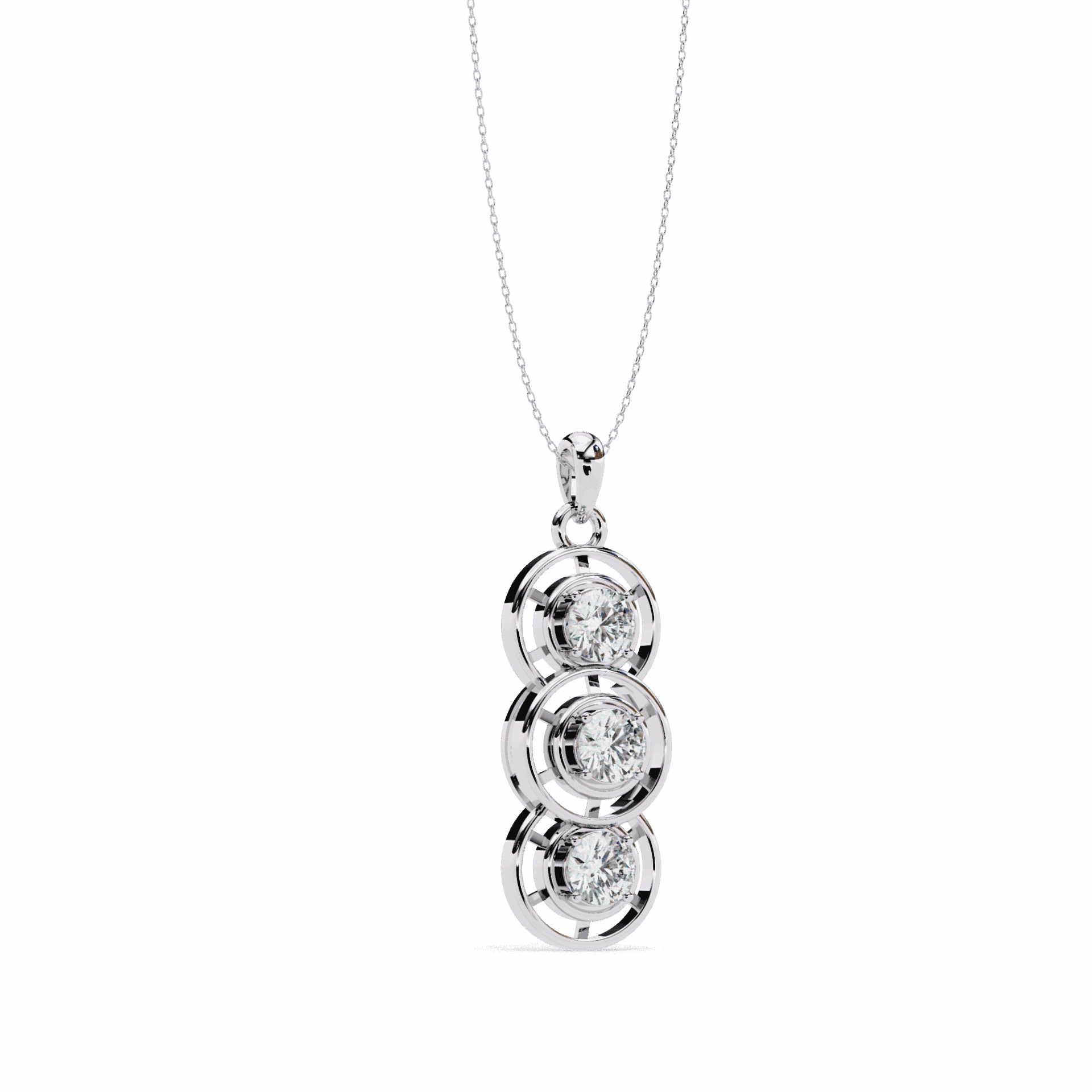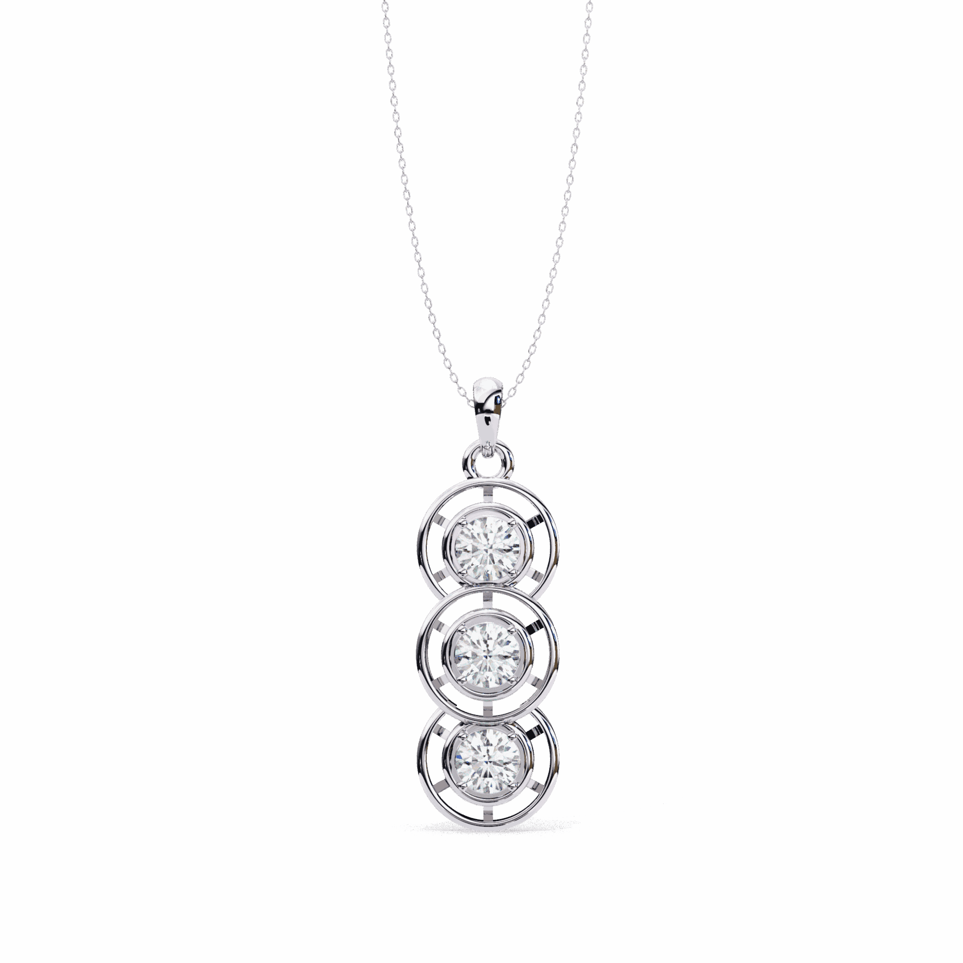 Three round lab-grown diamonds in bezel settings stacked vertically for a clean, linear look. Each stone is substantial – together, they create a pendant with elegant motion and understated luxury.