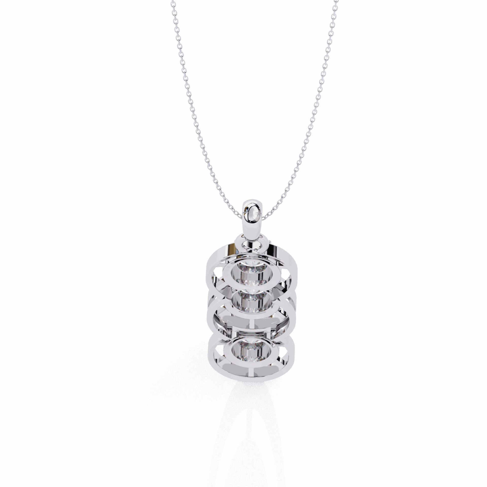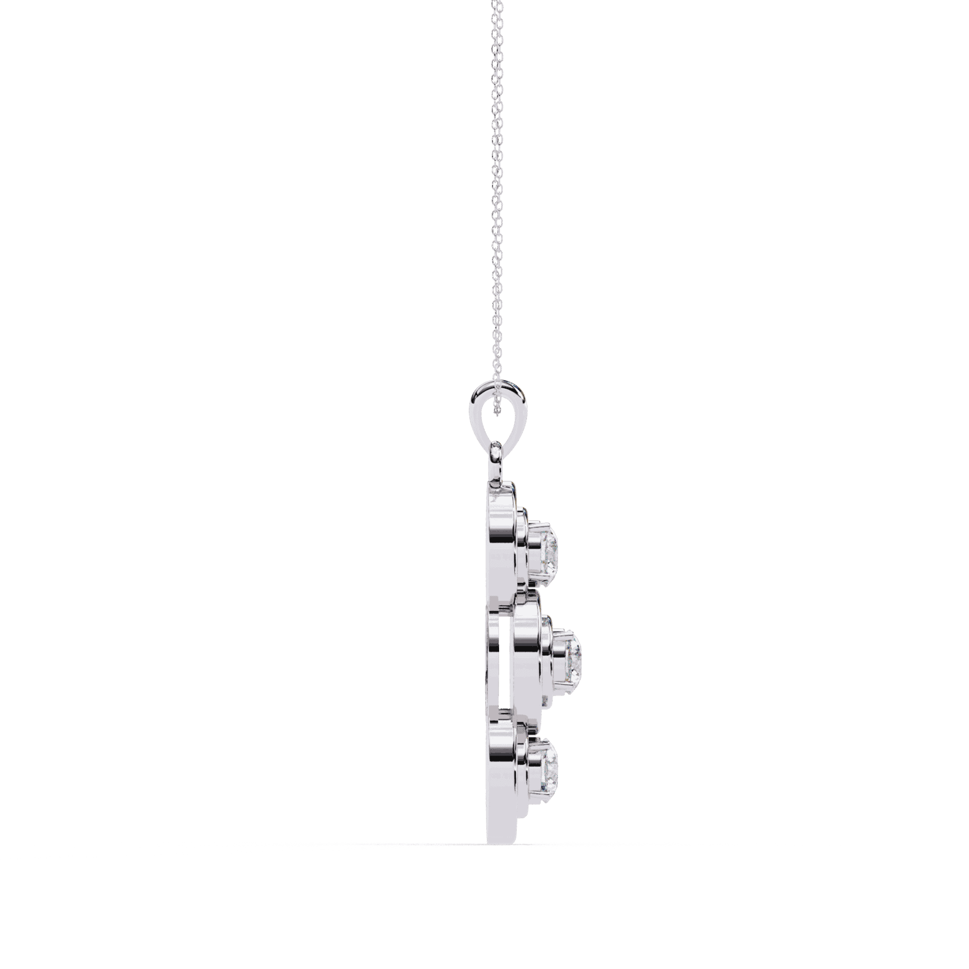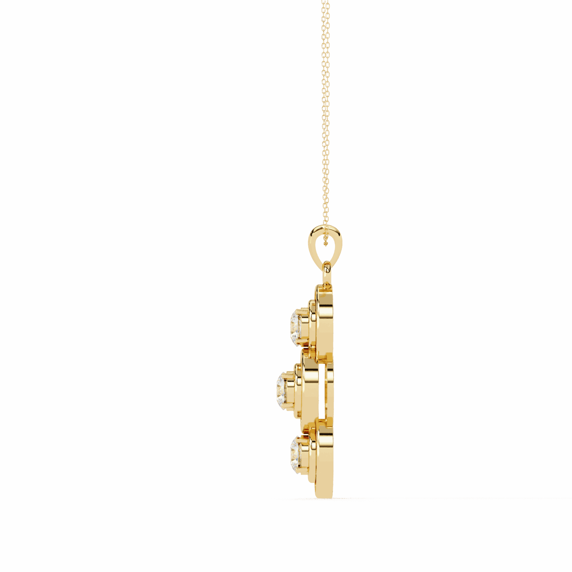 Three round lab-grown diamonds in bezel settings stacked vertically for a clean, linear look. Each stone is substantial – together, they create a pendant with elegant motion and understated luxury.