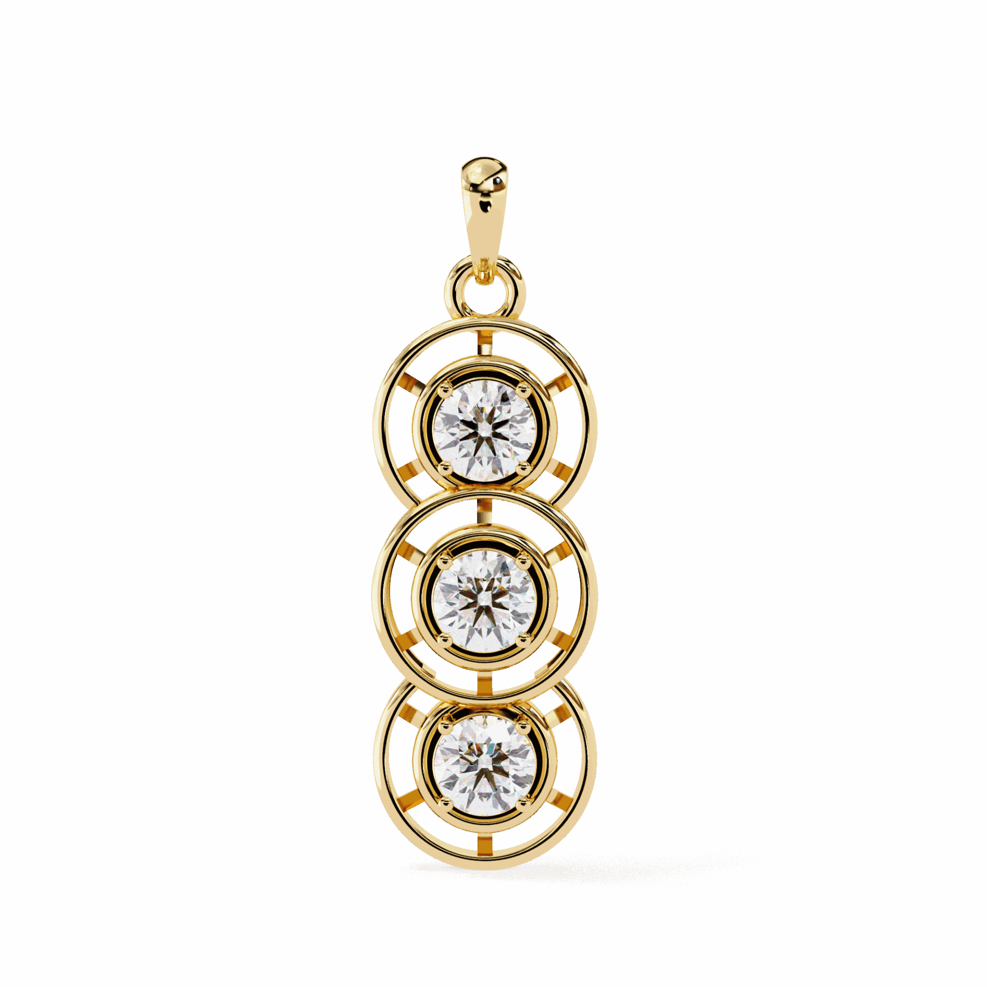 Three bezel-set round diamonds stacked vertically. Clean linear look with elegant motion.