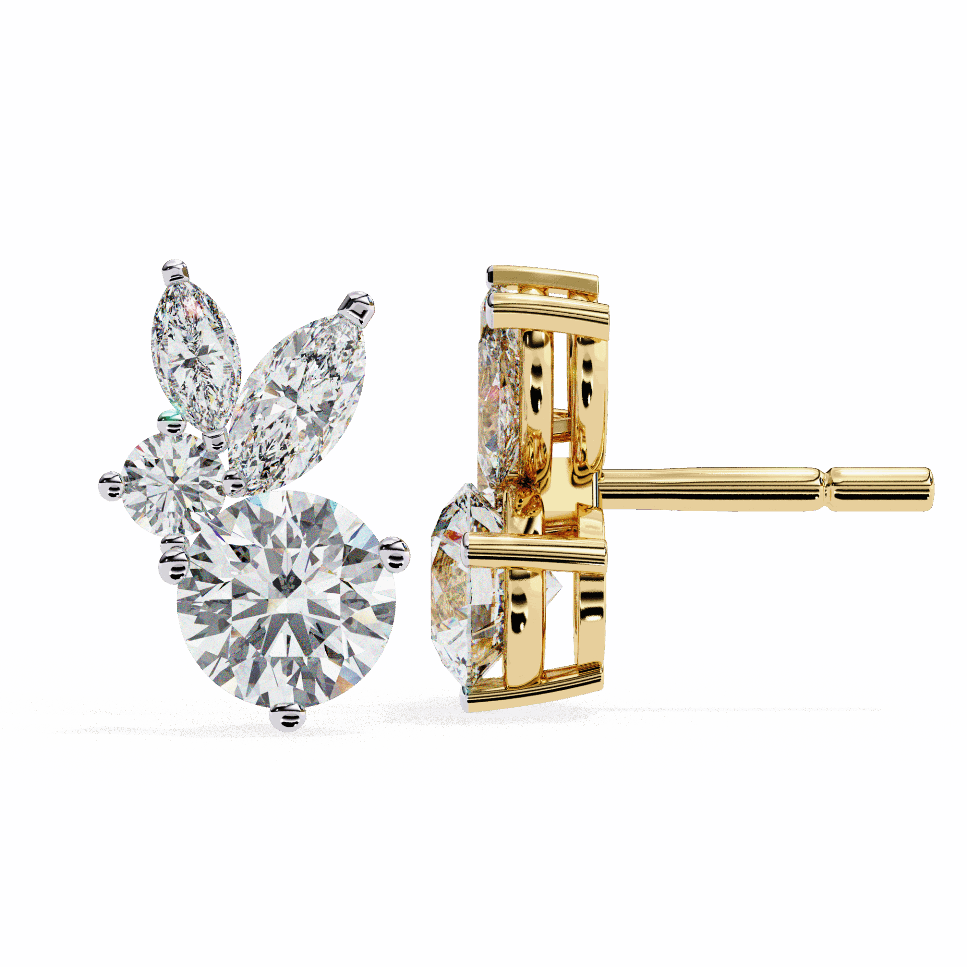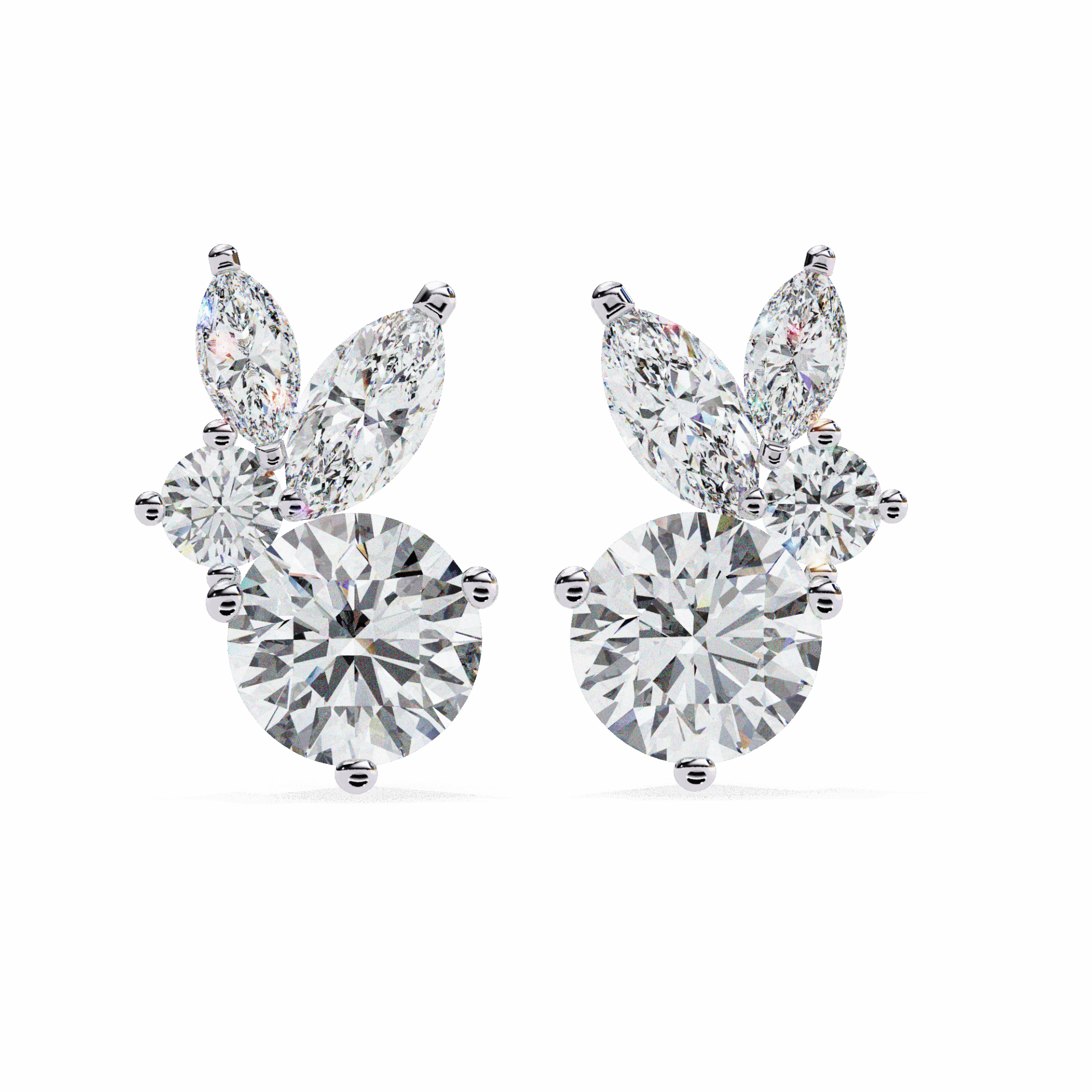 8 lab-grown diamonds - marquise and round cuts alternating - totaling 1.42 carats. The rhythm of different cuts creates visual interest that single-cut earrings can't match.