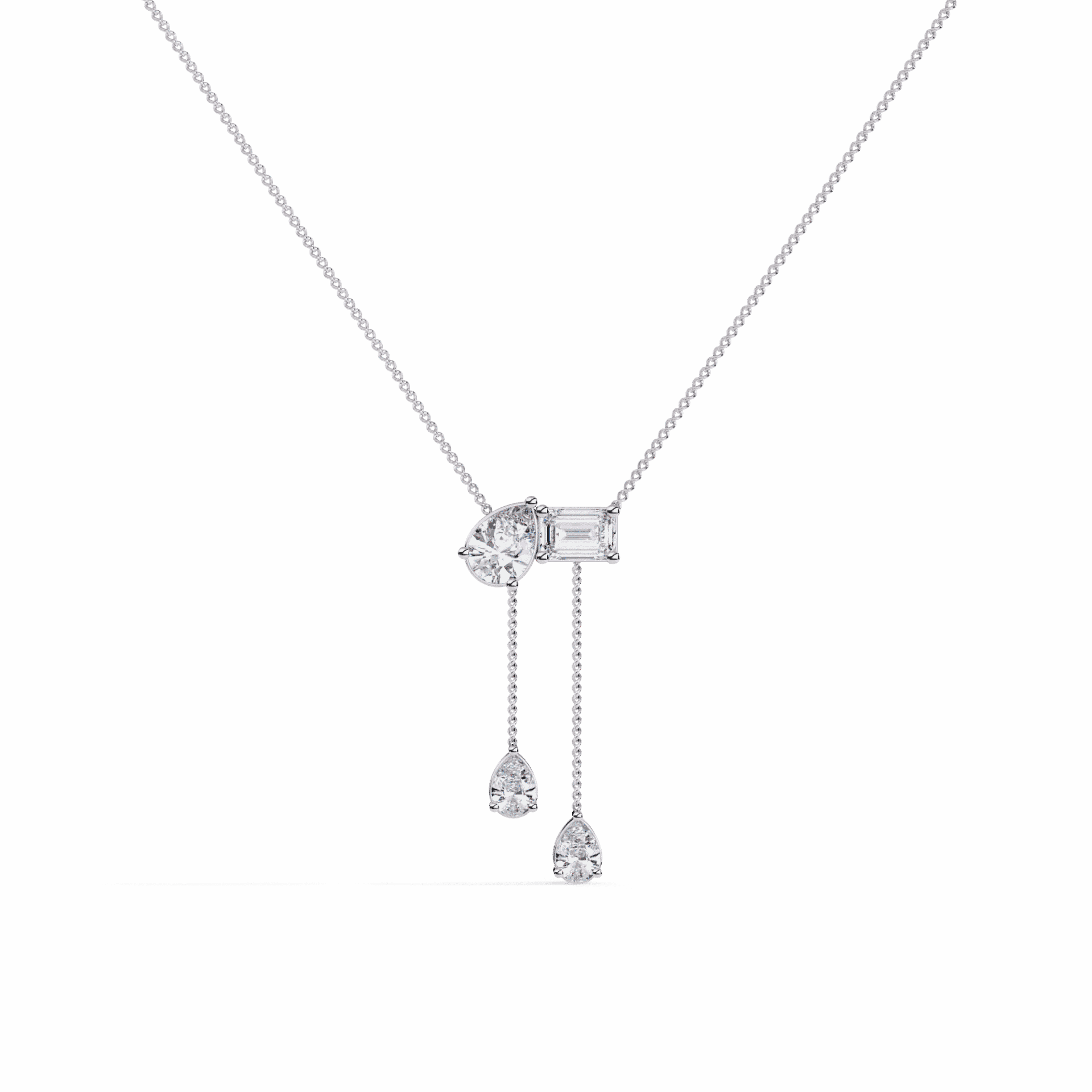 Four lab-grown diamonds - emerald and pear cuts combined in a delicate vertical silhouette. The emerald's flash contrasts with the pear's brilliance, creating sophisticated tension.