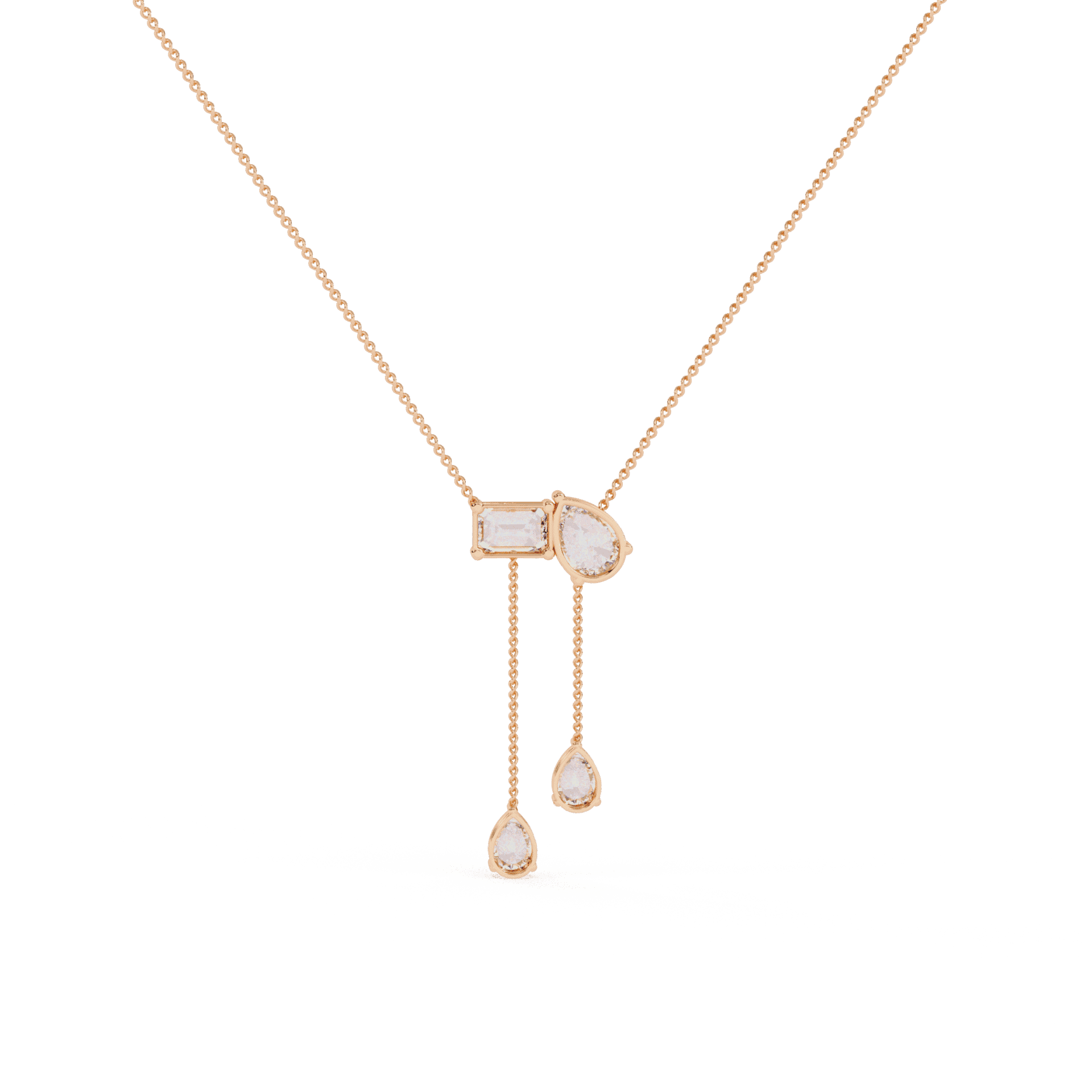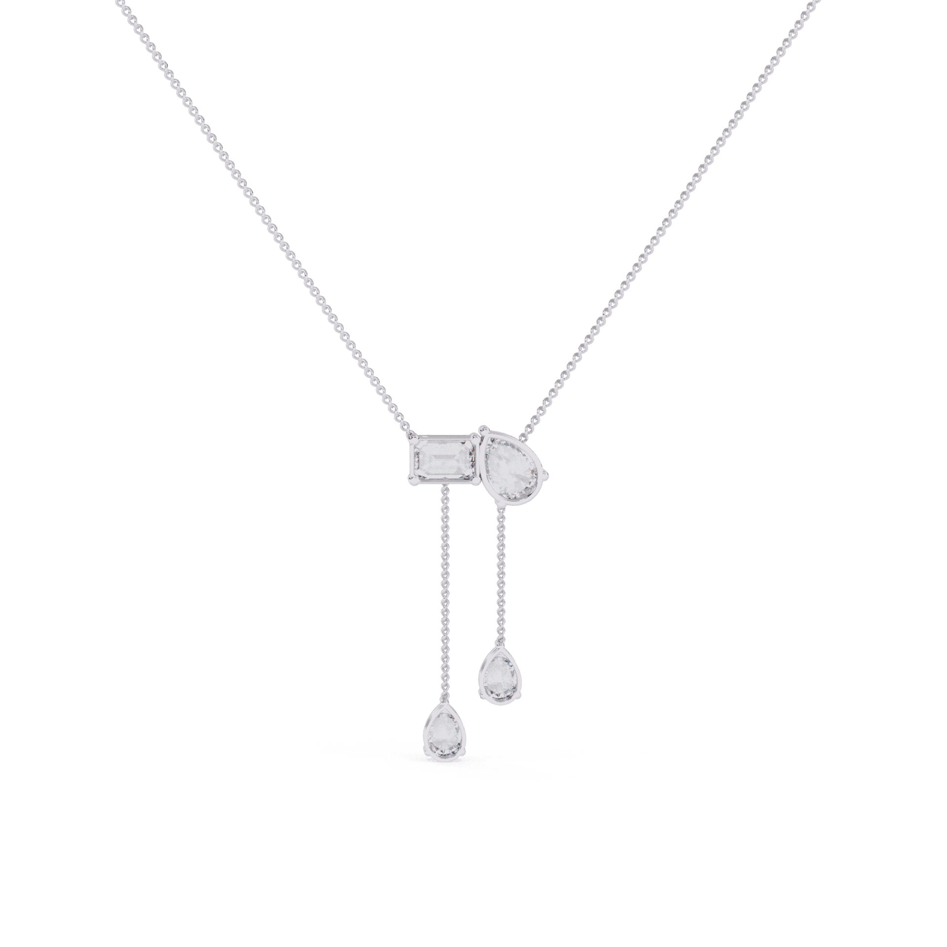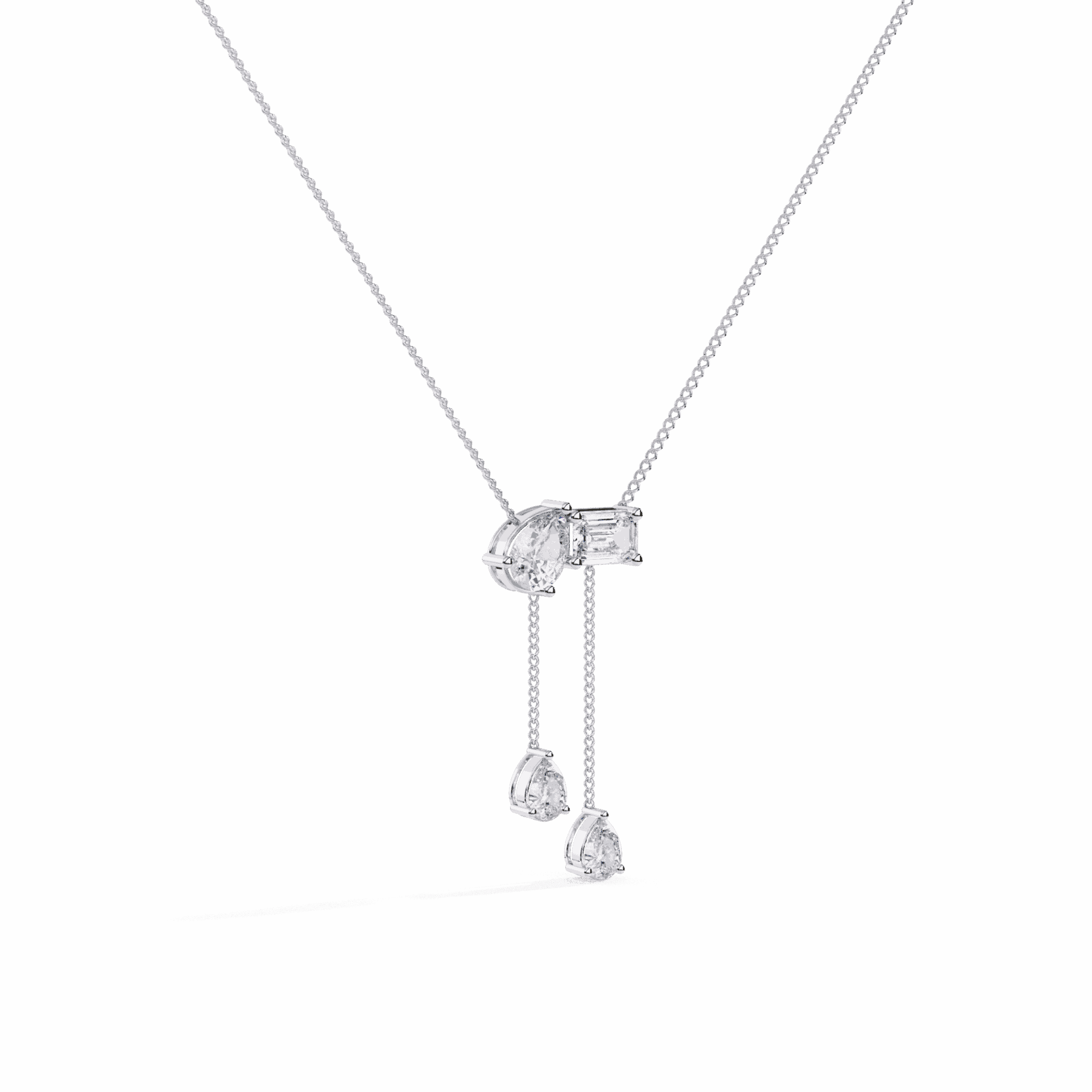 Four lab-grown diamonds – emerald and pear cuts combined in a delicate vertical silhouette. The emerald’s flash contrasts with the pear’s brilliance, creating sophisticated tension.