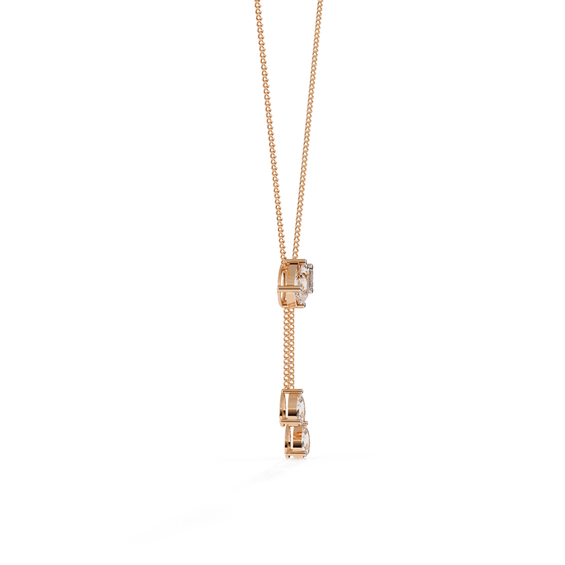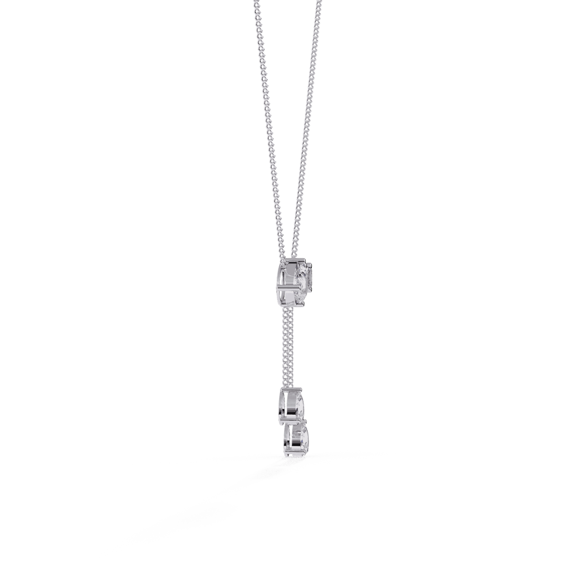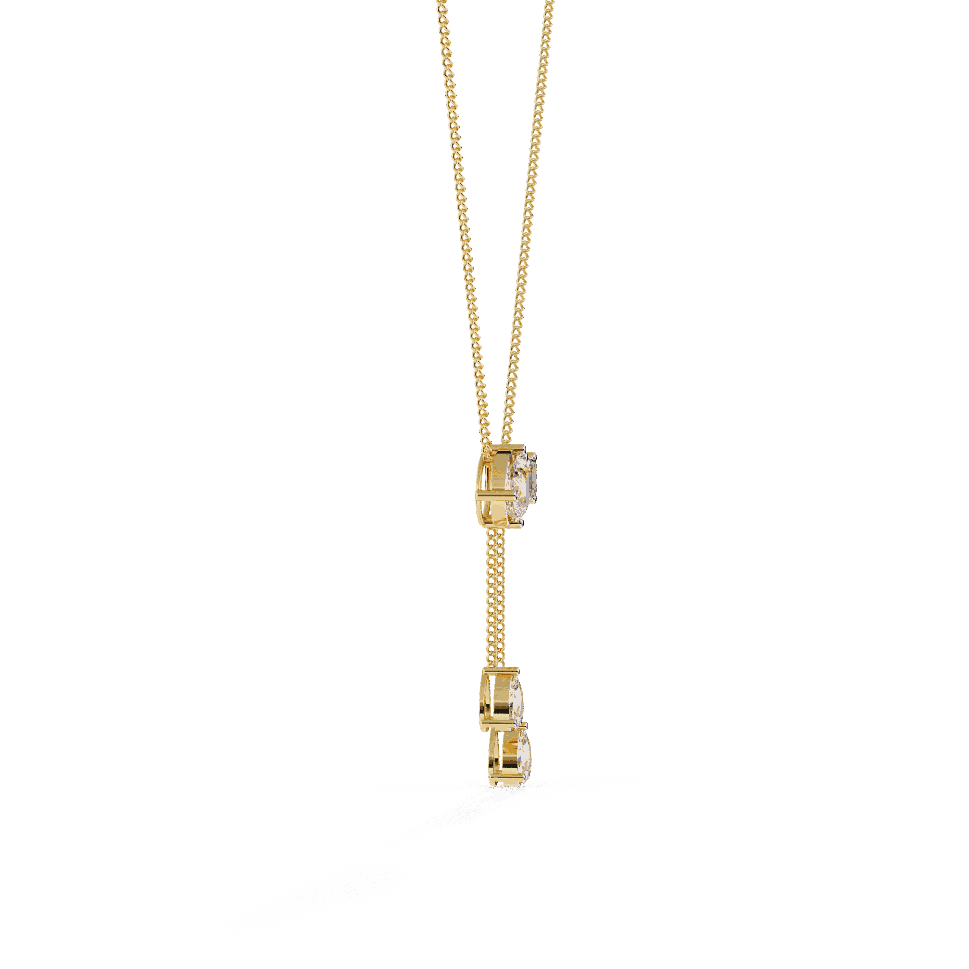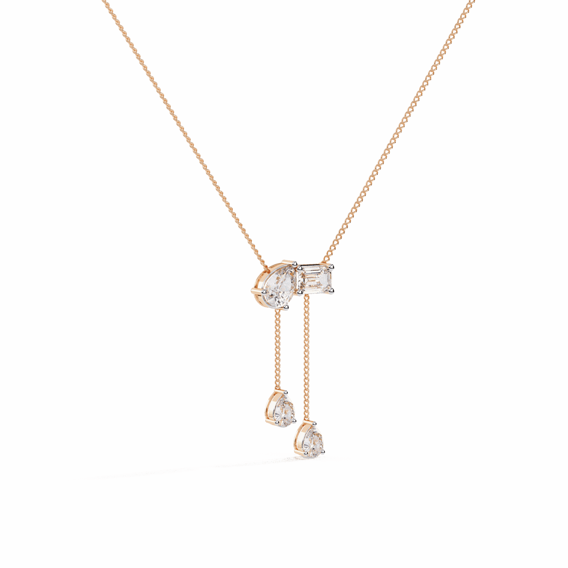 Four lab-grown diamonds – emerald and pear cuts combined in a delicate vertical silhouette. The emerald’s flash contrasts with the pear’s brilliance, creating sophisticated tension.