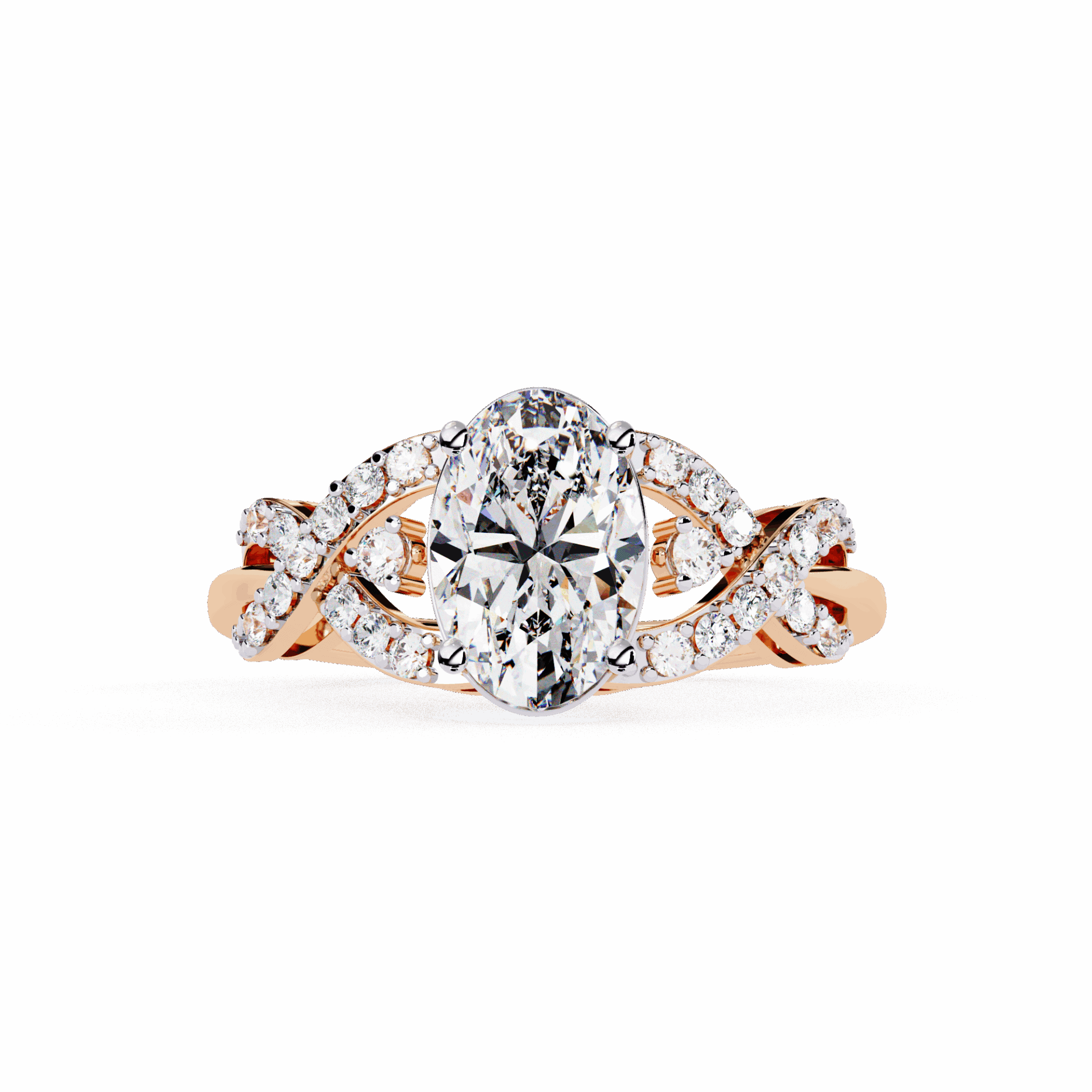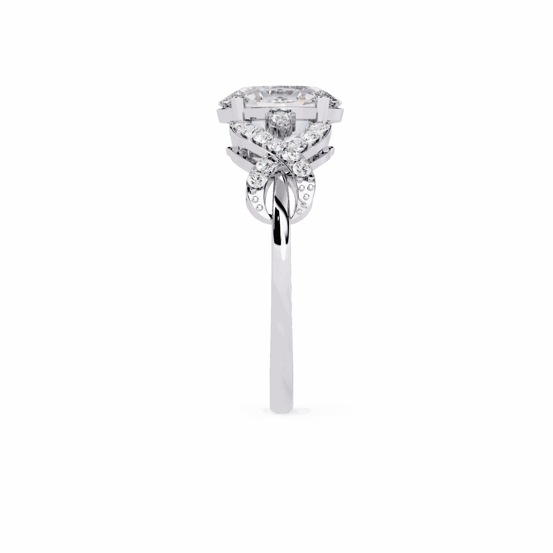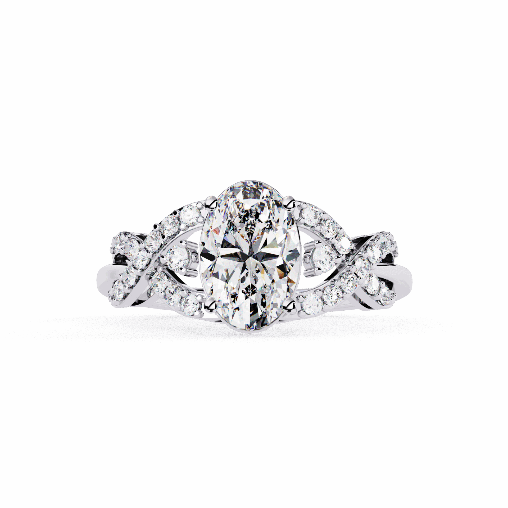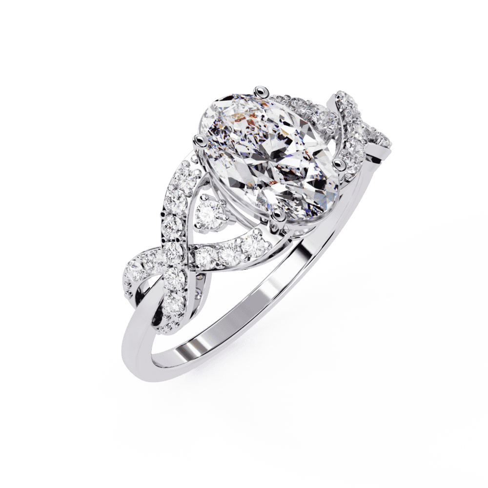 An oval-cut lab-grown diamond with 25 accent diamonds totaling 1.8 carats. Flattering shape that works from dawn to dusk.