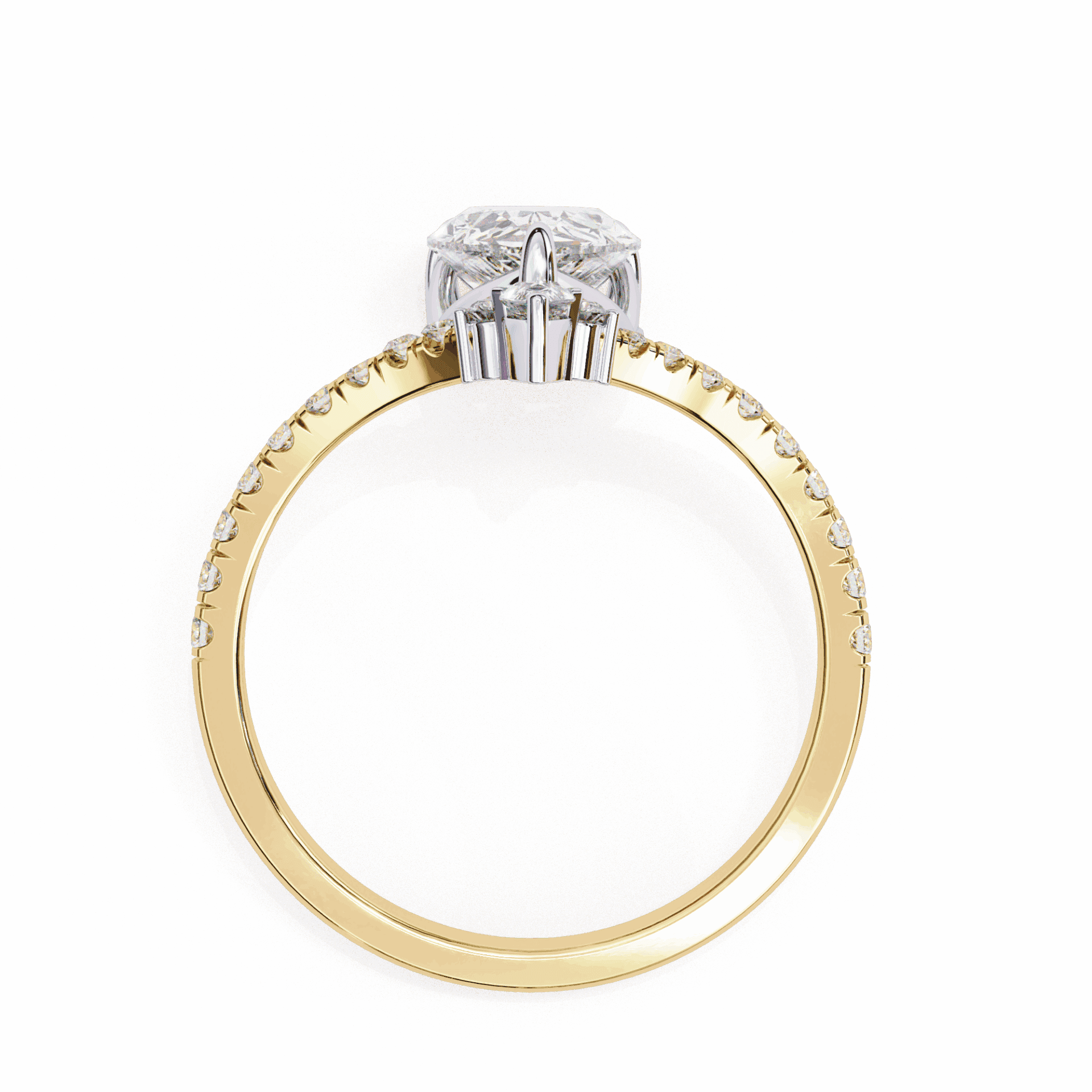 Bezel settings protect the pear’s delicate point while maintaining its dramatic direction.