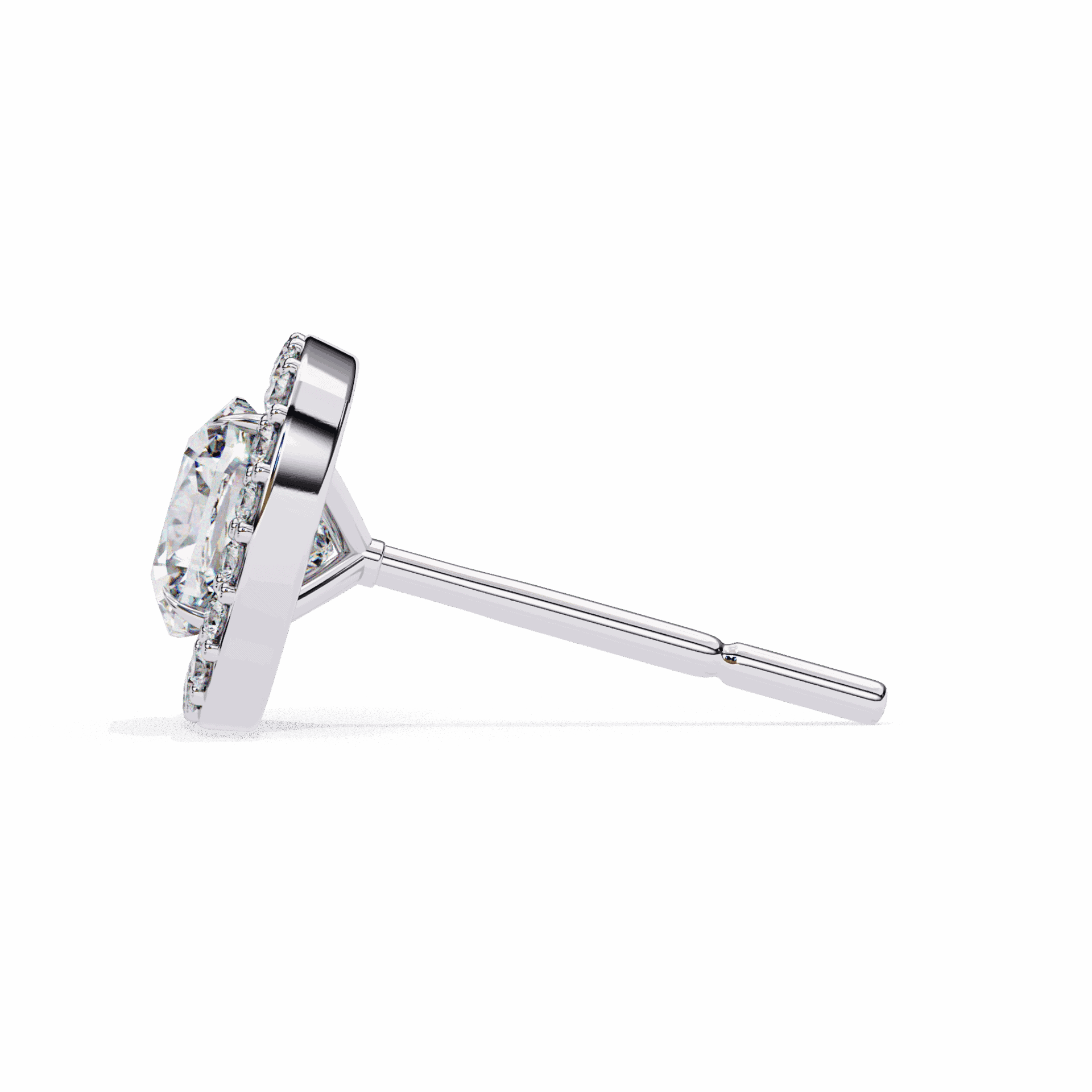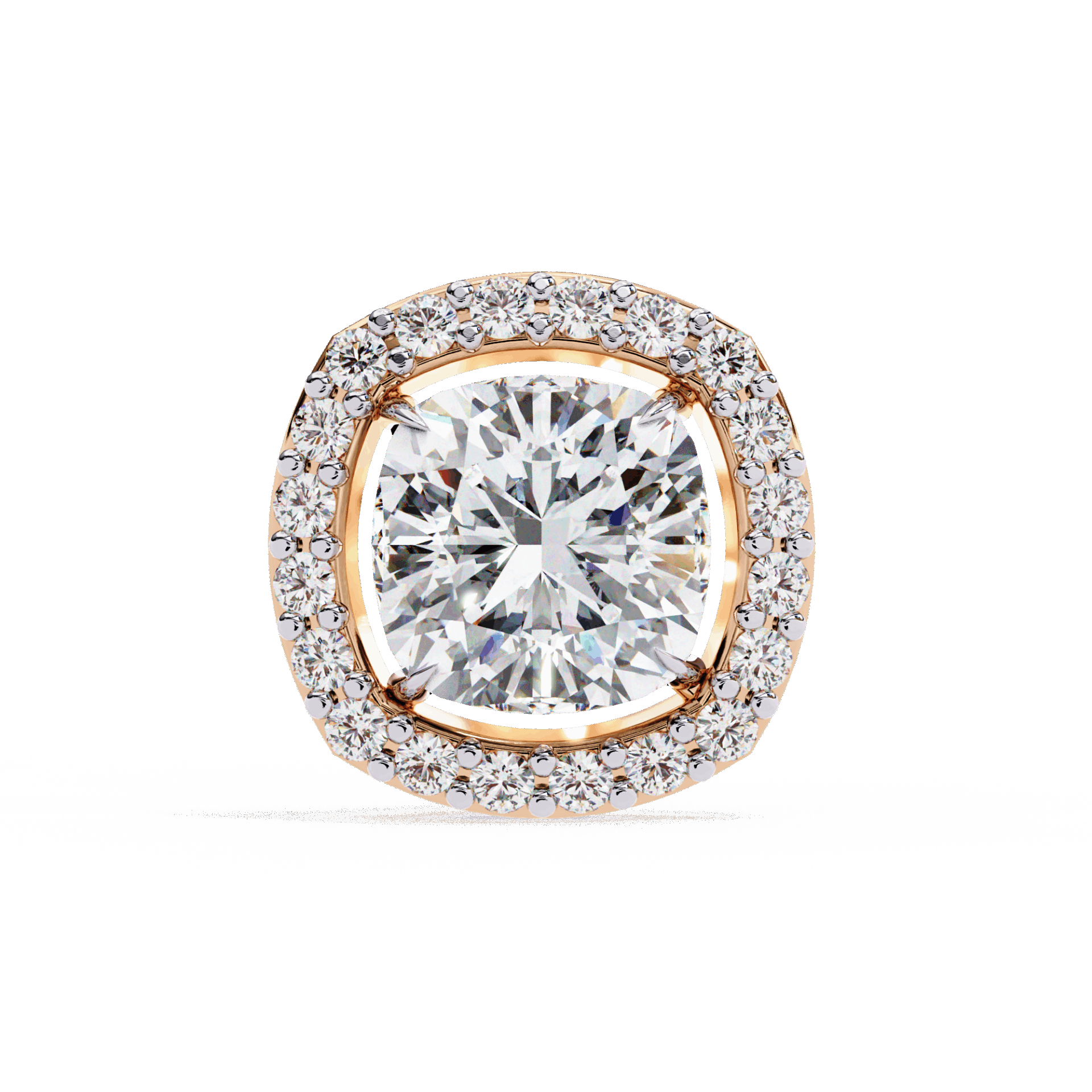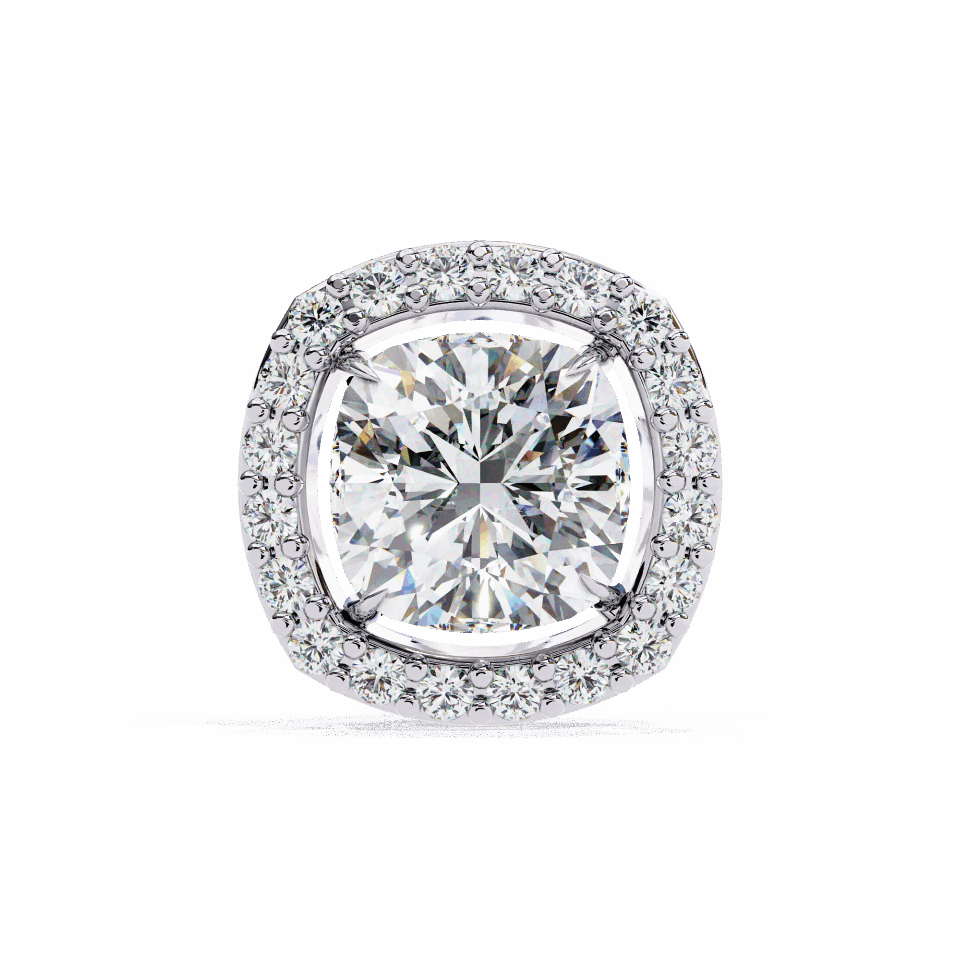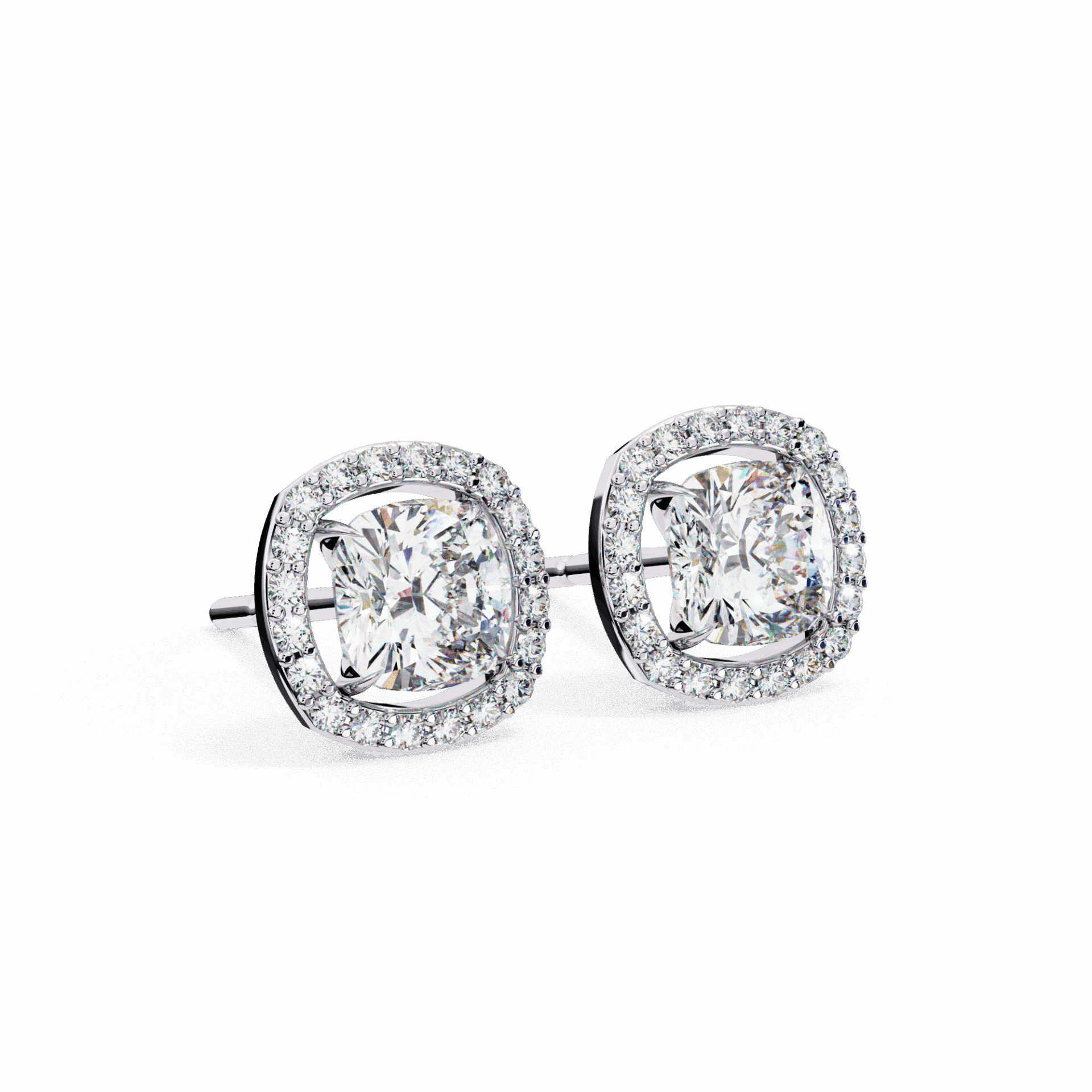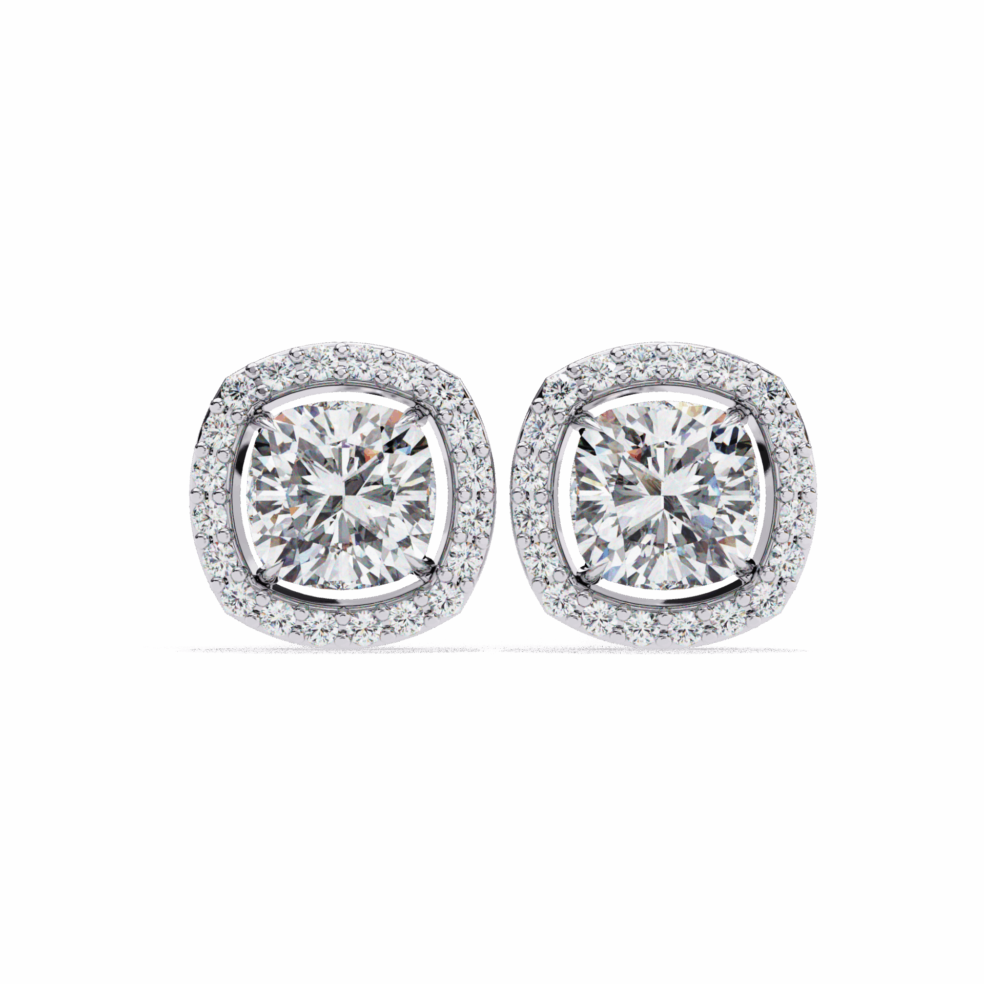 21 lab-grown diamonds - cushion-cut centers surrounded by round halos - totaling 0.96 carats. The cushion's romantic glow is amplified by the brilliant-cut frame.