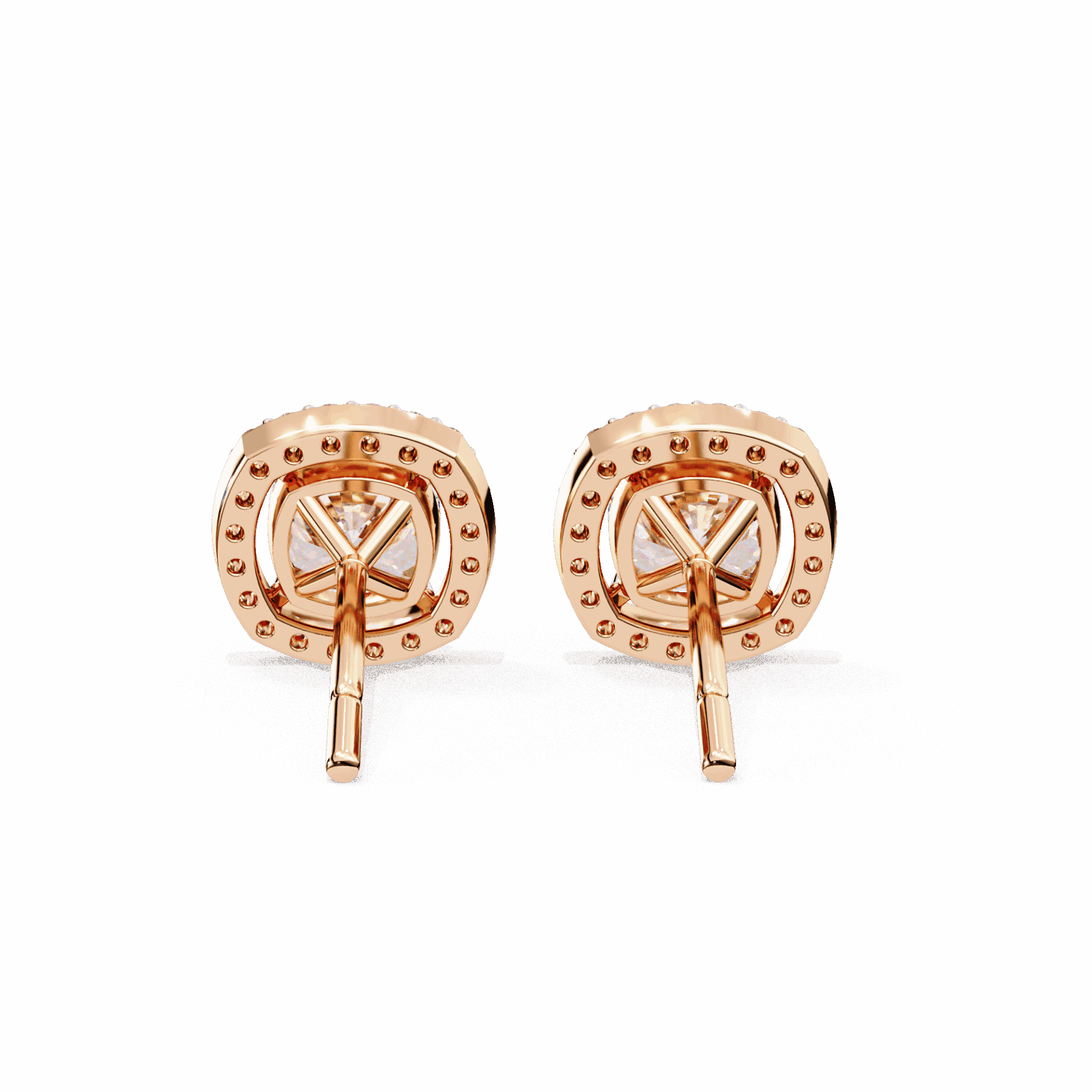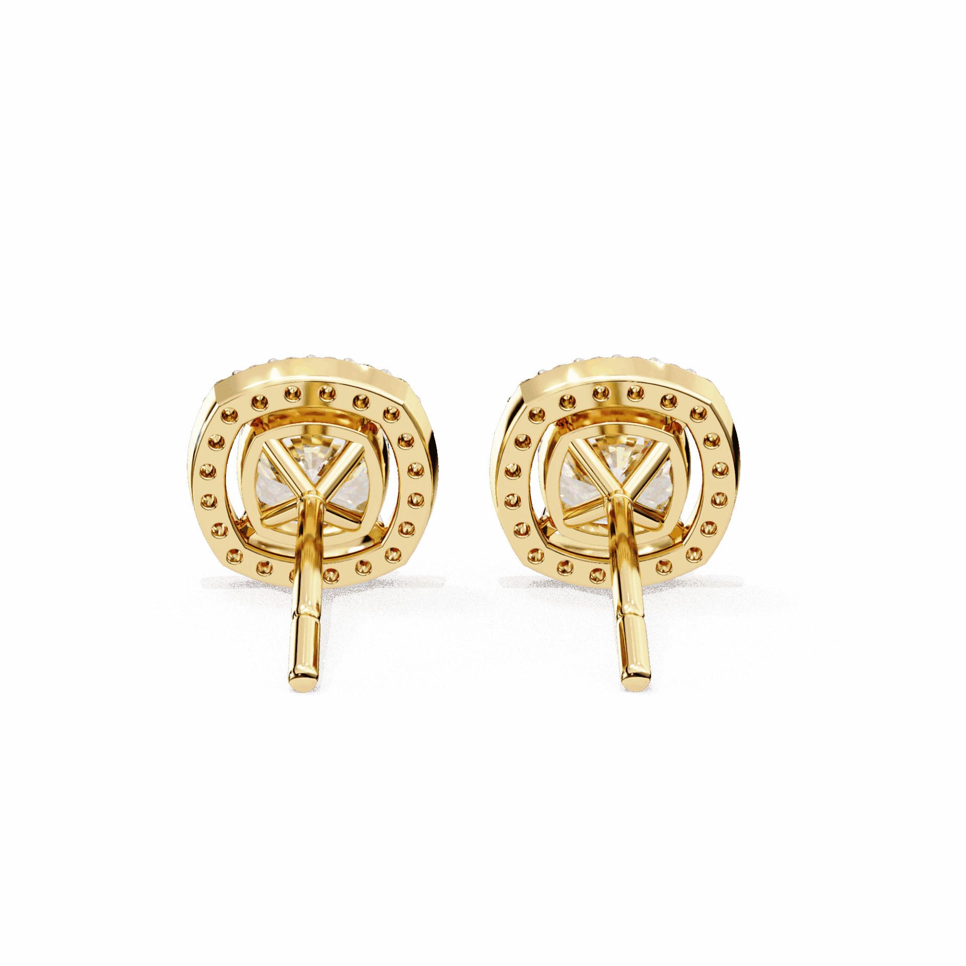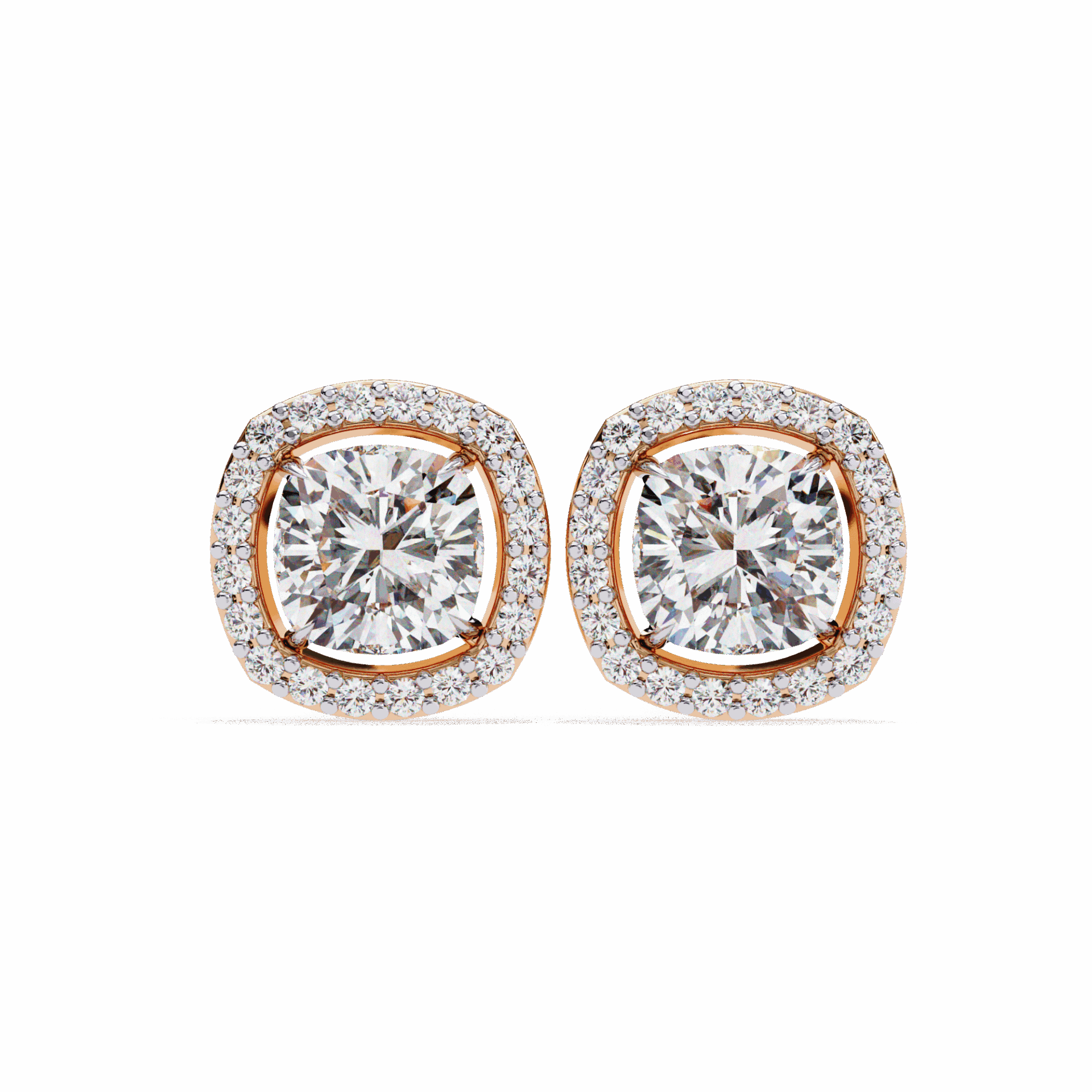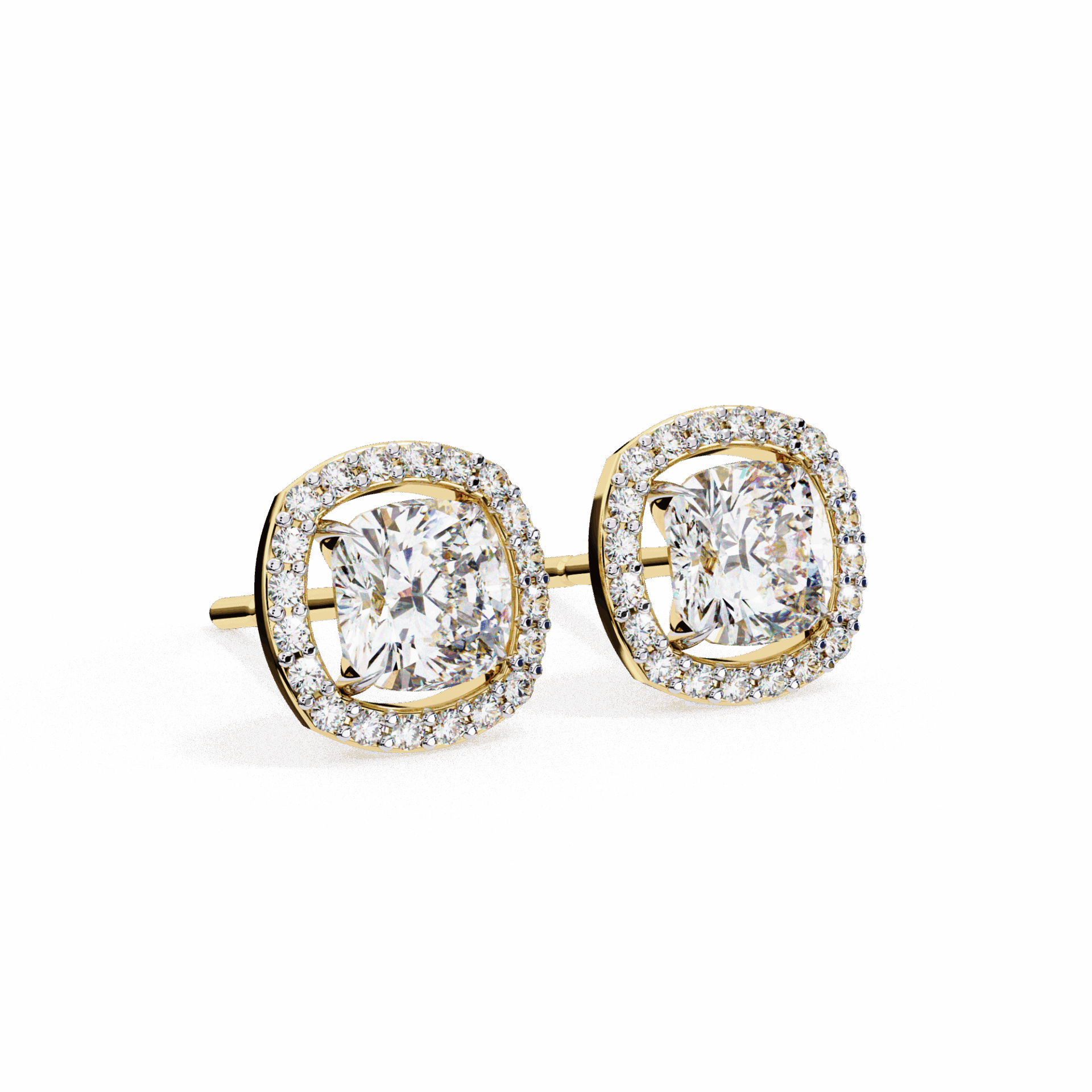 21 lab-grown diamonds – cushion-cut centers surrounded by round halos – totaling 0.96 carats. The cushion’s romantic glow is amplified by the brilliant-cut frame.