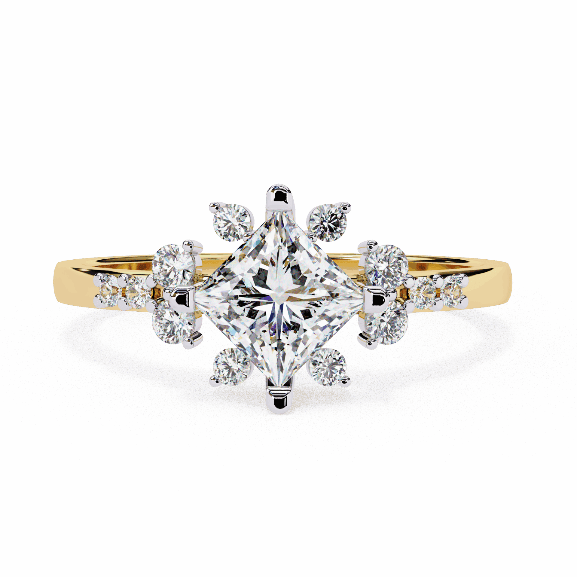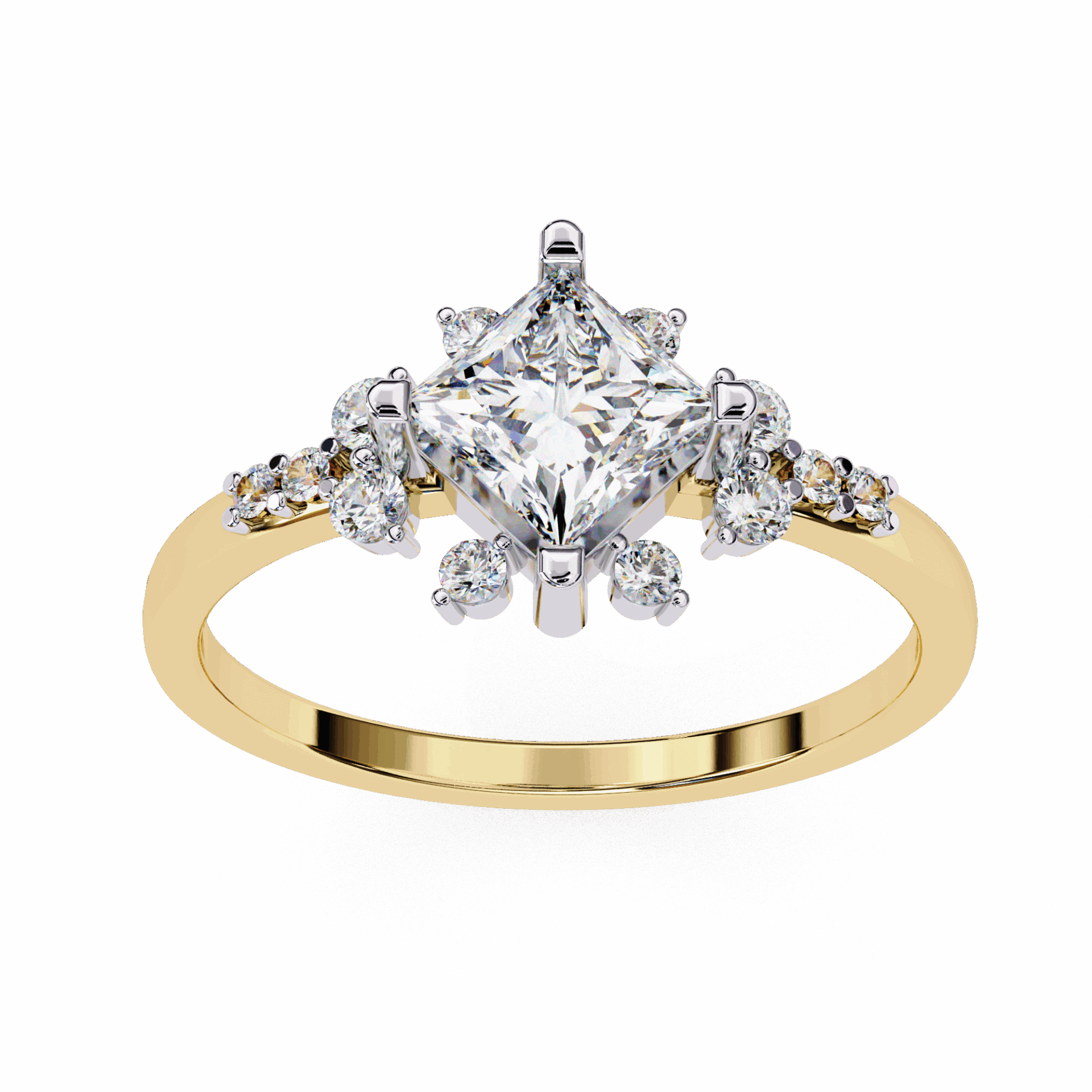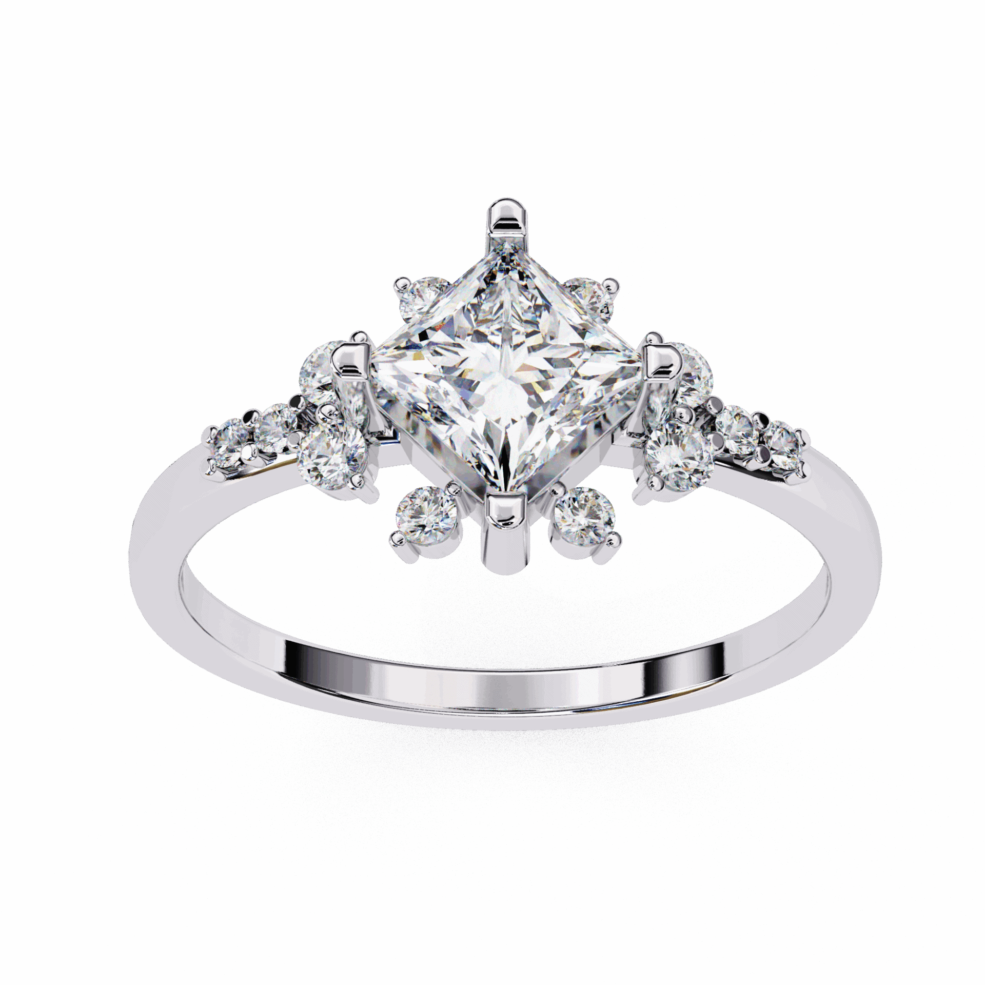 A princess-cut lab-grown diamond with 13 accent diamonds totaling 1.01 carats. Geometric fire refined for daily wear.