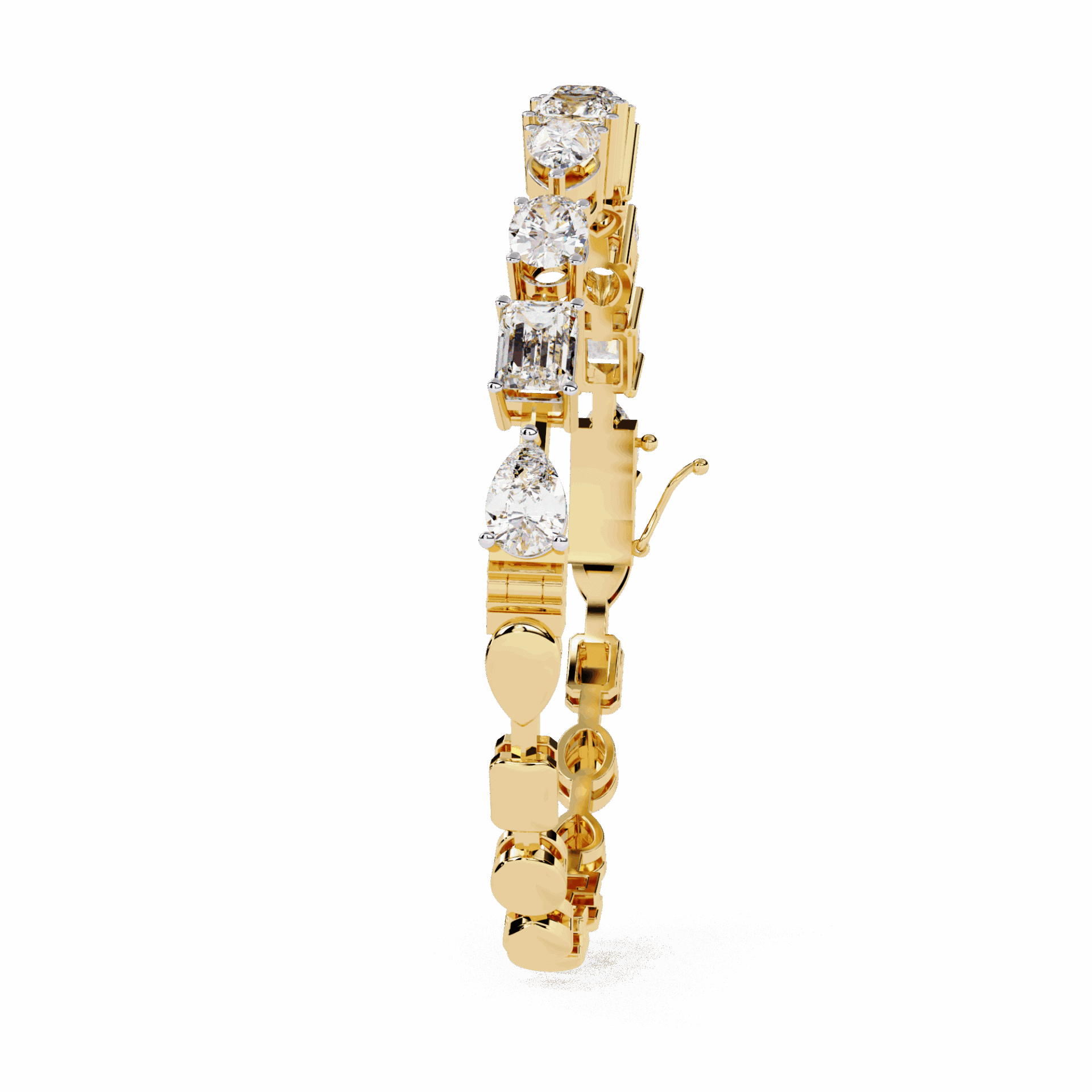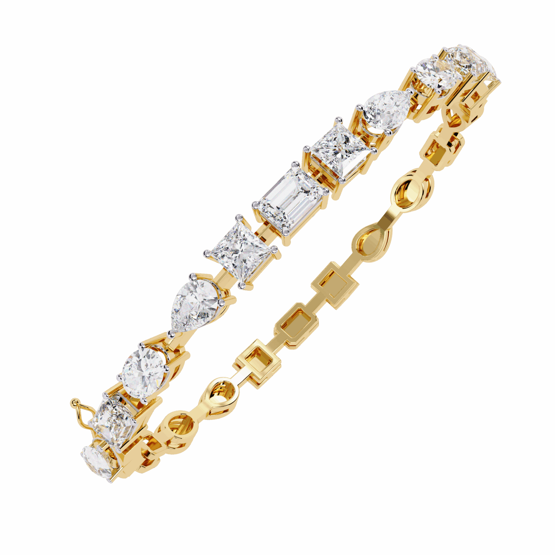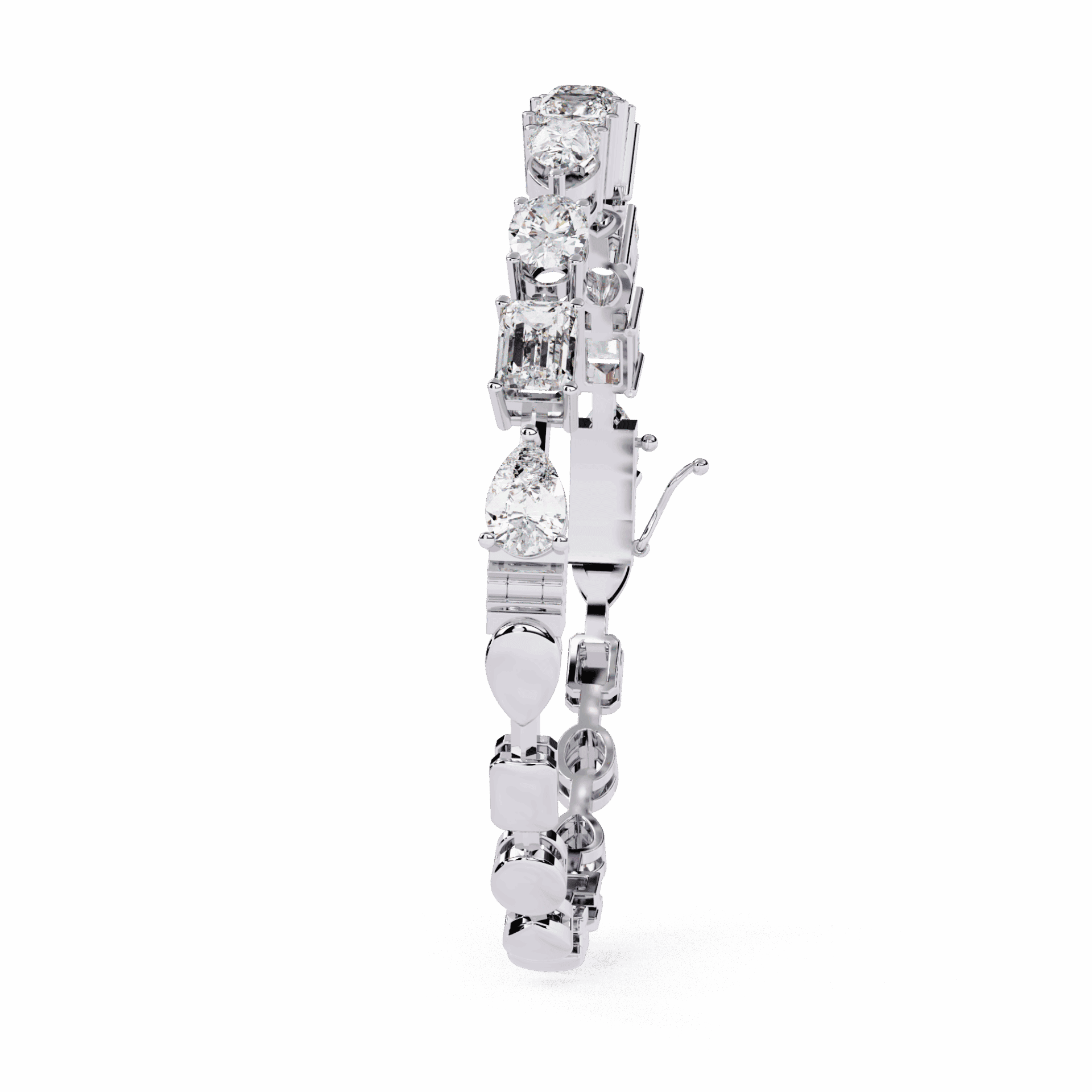 23 substantial lab-grown diamonds in alternating cuts - pear, emerald, oval, princess, round - set in a tennis formation. Each stone is large enough to appreciate individually. Together, they're extraordinary.