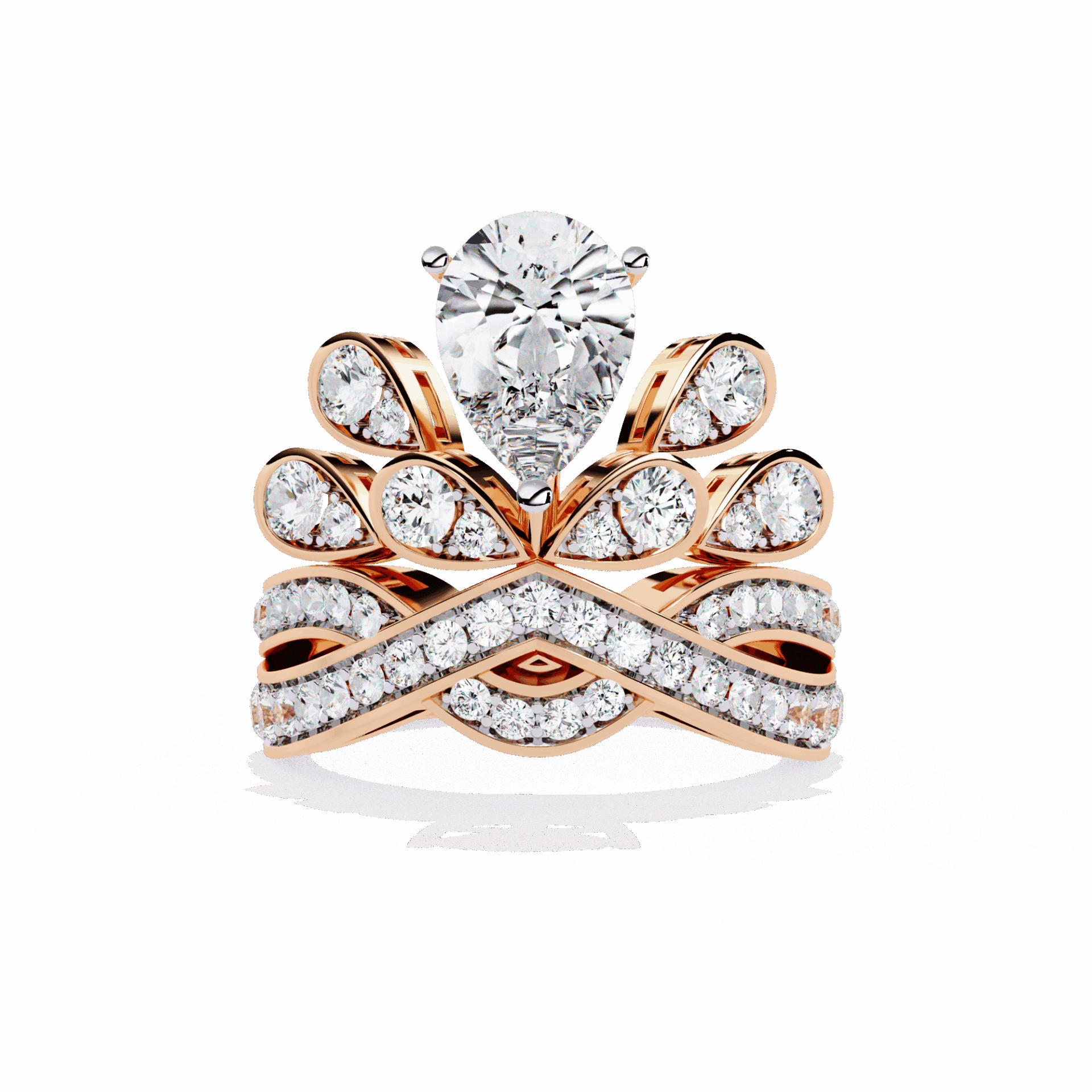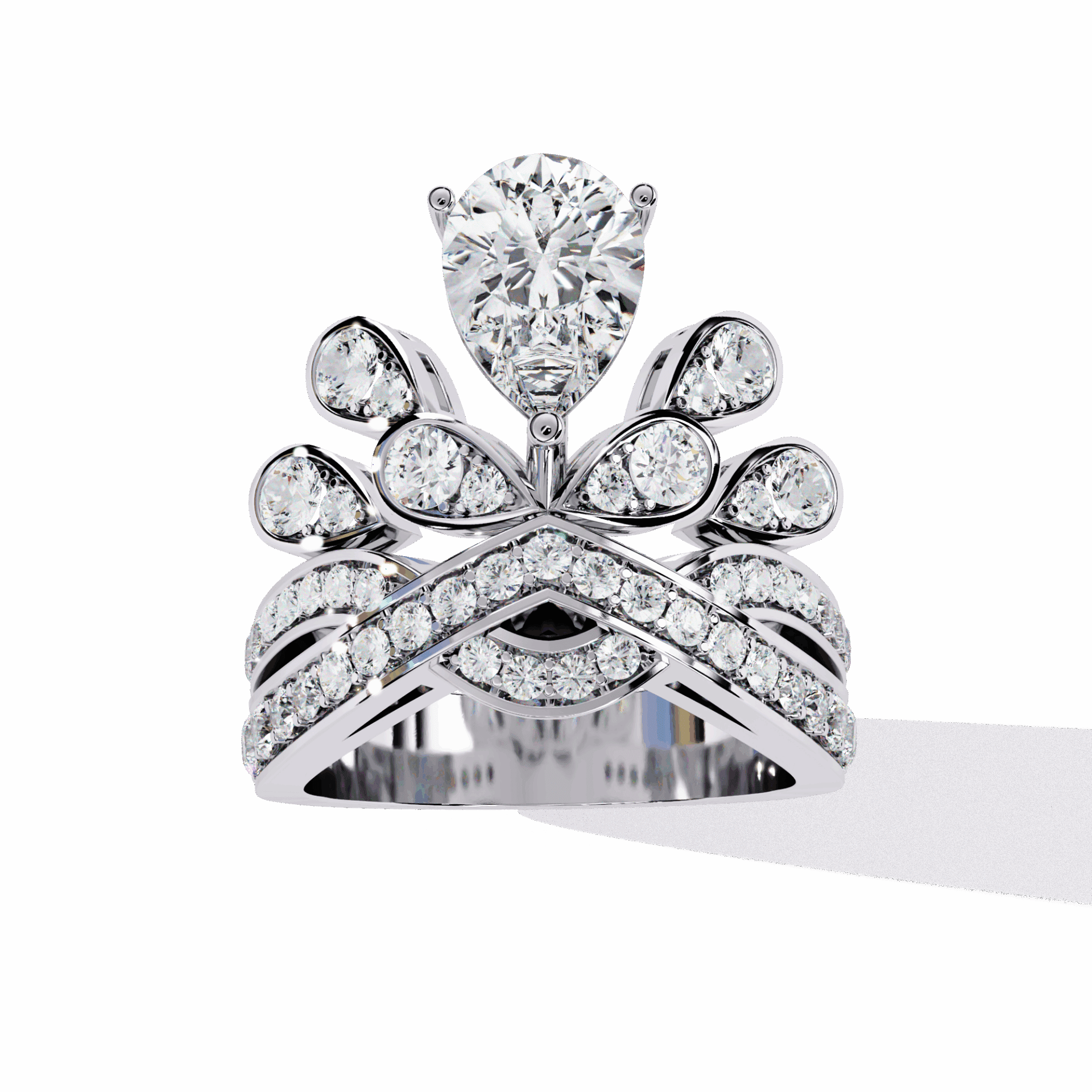 A pear-cut lab-grown diamond with 54 accent diamonds totaling 2.13 carats. Teardrop brilliance in an elaborate cocktail setting.