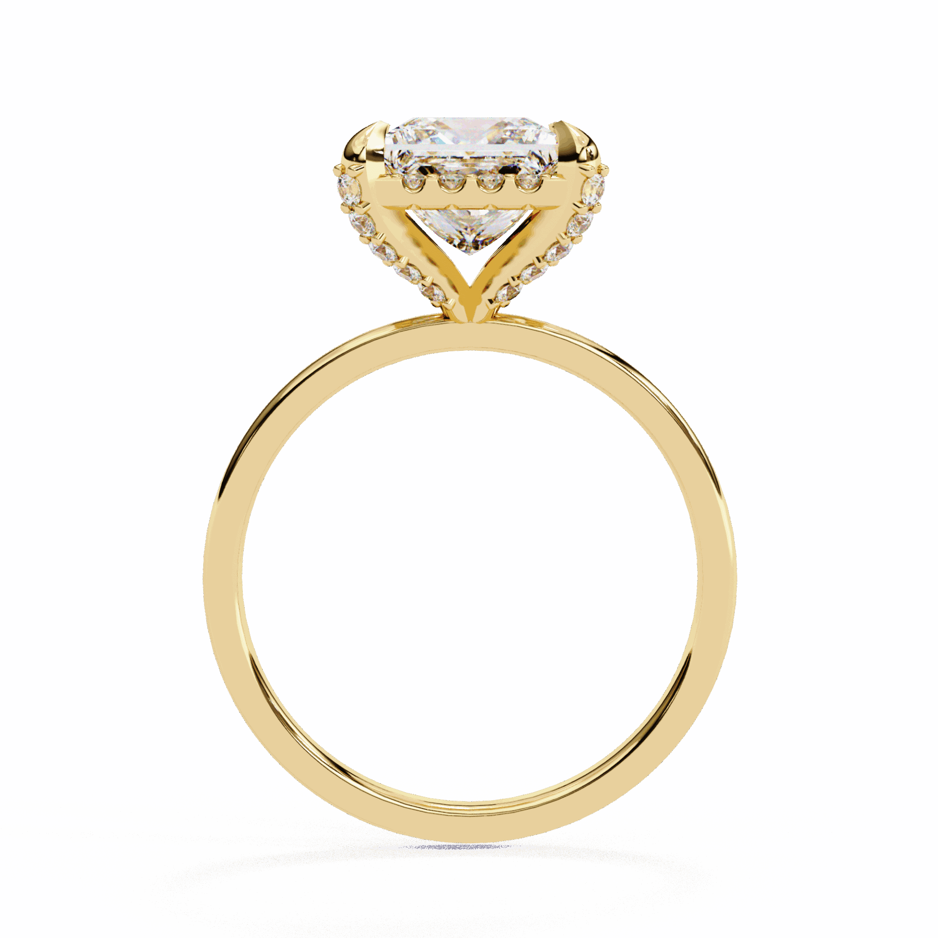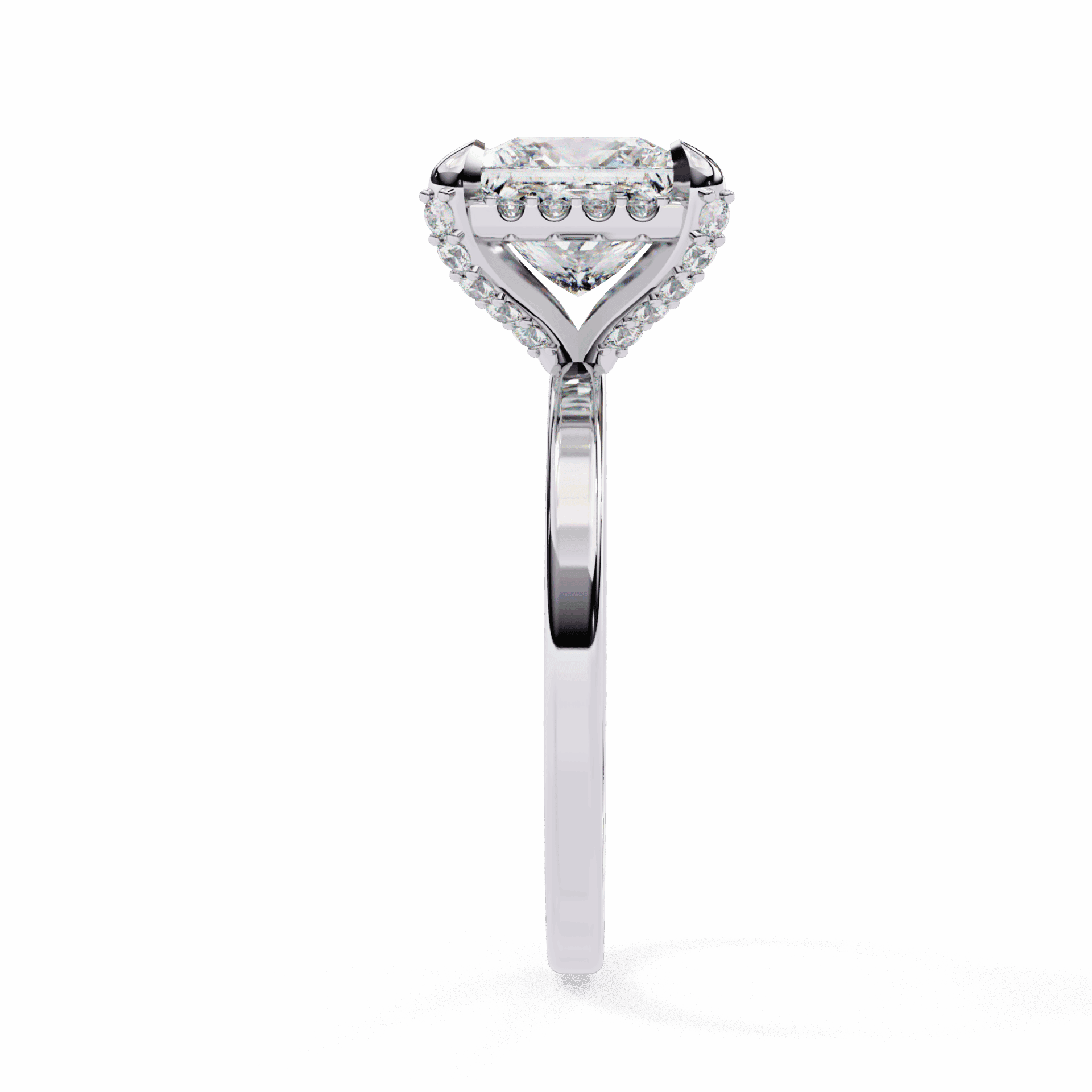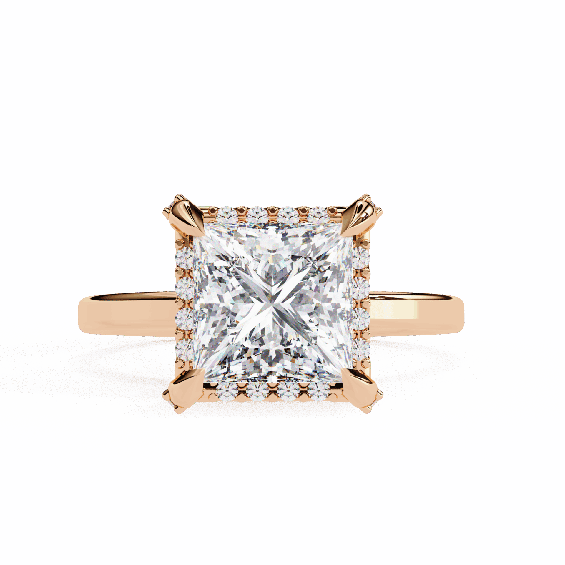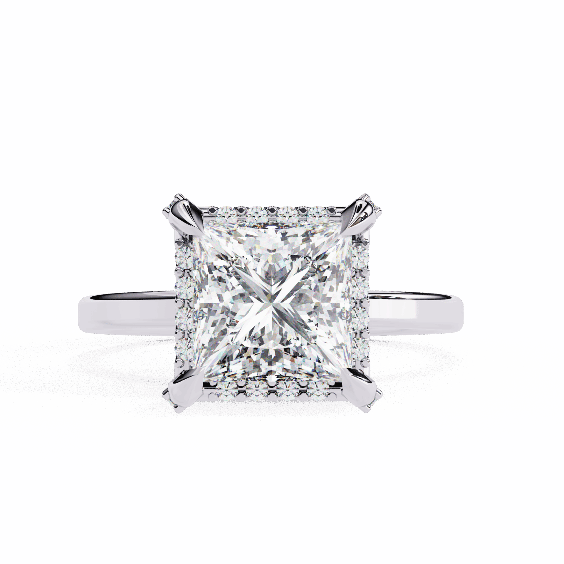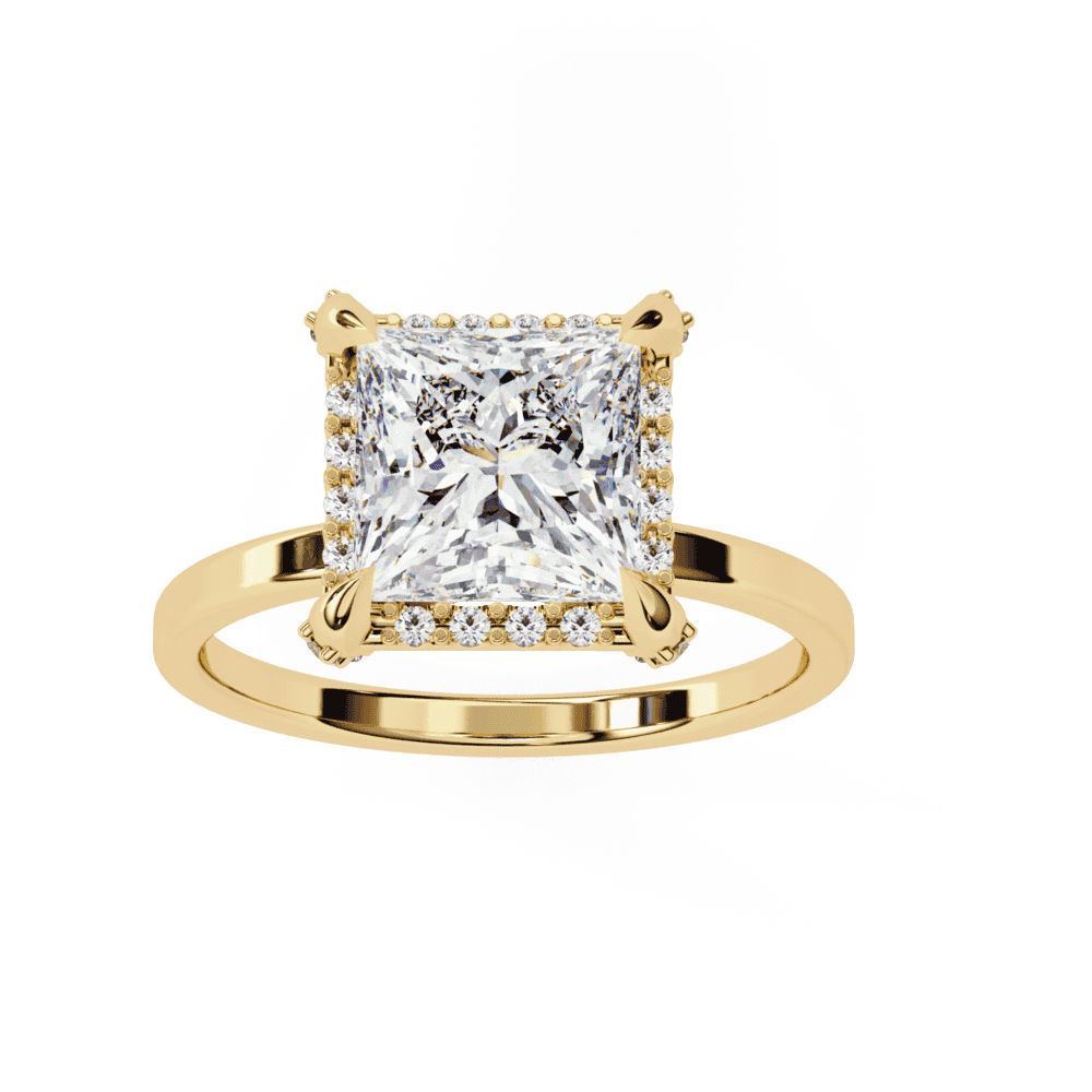 A princess-cut lab-grown diamond with 37 accent diamonds totaling 2.22 carats. Geometric fire in a classic band setting.
