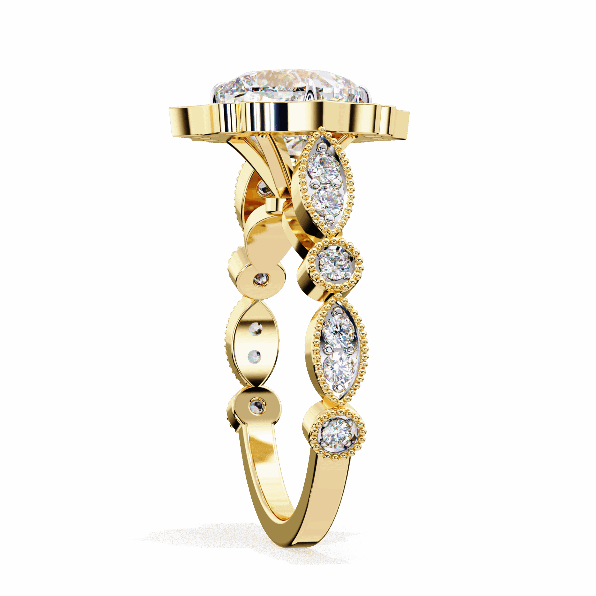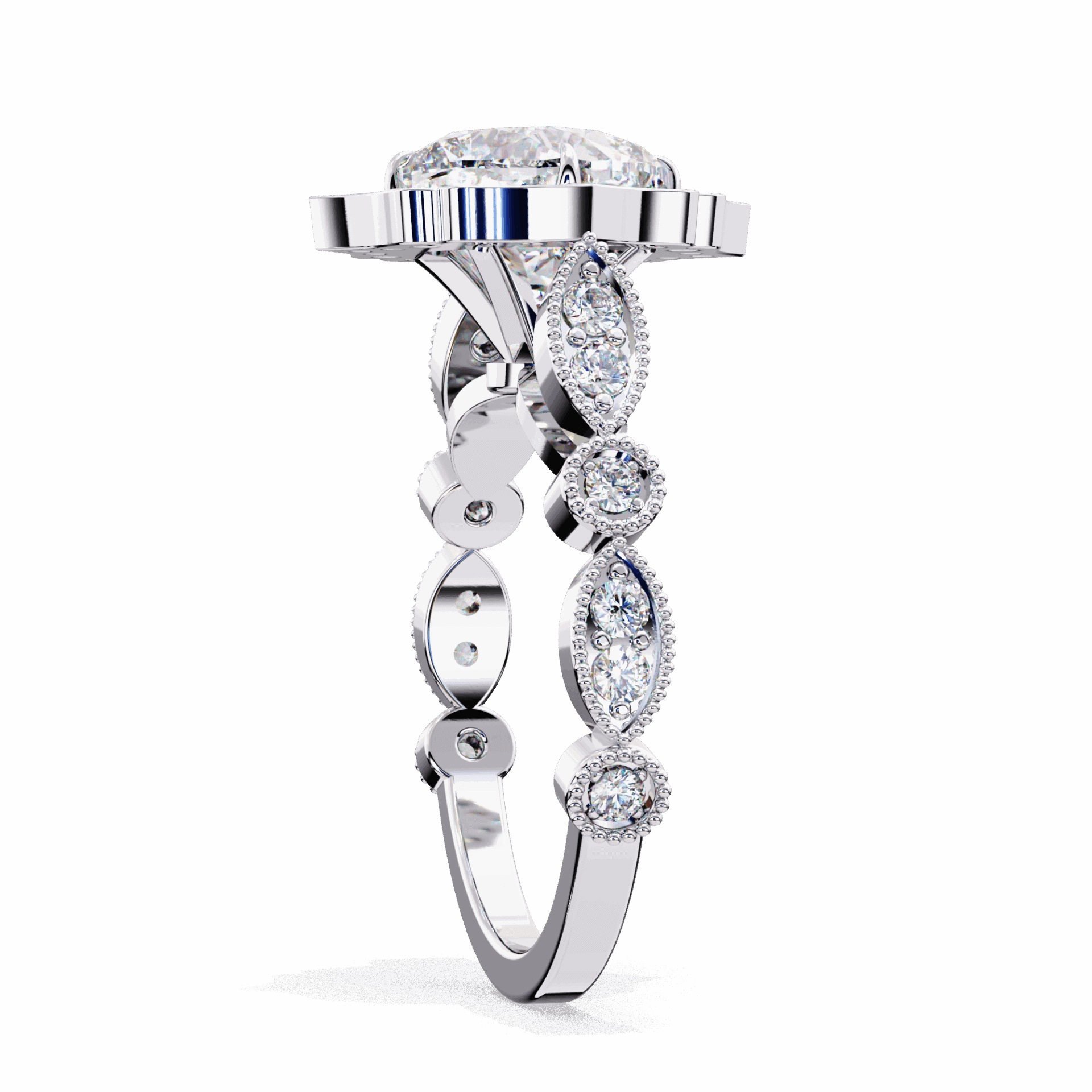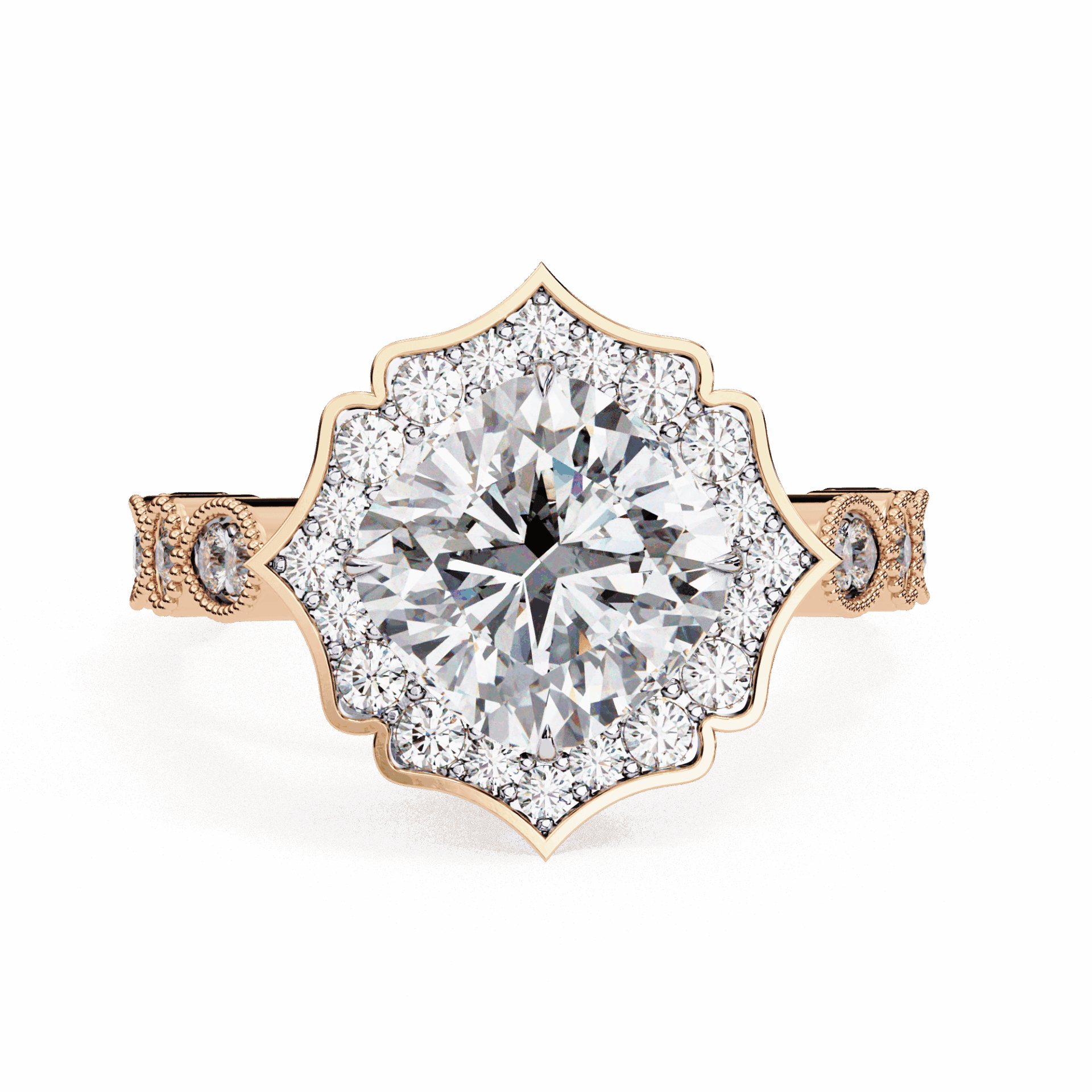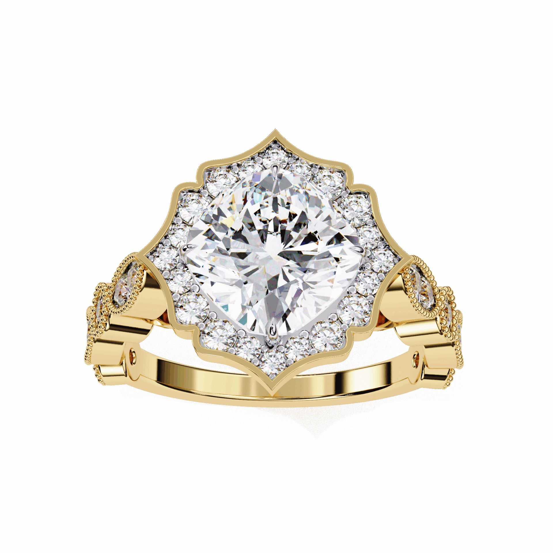 A cushion-cut lab-grown diamond with 33 side stone accent diamonds totaling 2.55 carats. Vintage glow enhanced by sparkling accents.