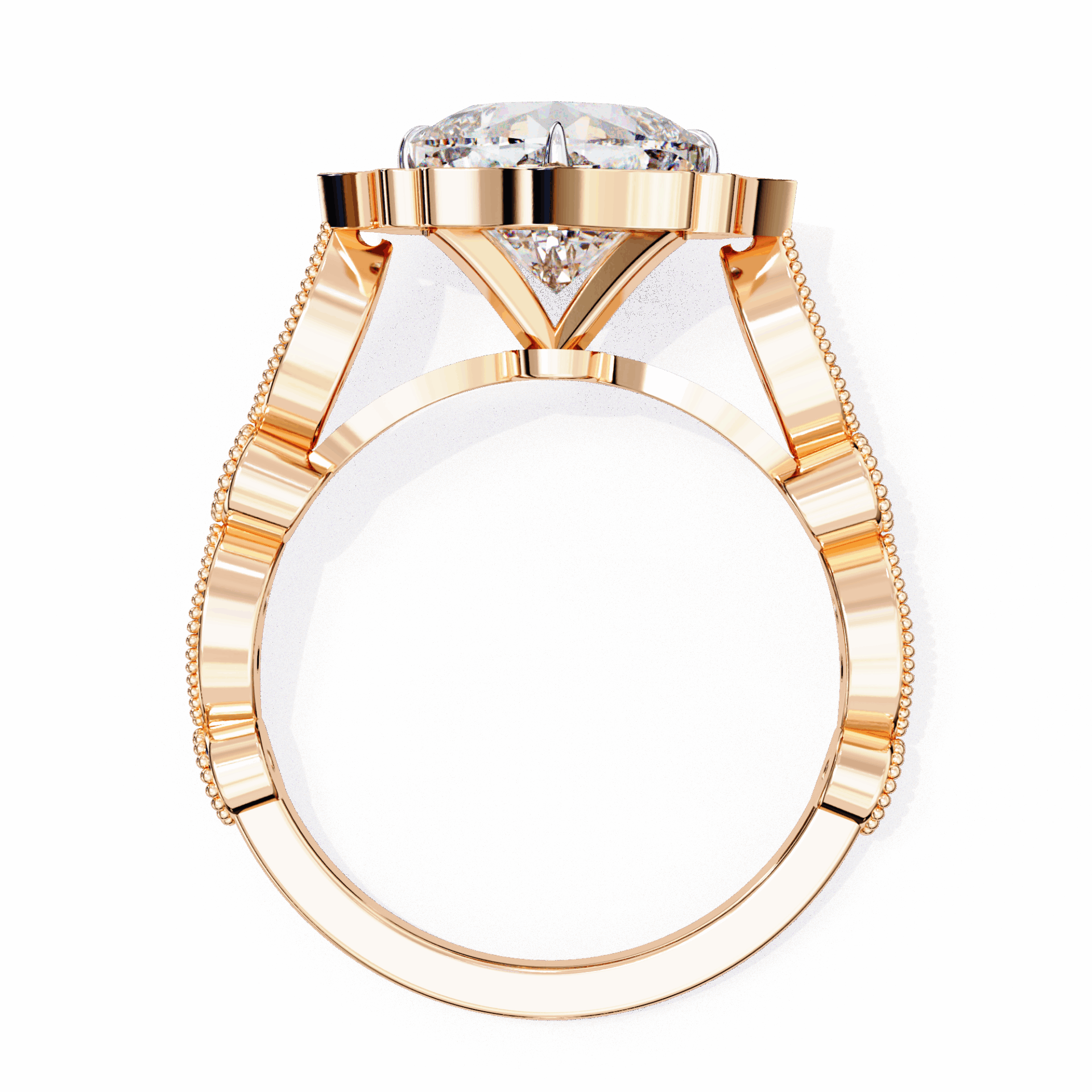 Cushion center. Side stone detail.