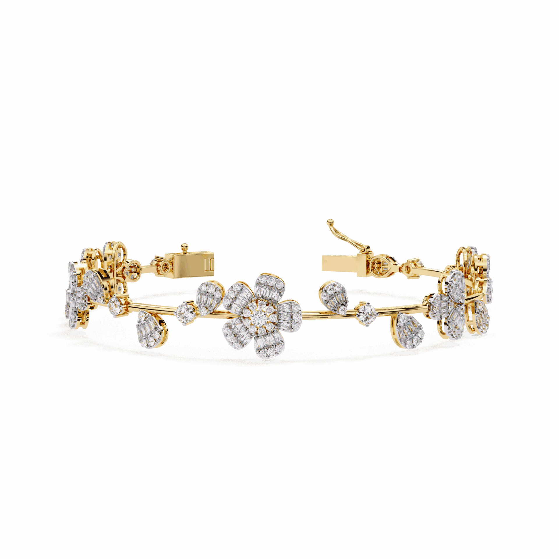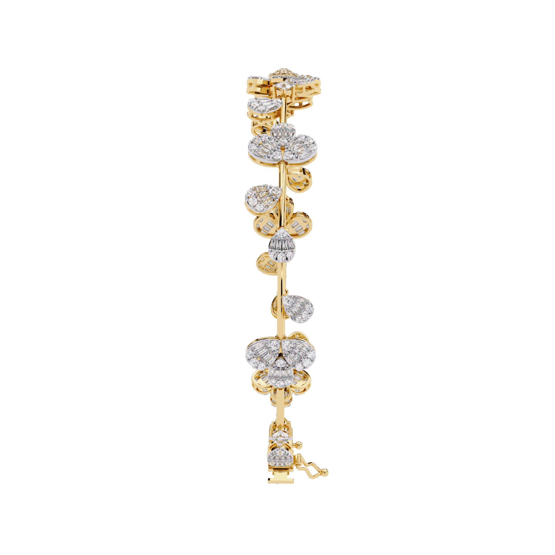 242 lab-grown diamonds – baguette cuts for flash, round cuts for brilliance – wrapping around a structured bangle. The mix of step-cut and brilliant-cut creates multidimensional sparkle. Light hits differently, everywhere.