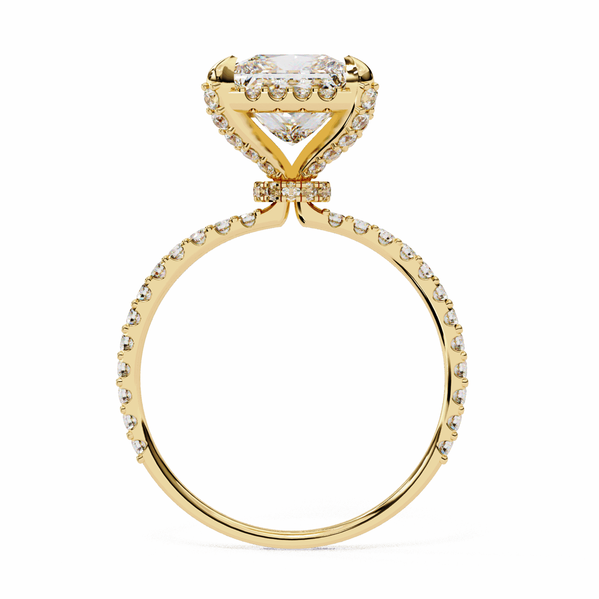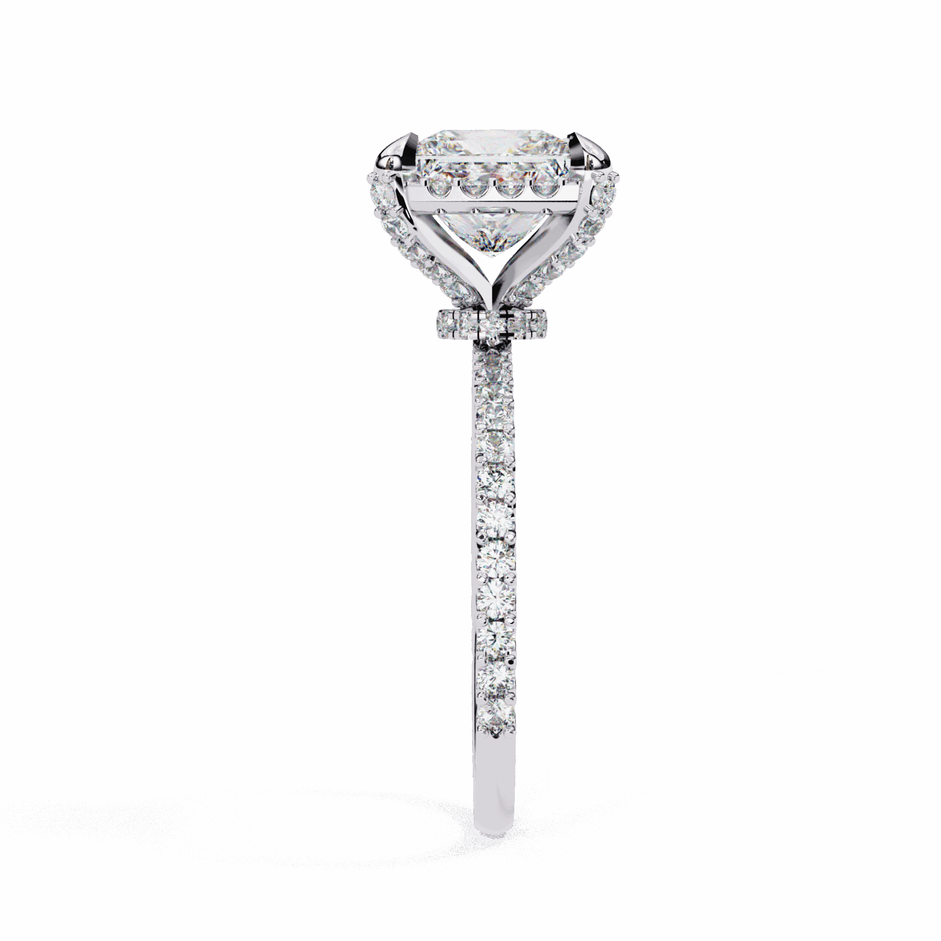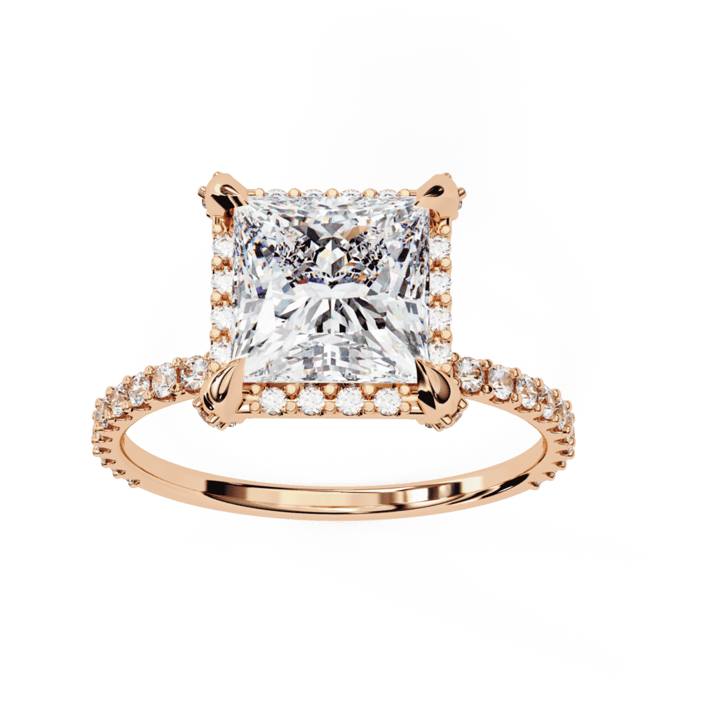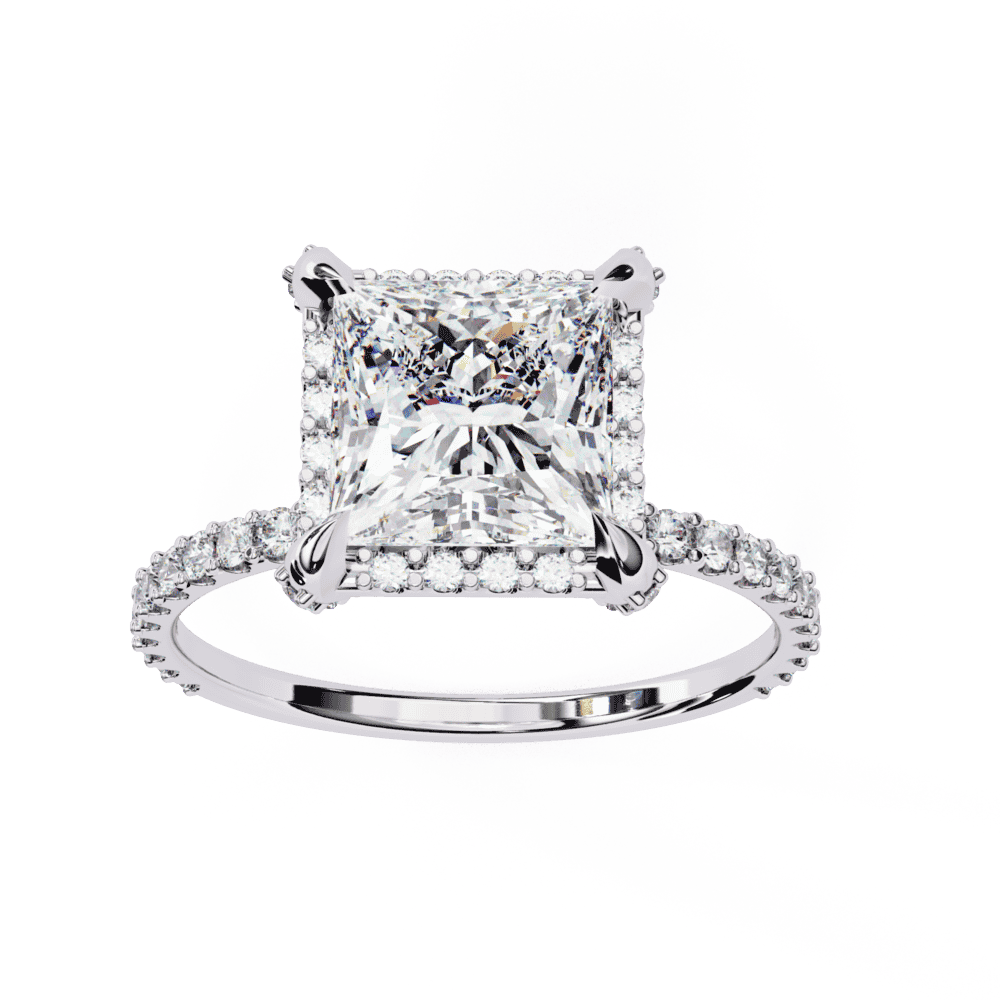 A princess-cut lab-grown diamond surrounded by 73 halo accent diamonds totaling 2.51 carats. The halo amplifies the princess’s angular brilliance.