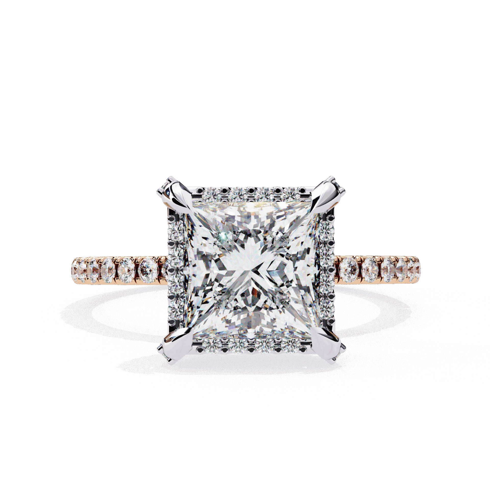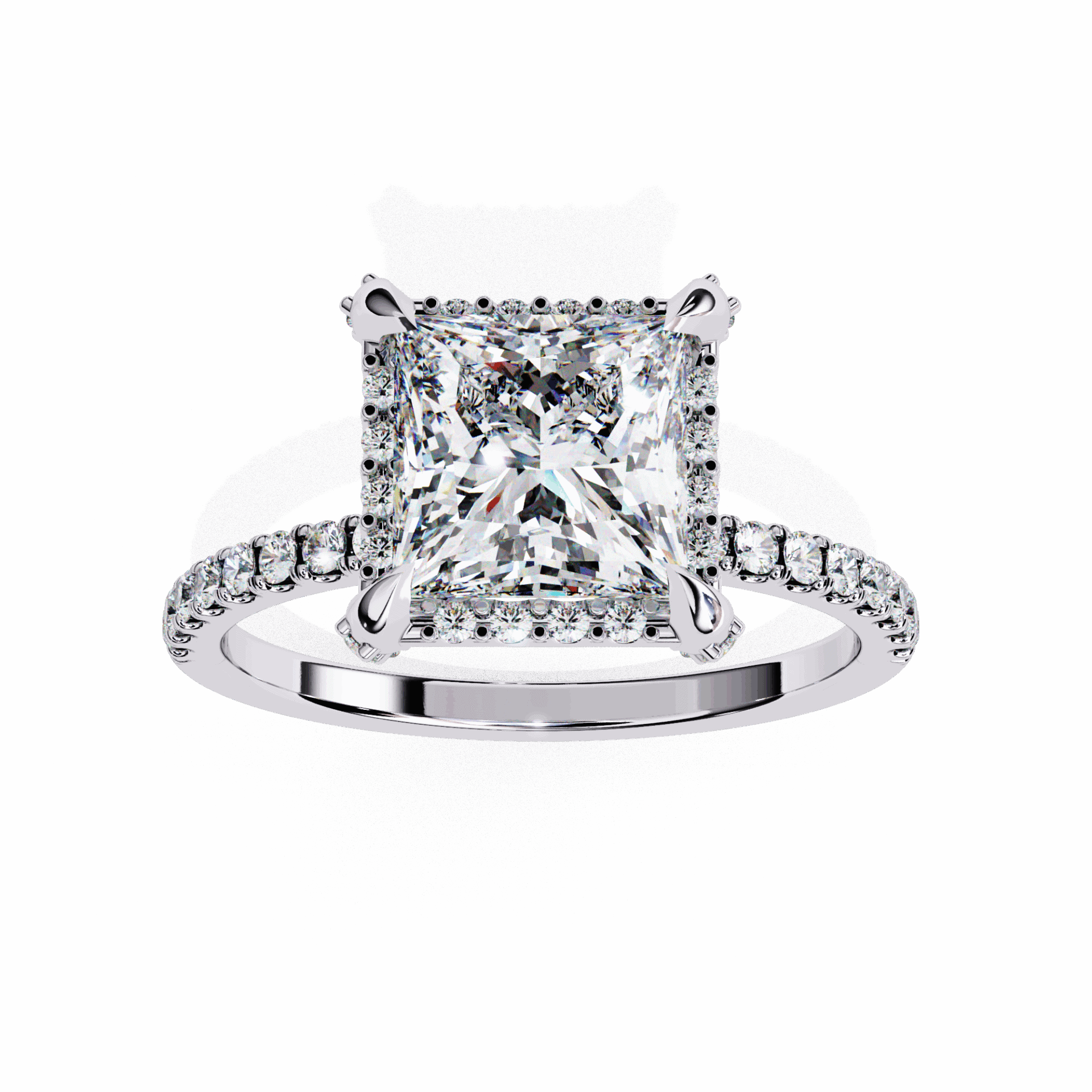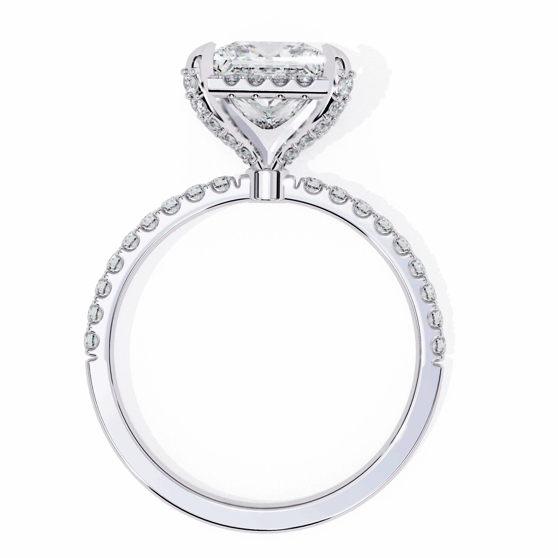 The hidden halo elevates the princess solitaire with surprise sparkle from every side.