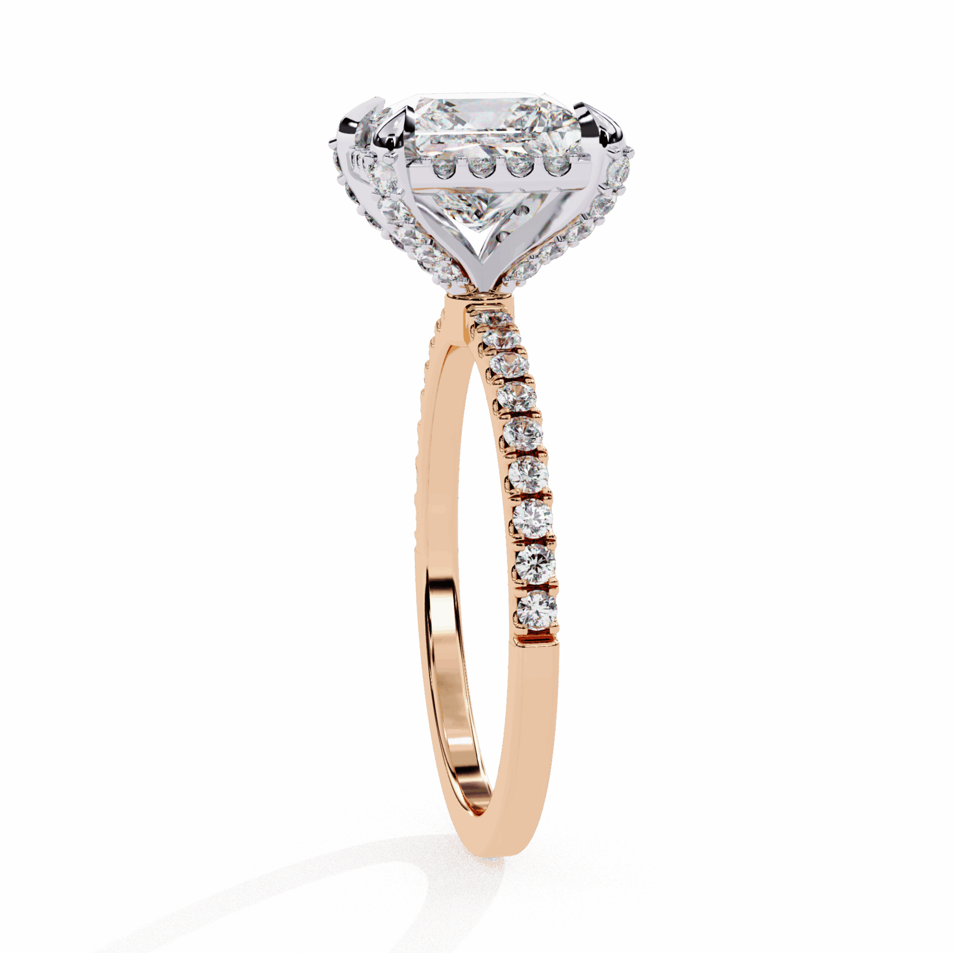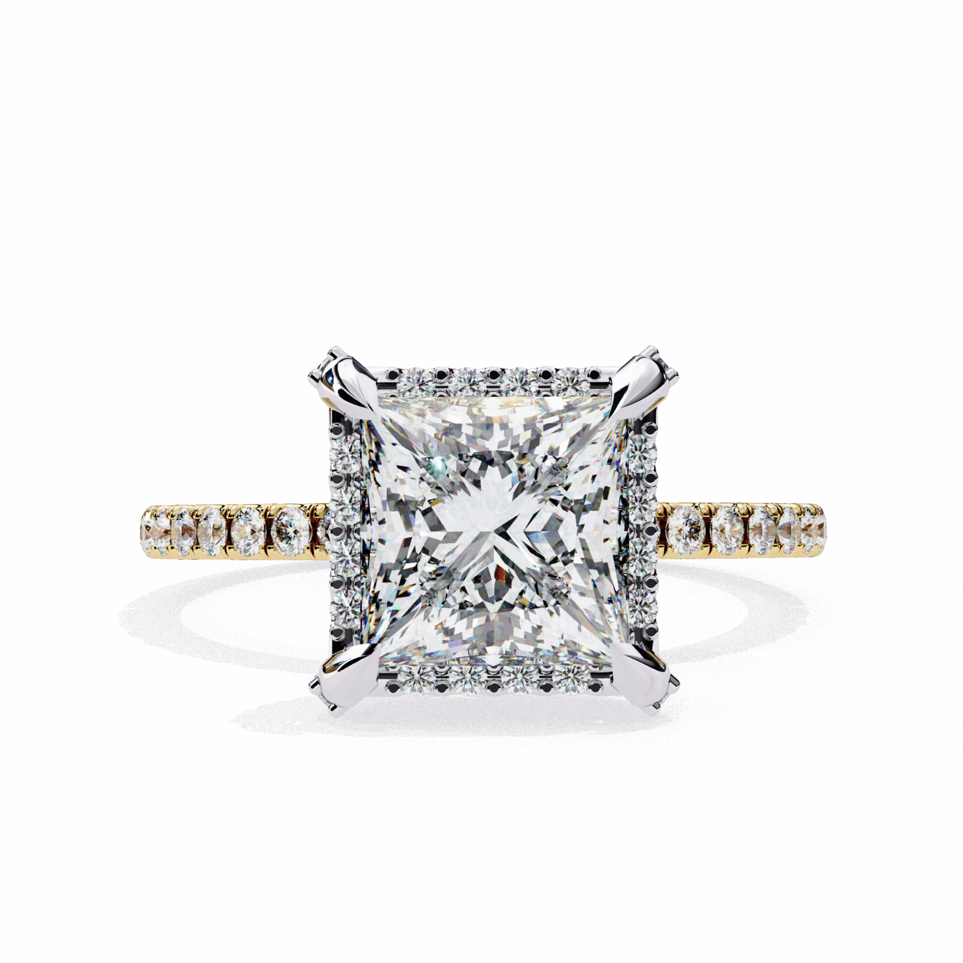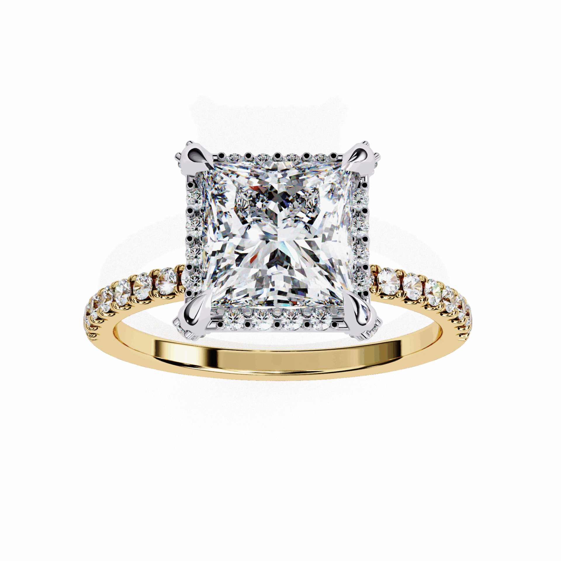 The hidden halo elevates the princess solitaire with surprise sparkle from every side.