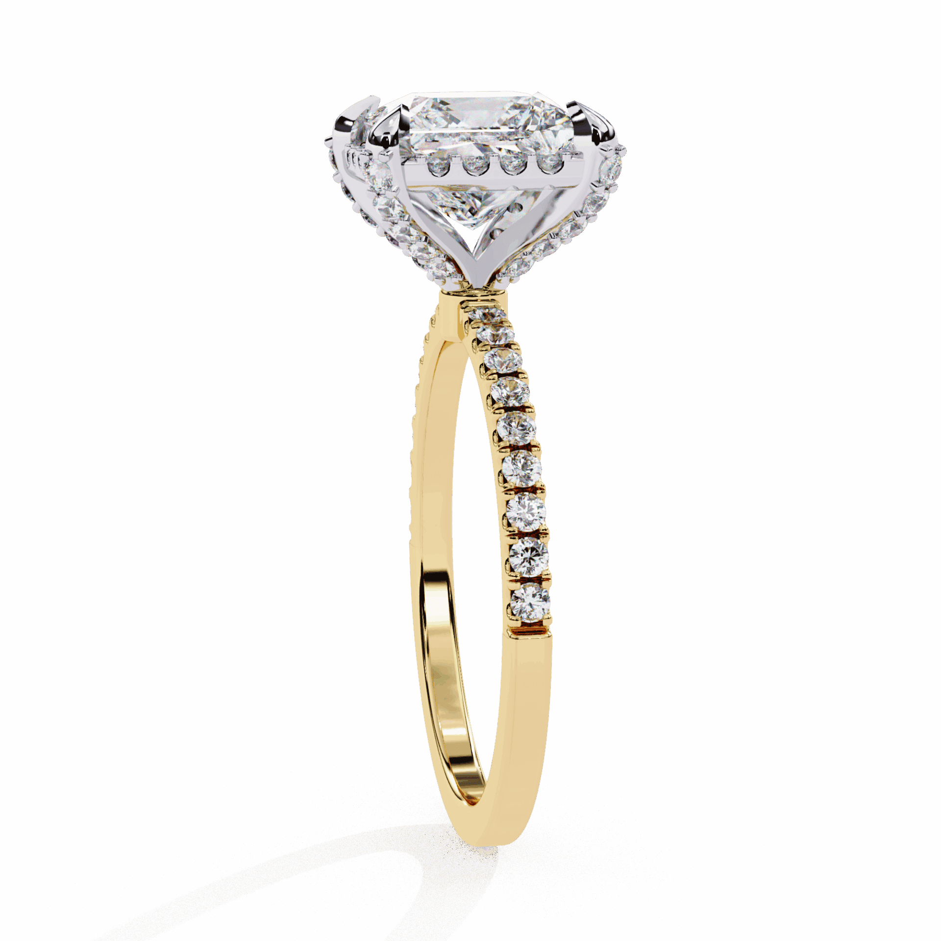 A princess-cut lab-grown diamond with 55 accent diamonds totaling 2.4 carats, including a hidden halo beneath. Angular precision with secret brilliance.