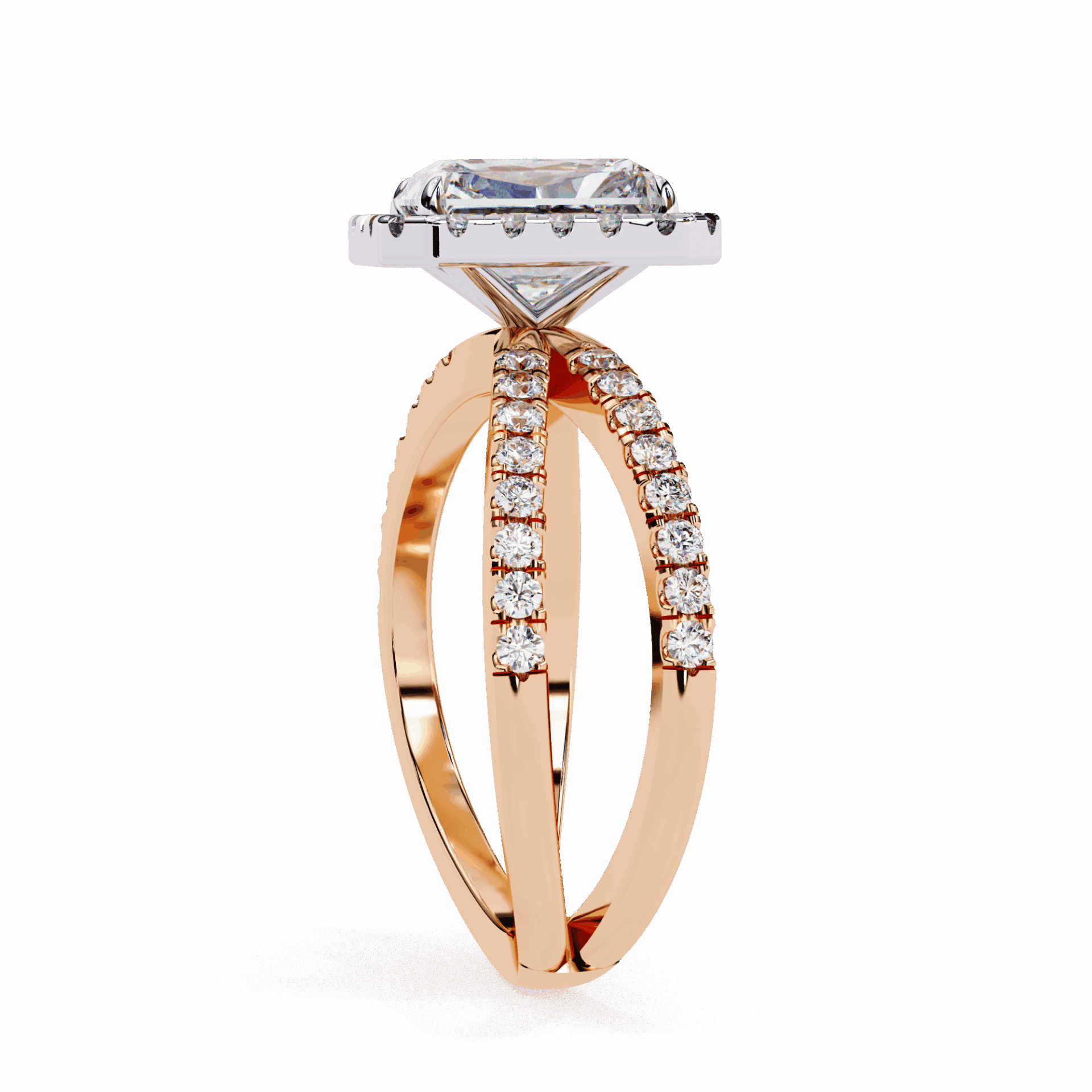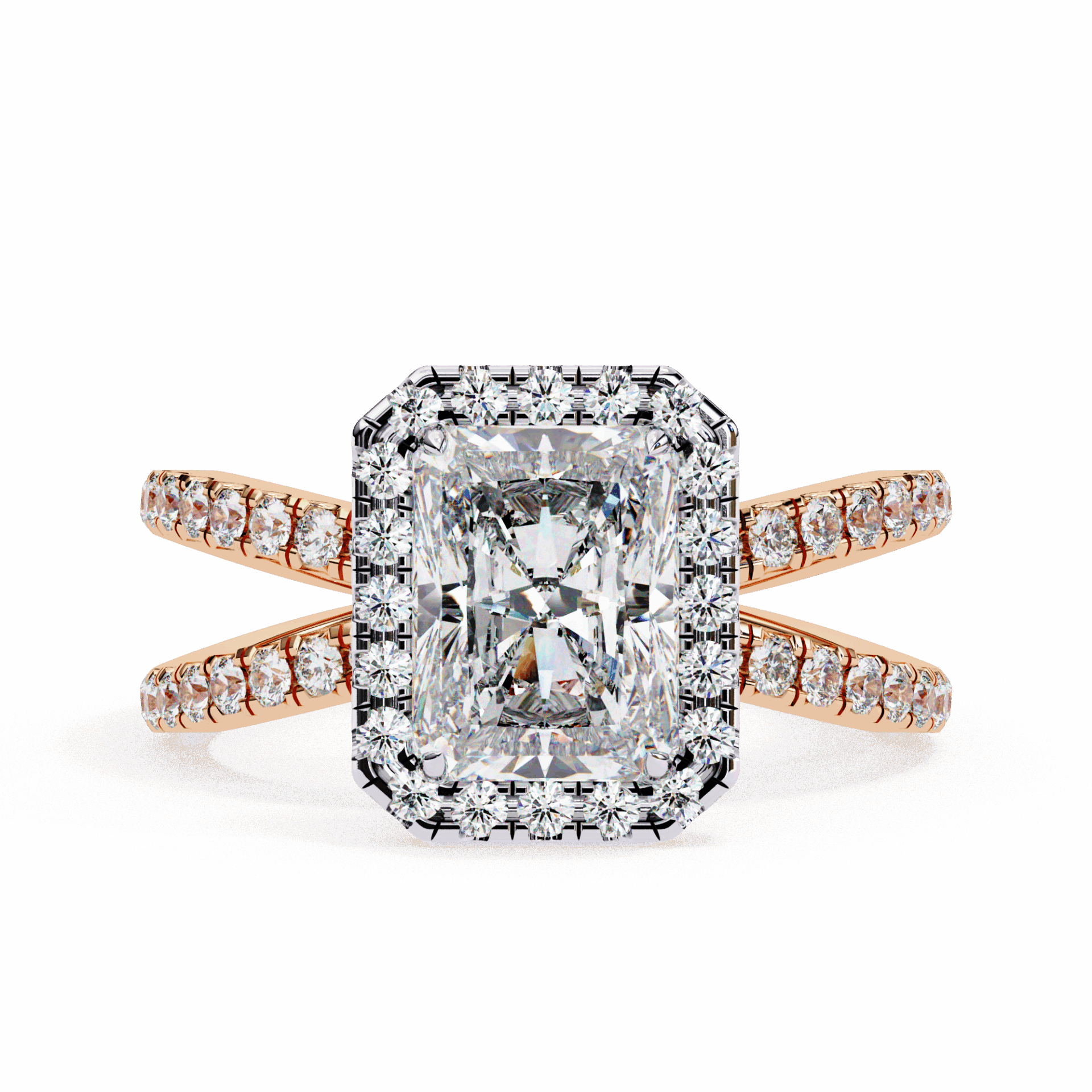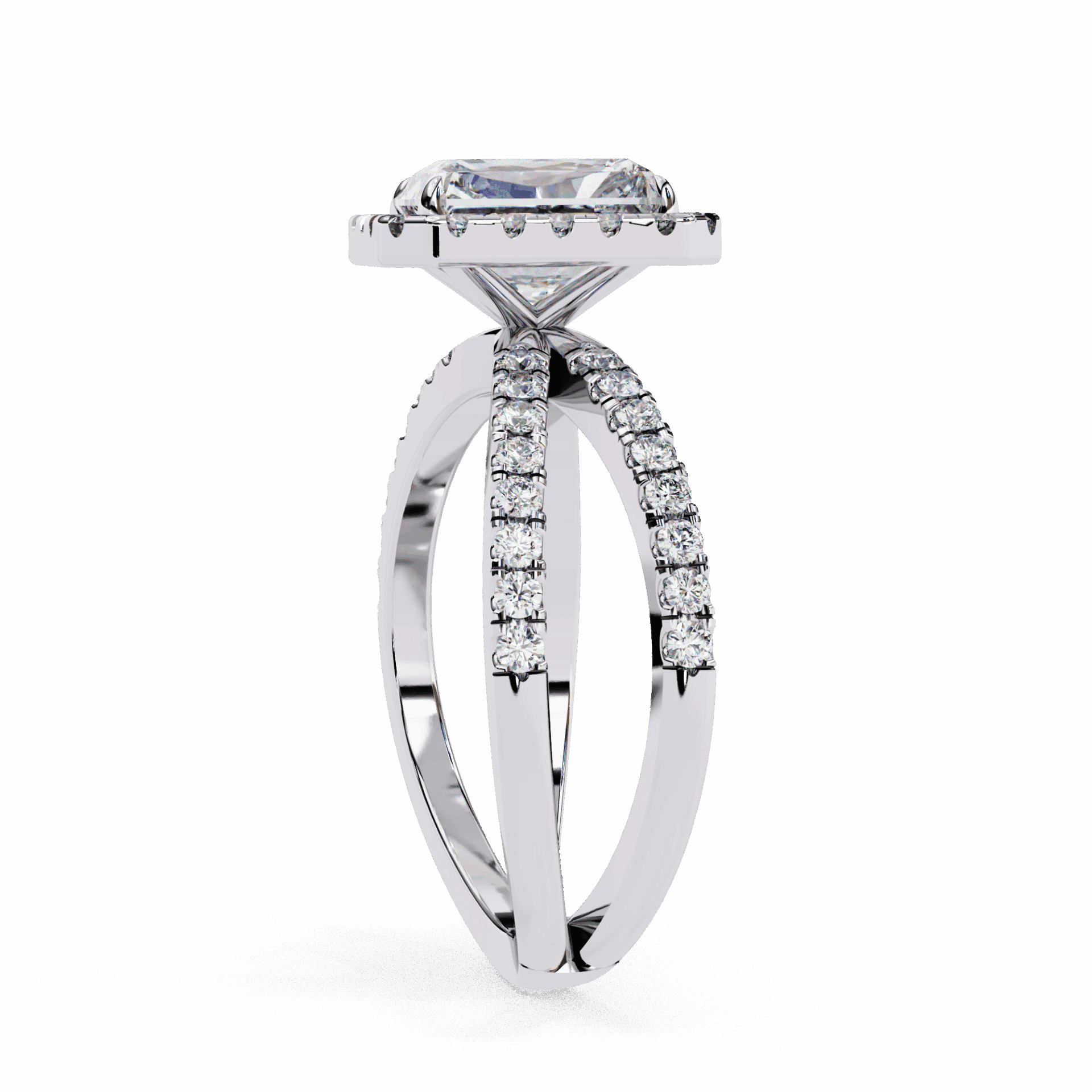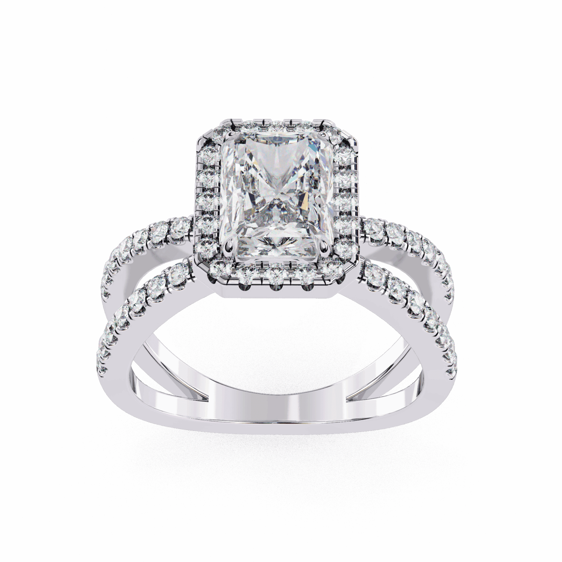A radiant-cut lab-grown diamond with 53 accent diamonds totaling 2.46 carats. Rectangular geometry in our refined Signature setting.