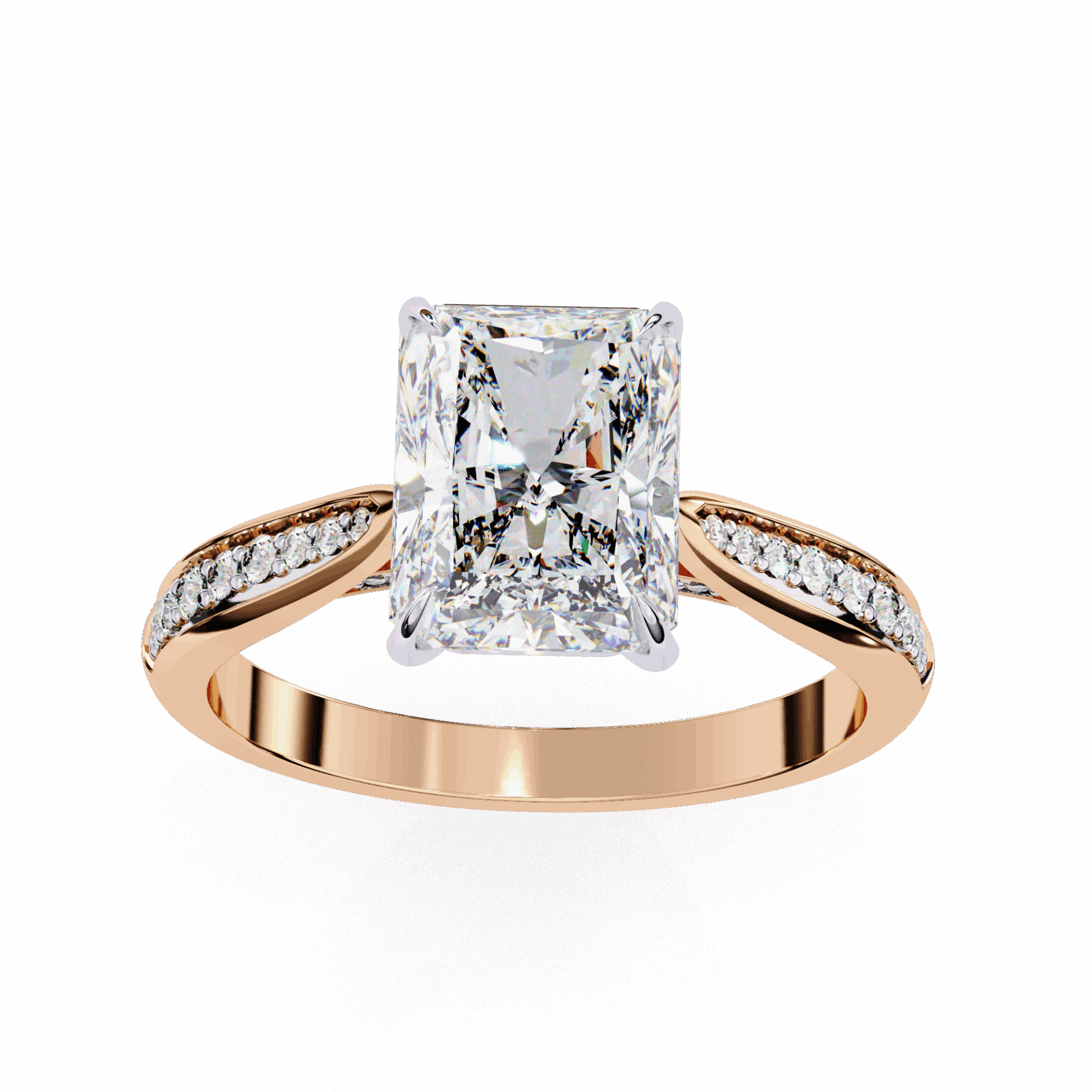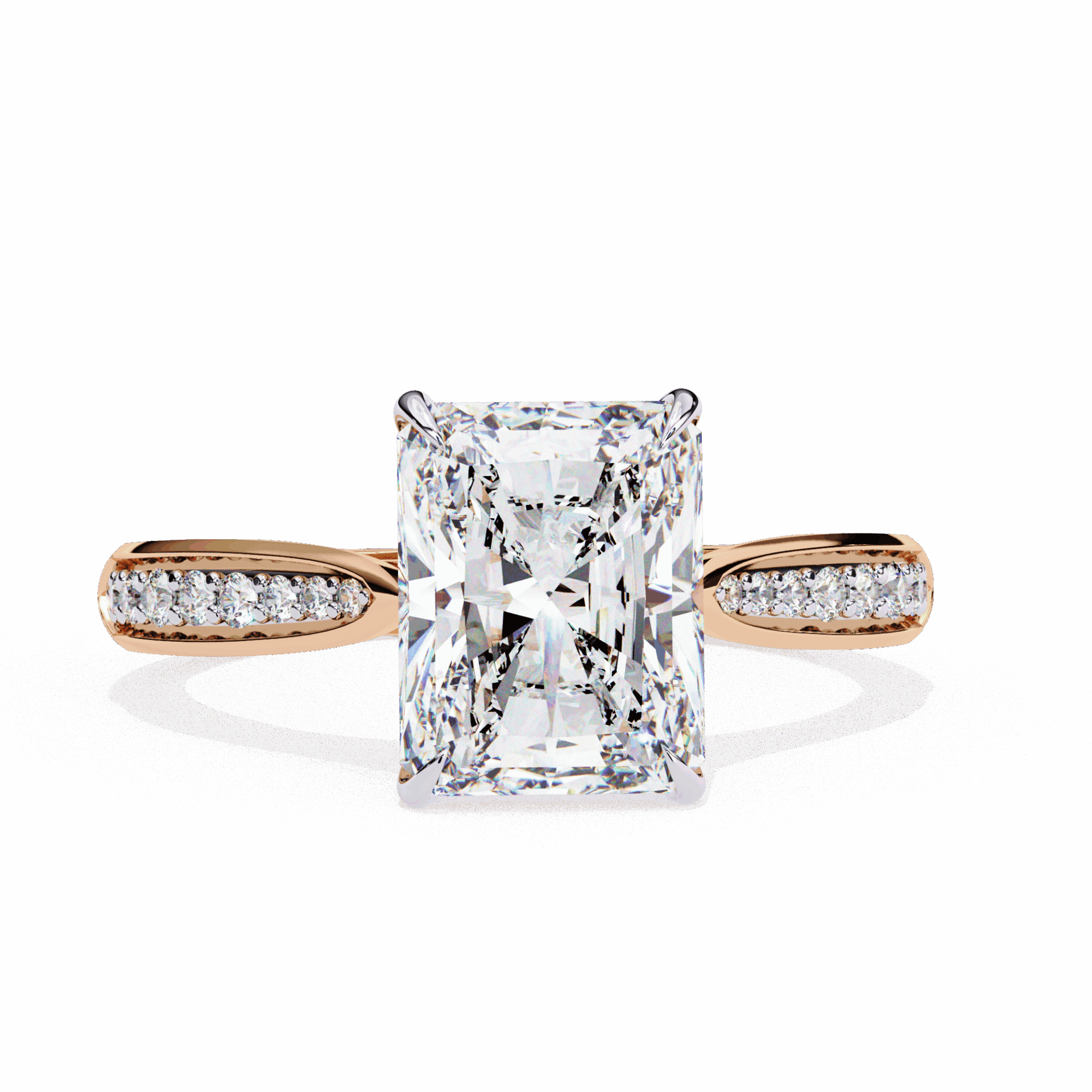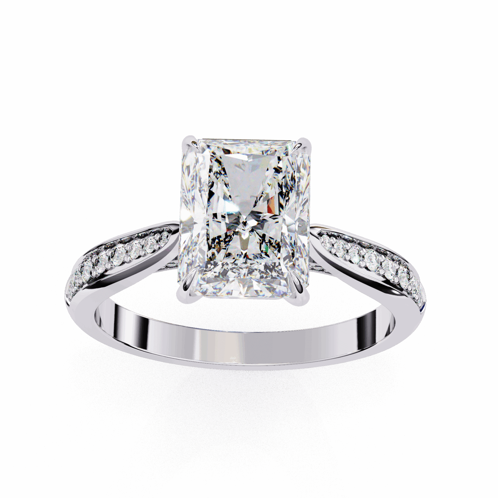 A radiant-cut lab-grown diamond with 35 accent diamonds totaling 2.62 carats. Rectangular brilliance in the True Love setting.