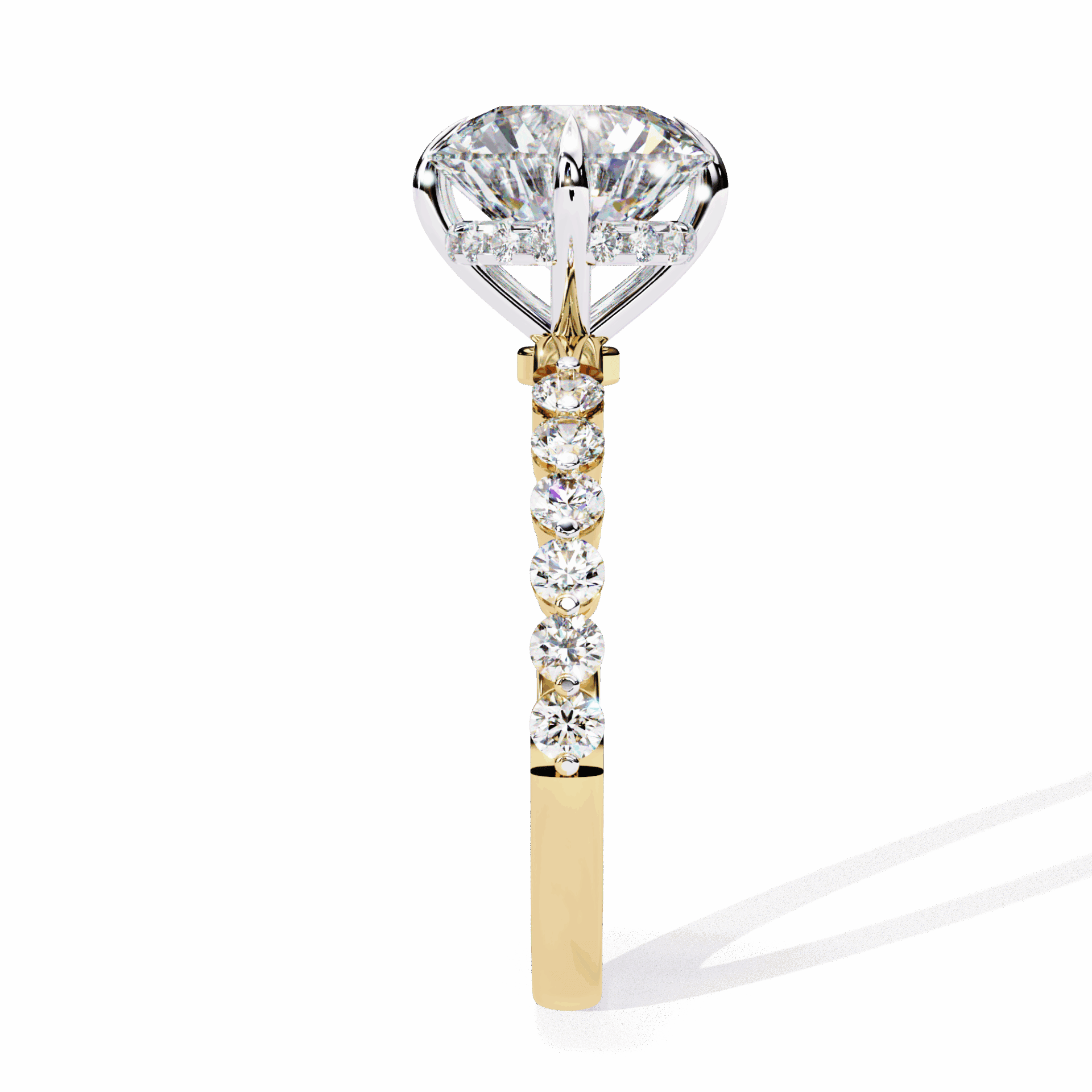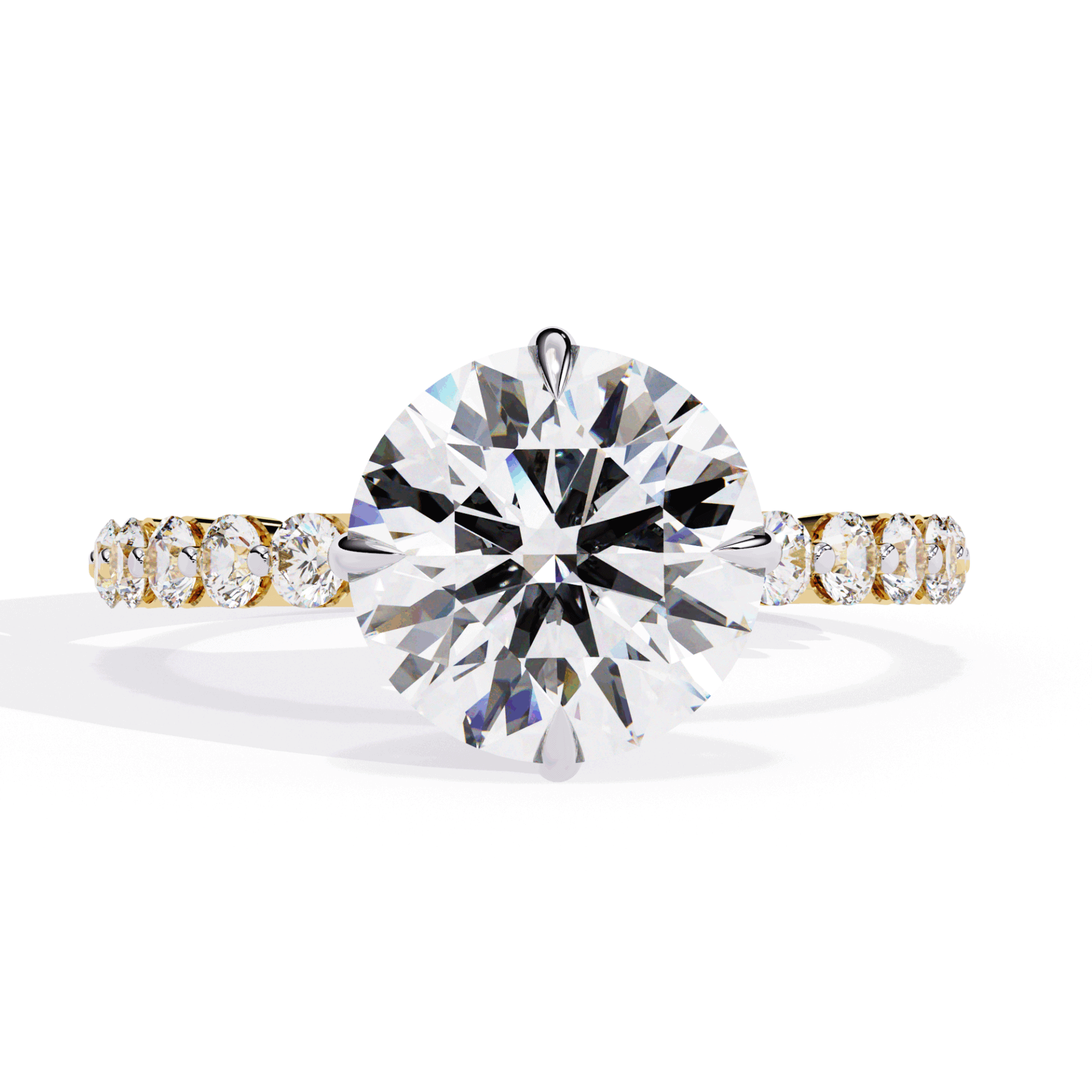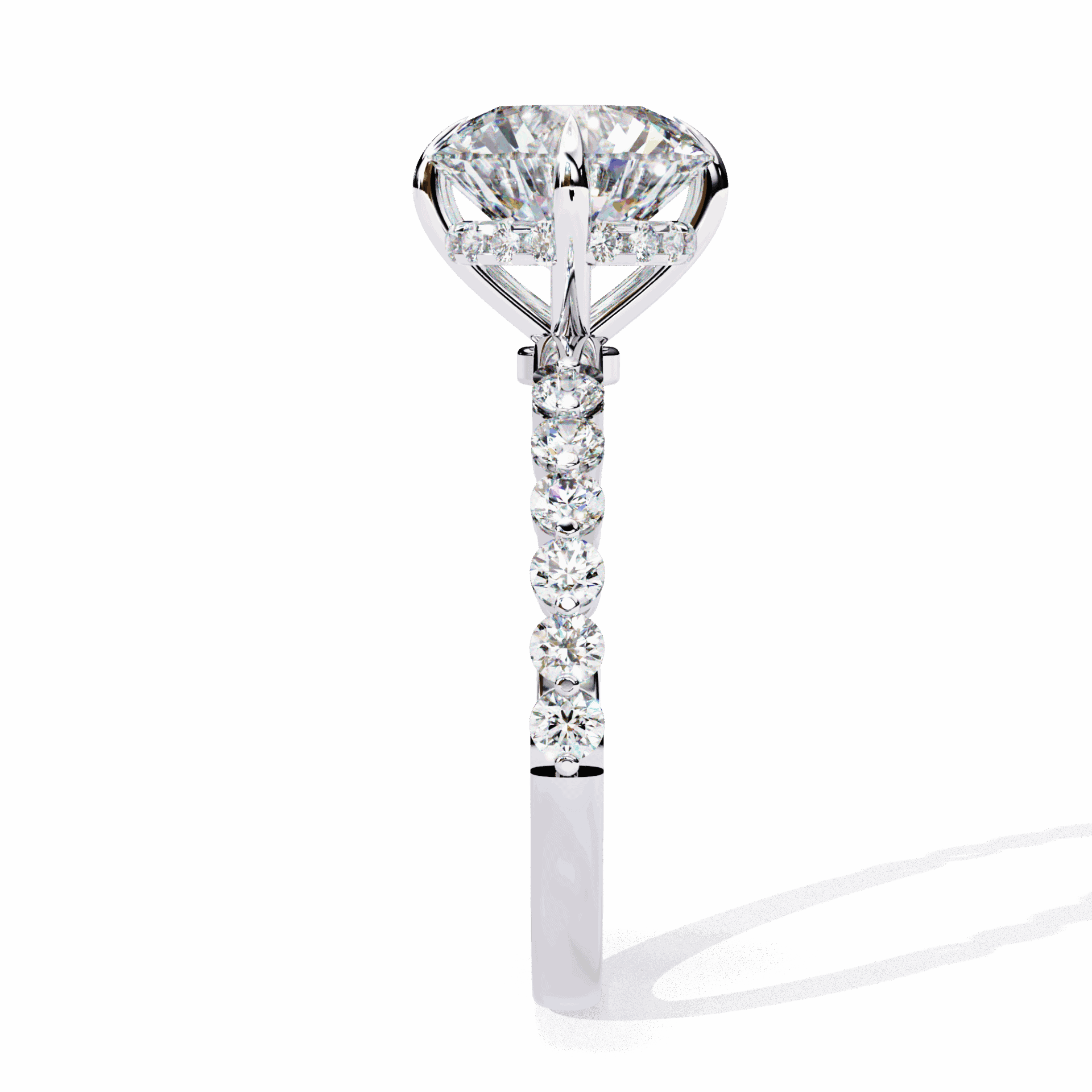 A round lab-grown diamond surrounded by 29 halo accent diamonds totaling 2.39 carats. Classic round with halo amplification.