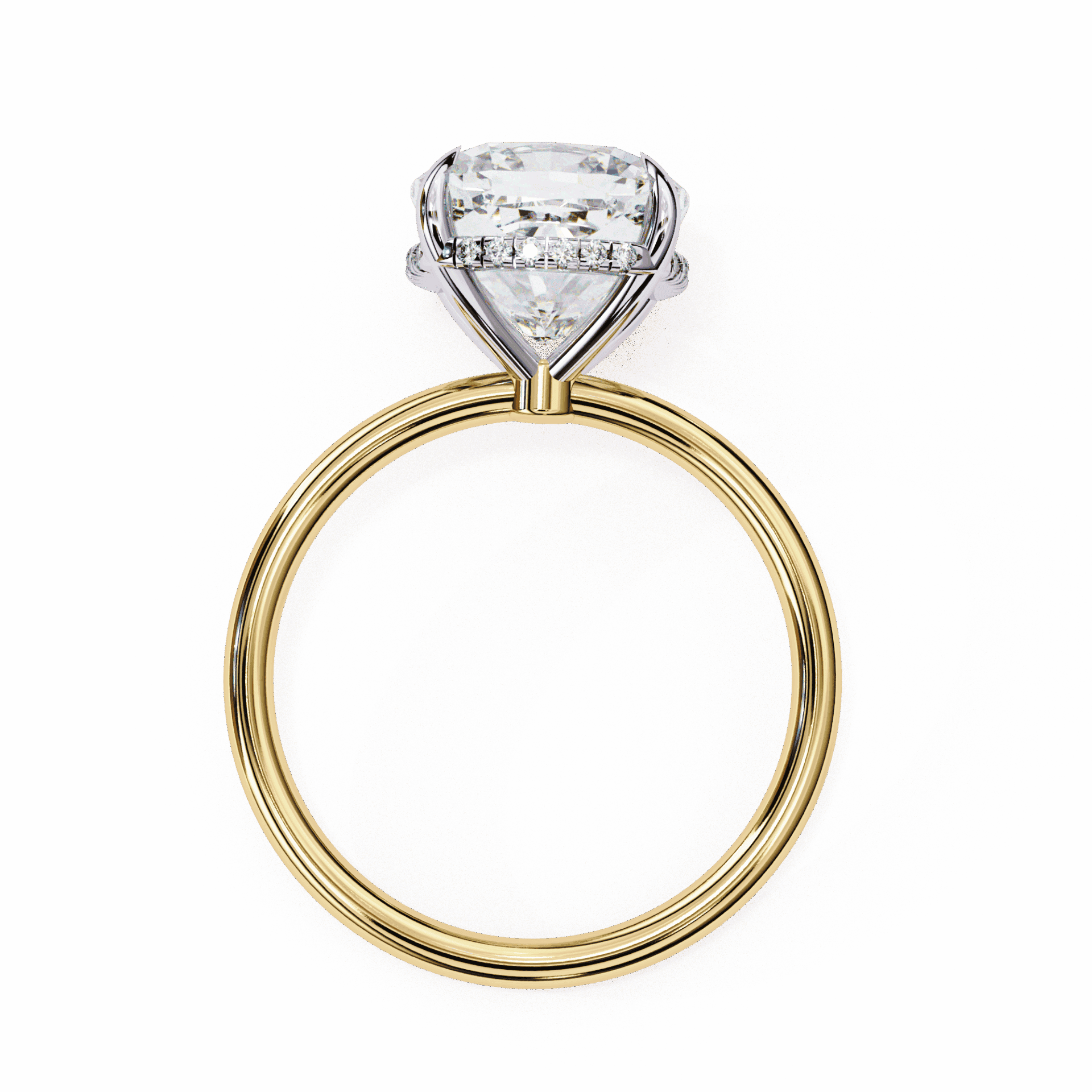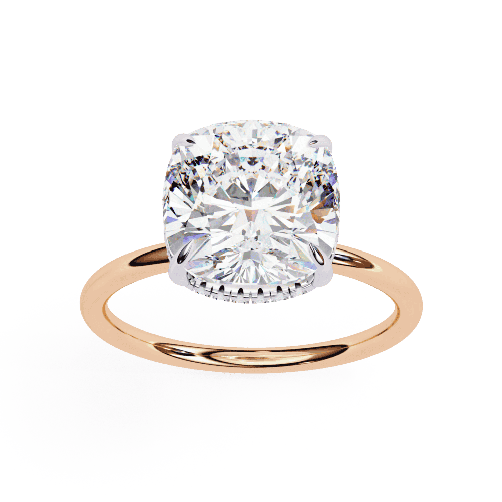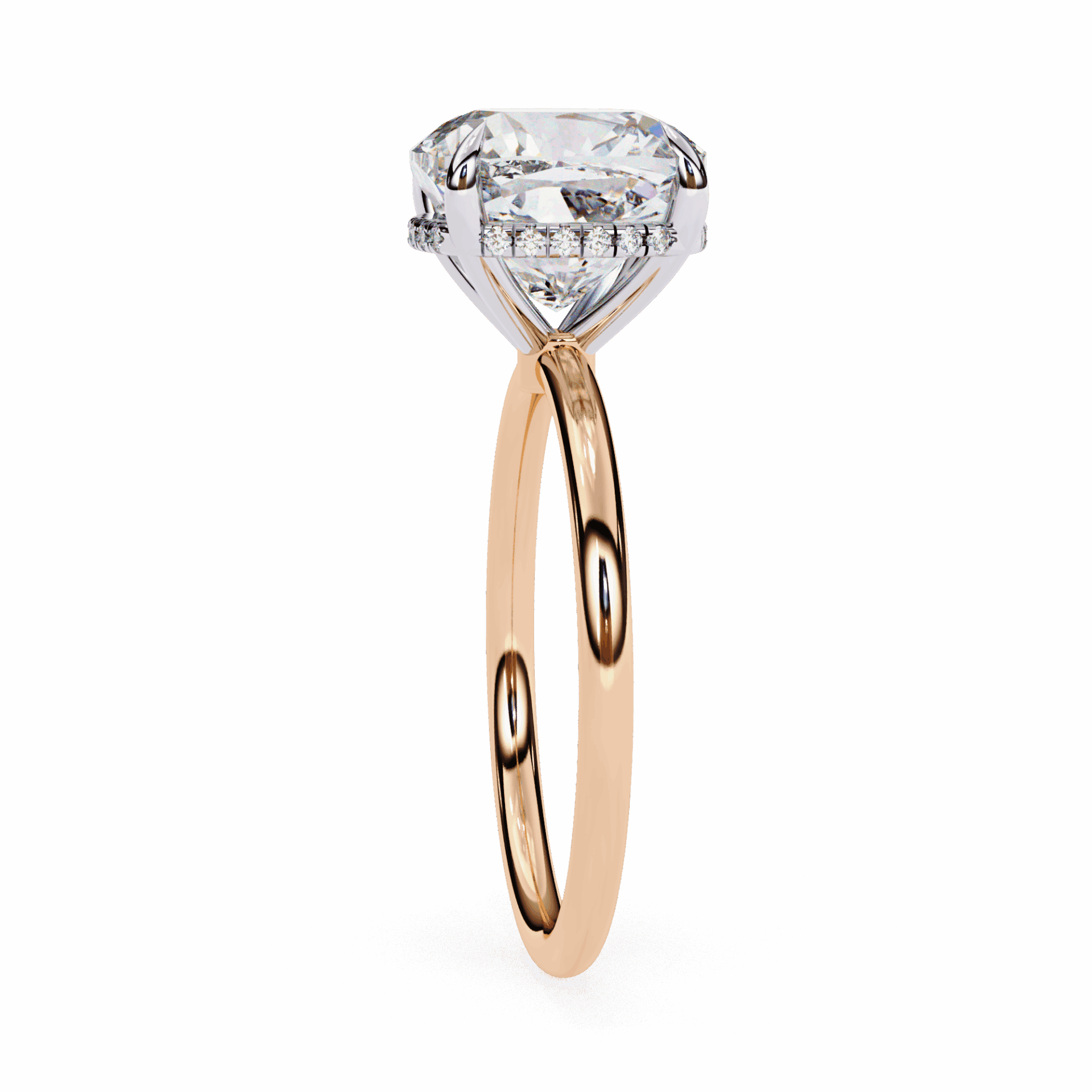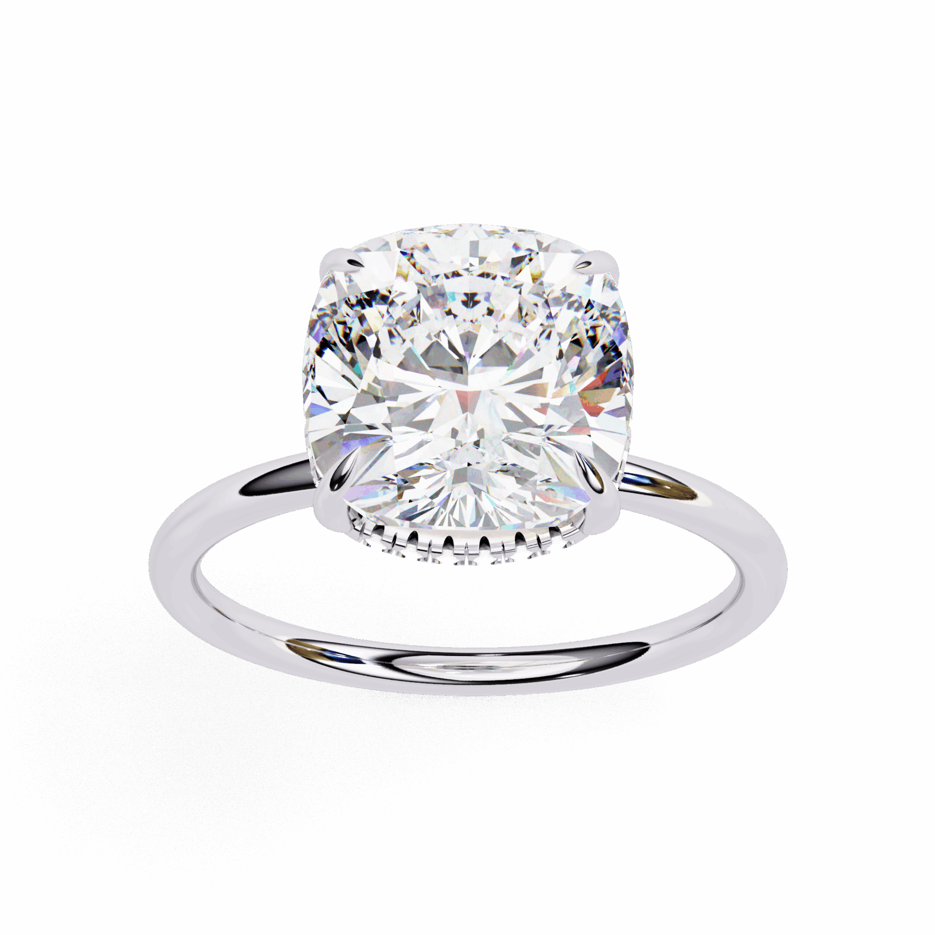 A cushion-cut lab-grown diamond with 25 accent diamonds totaling 2.82 carats. Vintage romantic glow in the Eternal Solitaire setting.