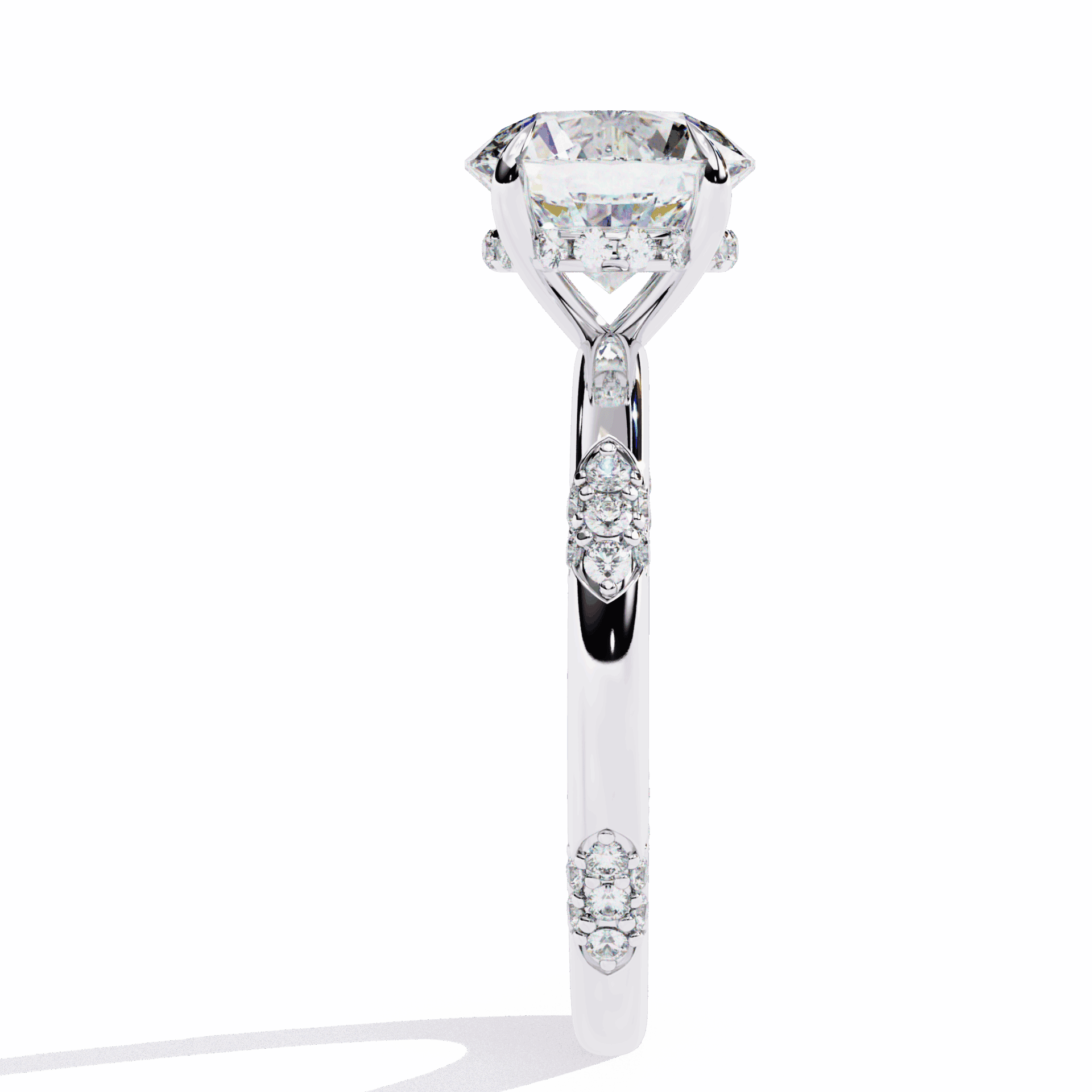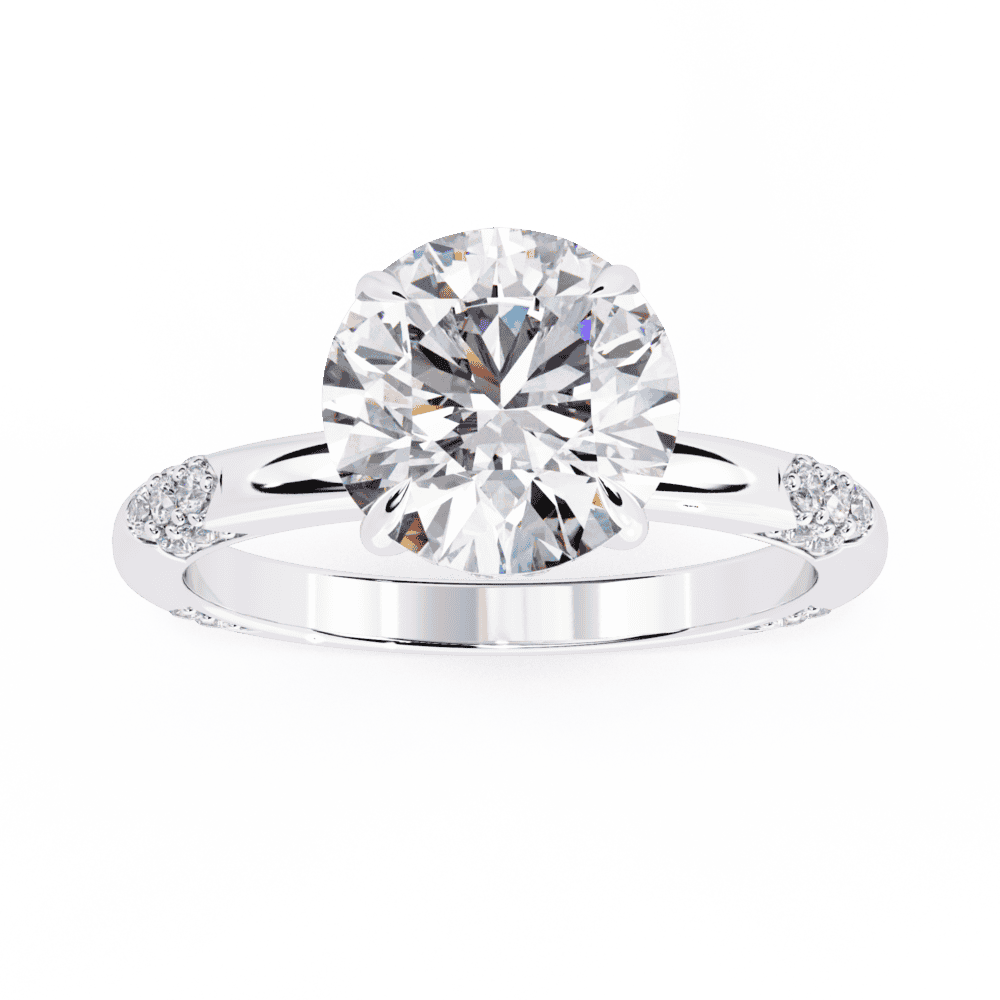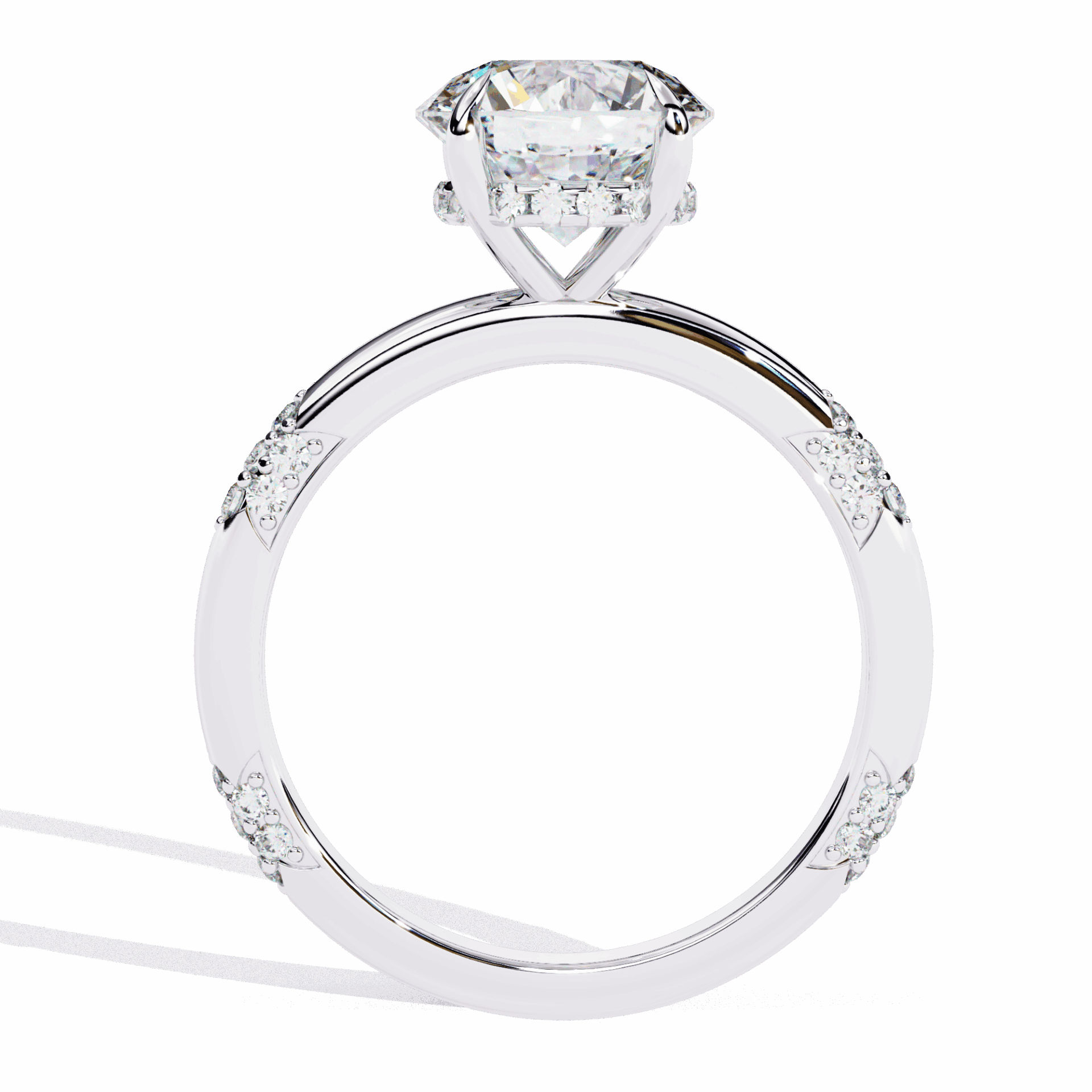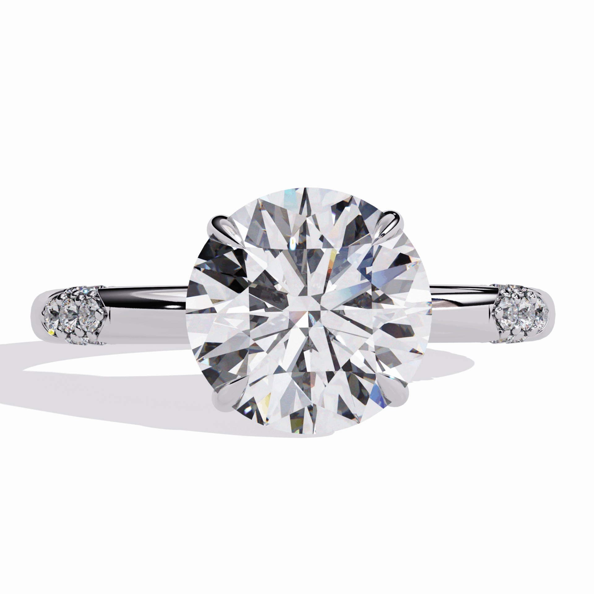 A round lab-grown diamond surrounded by 45 halo accent diamonds totaling 2.85 carats. The halo amplifies the round’s natural brilliance.